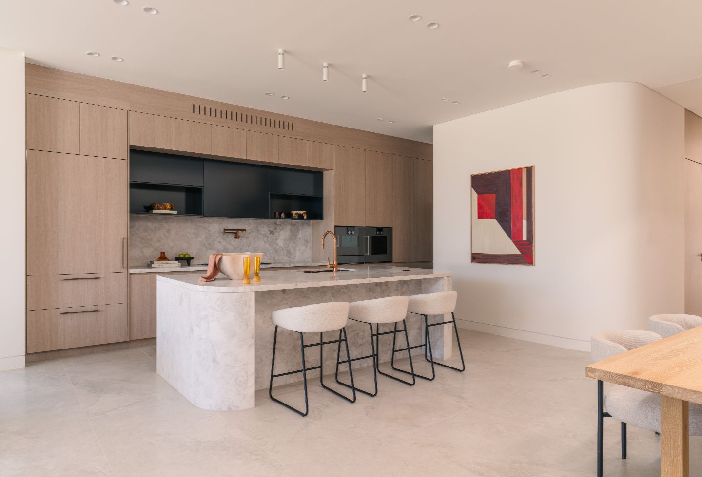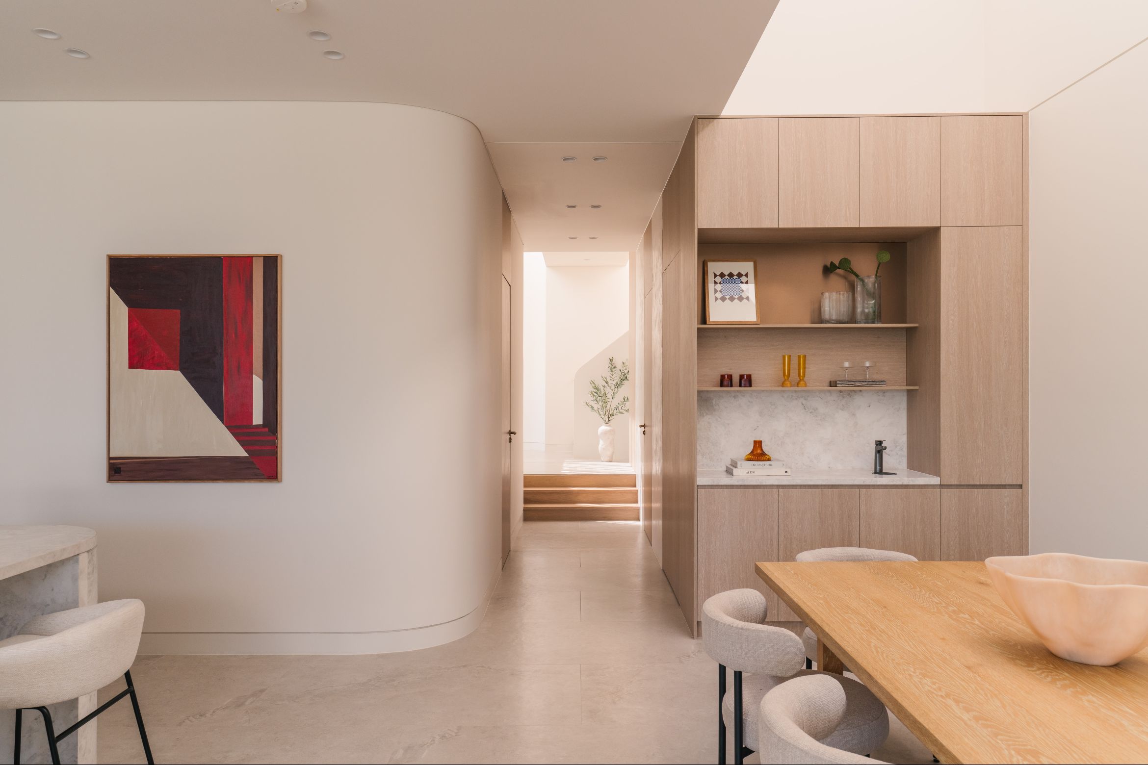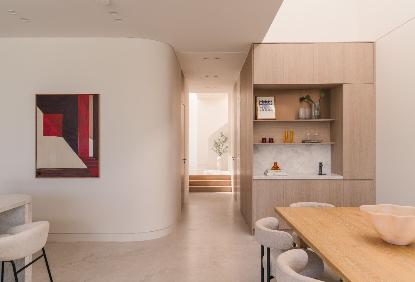 Quality is the hallmark, with natural timber accents throughout. Sculptural restraint is demonstrated in curved architectural elements including arches and the central staircase. These introduce softness and an organic identity without becoming theatrical.