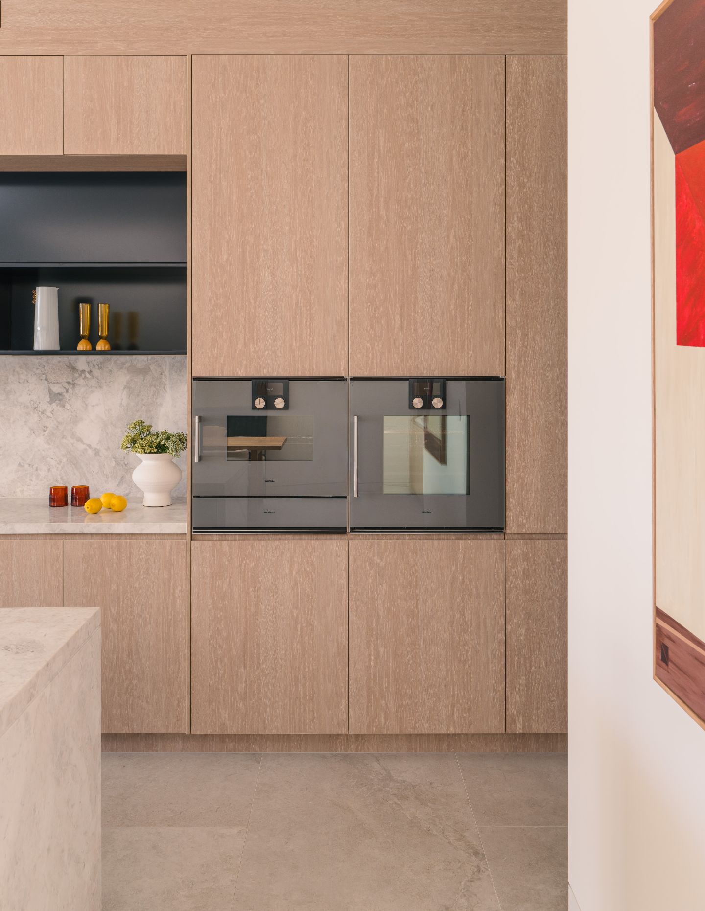 Skylights and lightwells throughout the home, including in the two master suite ensuites, upper-level living area and the butler’s pantry, bring brightness, an expansive verticality and glimpses of sky into these spaces.