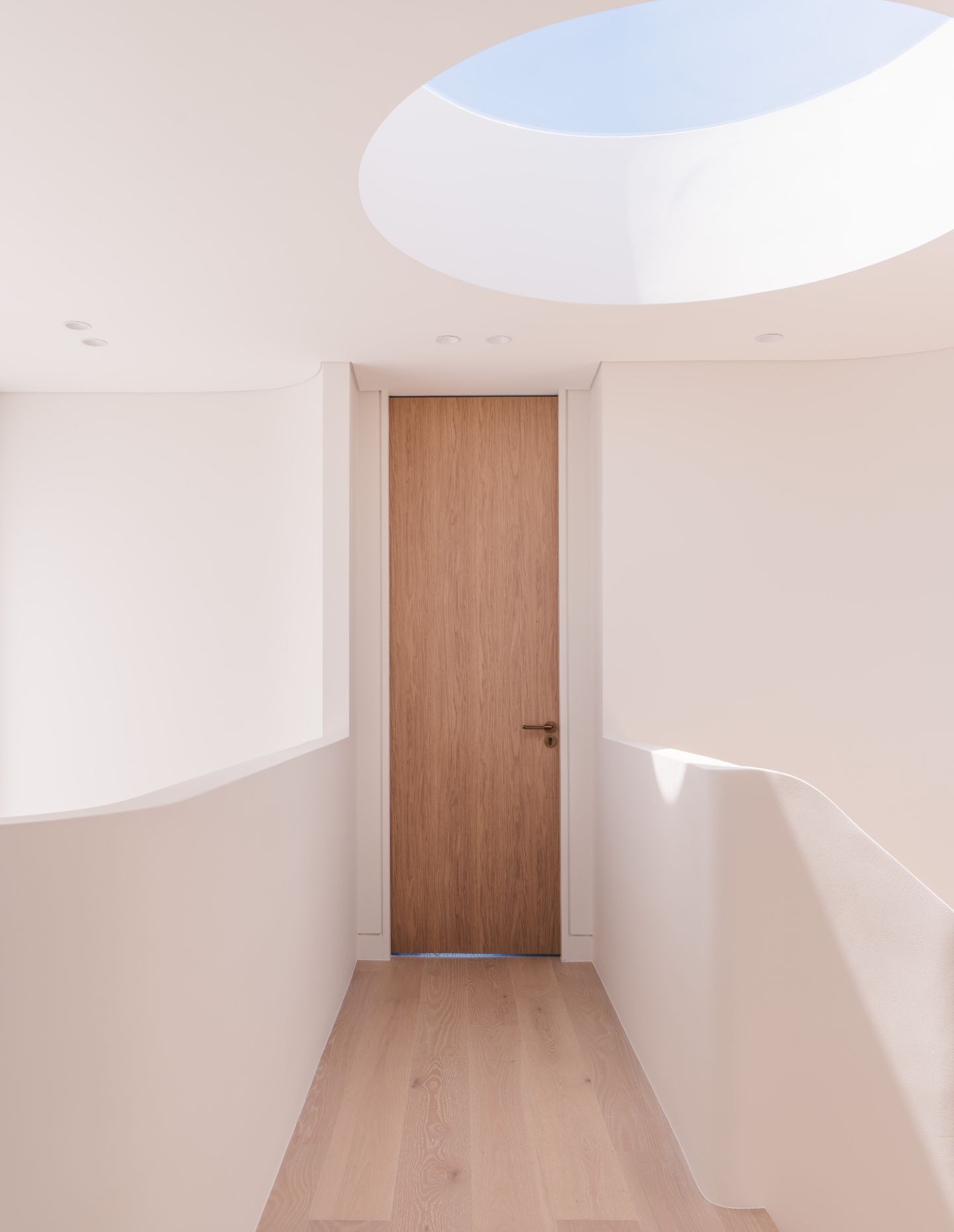 The four-bedroom, four-bathroom homes are oriented around a distinctive, organic stairwell suffused with illumination from a circular oculus above. This ever-changing sky picture is a central visual point of reference, while the high ceilings and double-height voids and stair volumes also draw the eye upwards and give a feeling on openness and connection to the sky.