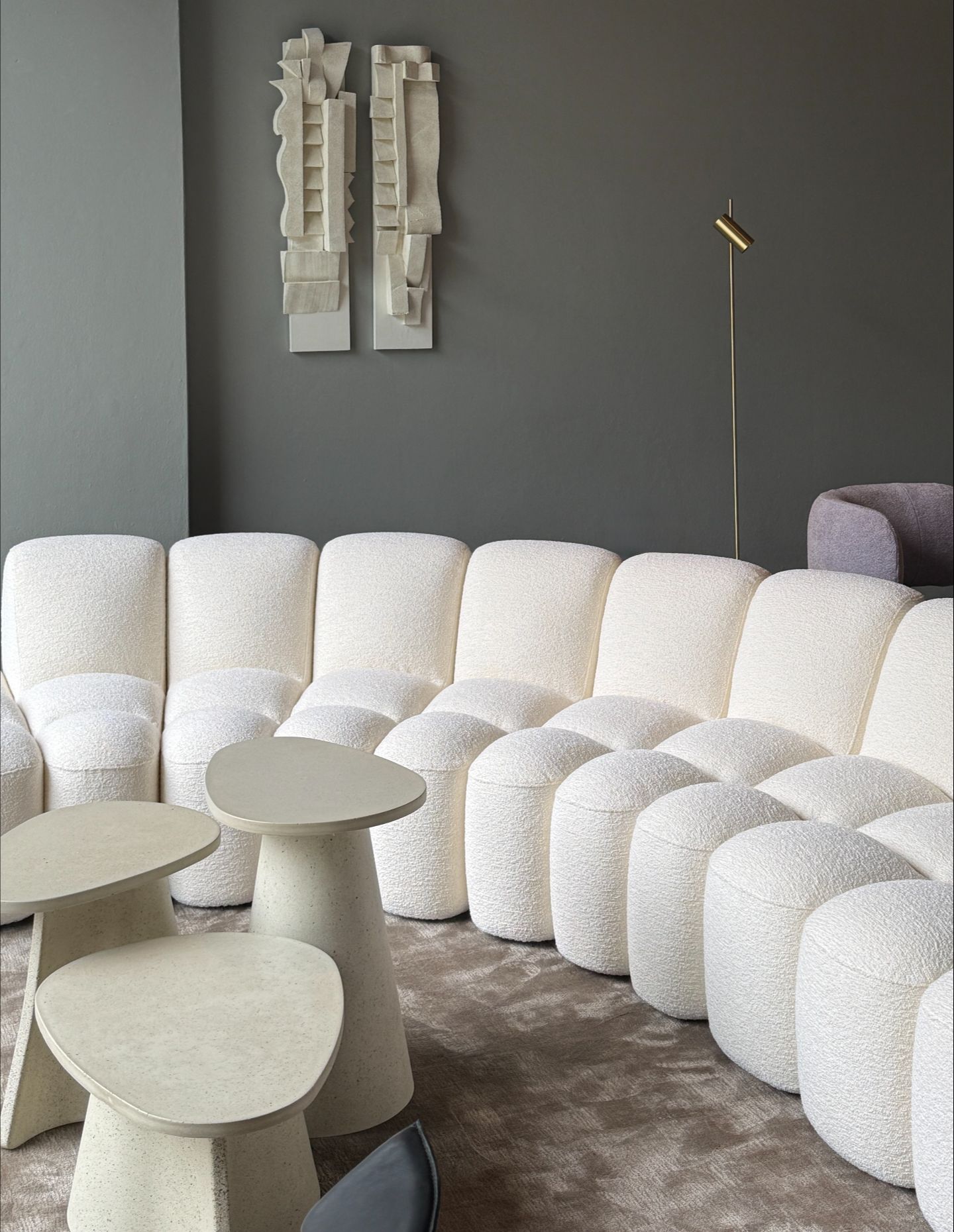 If MDF Italia establishes the architectural framework of the showroom, Saba Italia introduces a more emotionally driven dimension. Founded near Padua in 1987, the company has developed a reputation for modular seating systems characterised by softness, flexibility and a strong relationship with textiles.