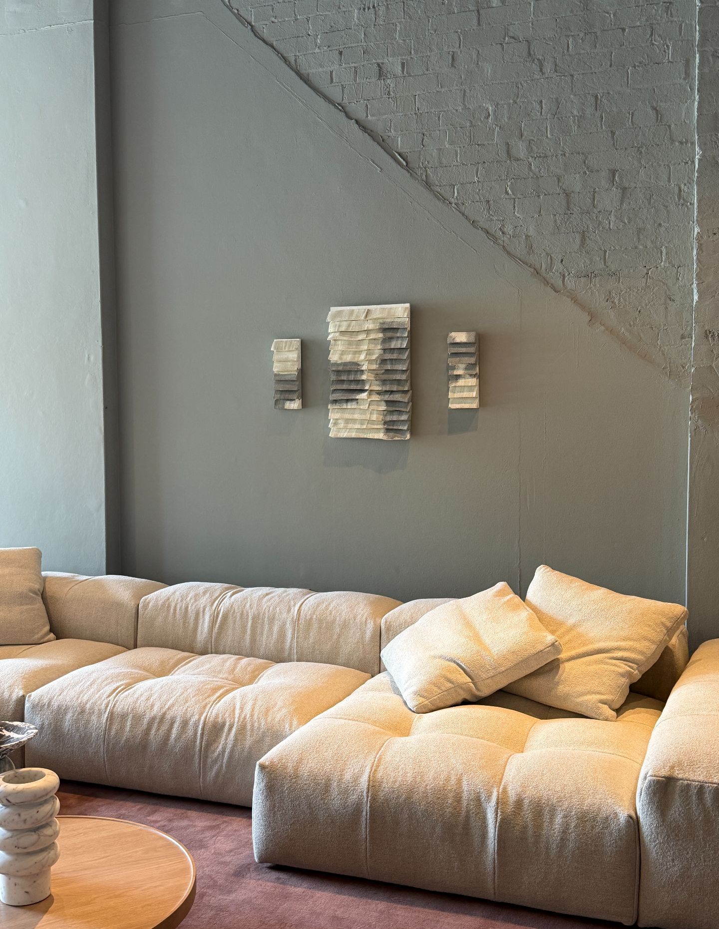 Sustainability is also shaping the brand’s research. One of the most technically ambitious pieces displayed in the Bachli showroom is the Array Sofa, developed in collaboration with Norwegian architecture studio Snøhetta. The modular system rethinks the structure of upholstered seating, using injection-moulded components designed to maximise internal air while maintaining strength, reducing the amount of raw material required.