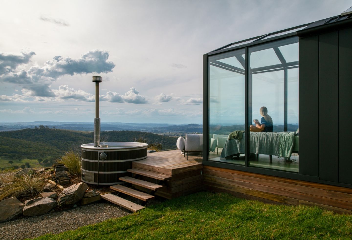 We’ve all seen those Instagram images of secluded cabins with stargazing views and hot tub indulgence in regional Australia. Oakhill Glasshouse Estate is one such offering, and it’s most attractive feature is quite simply the location. It’s a short drive from Bathurst but one that goes way up a hill in a secluded valley. Inside, full-height glazing ensures visual access to the sun and stars.