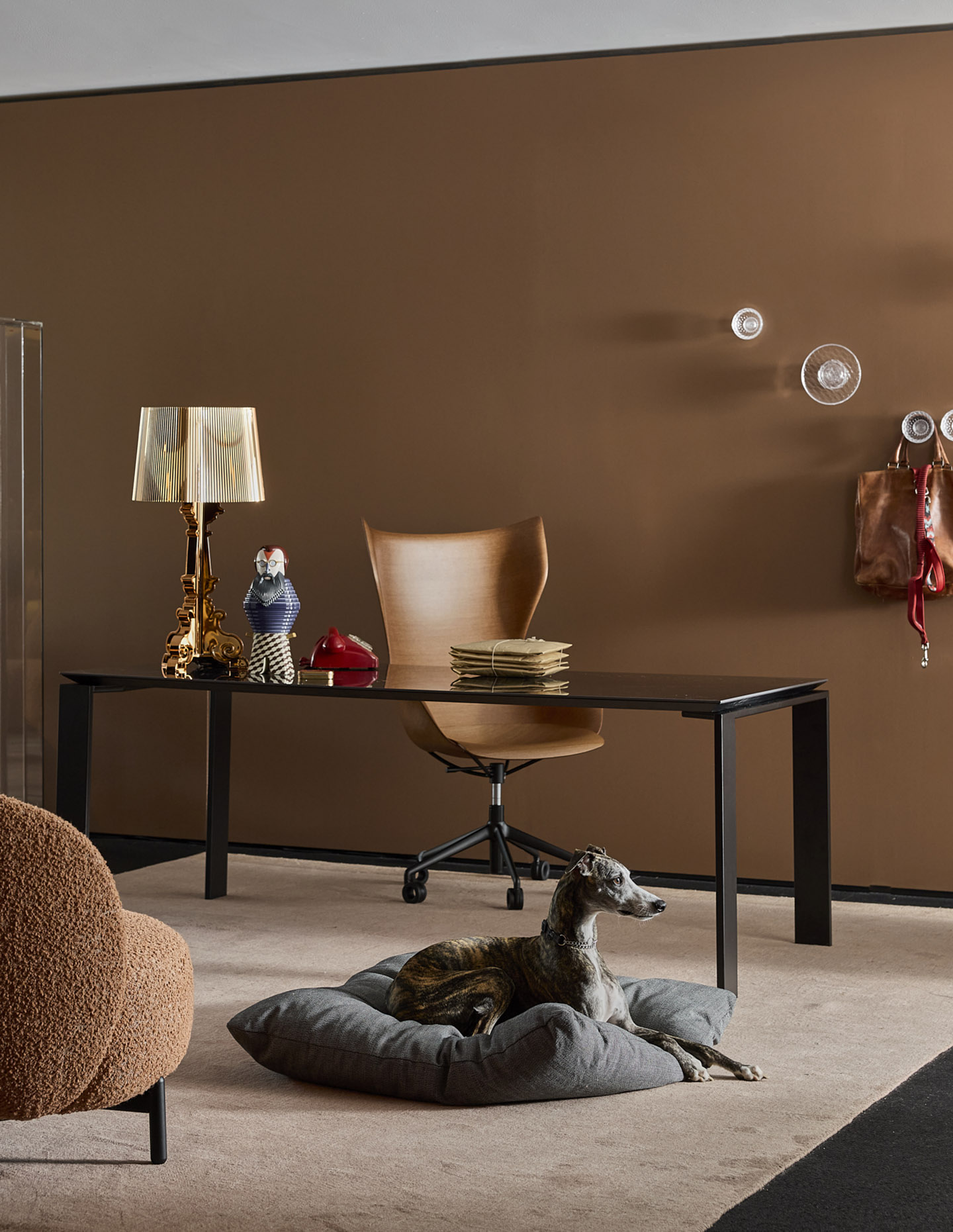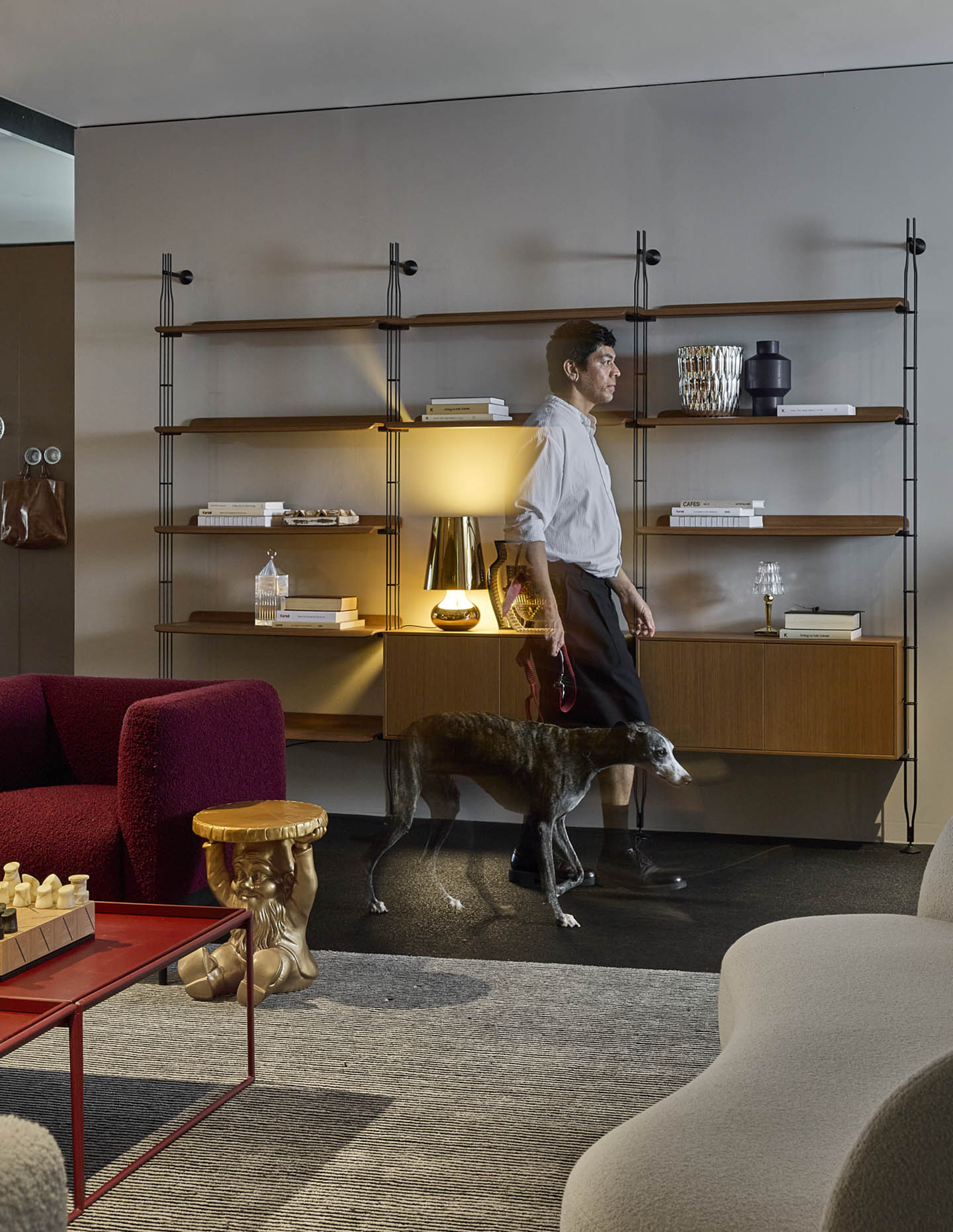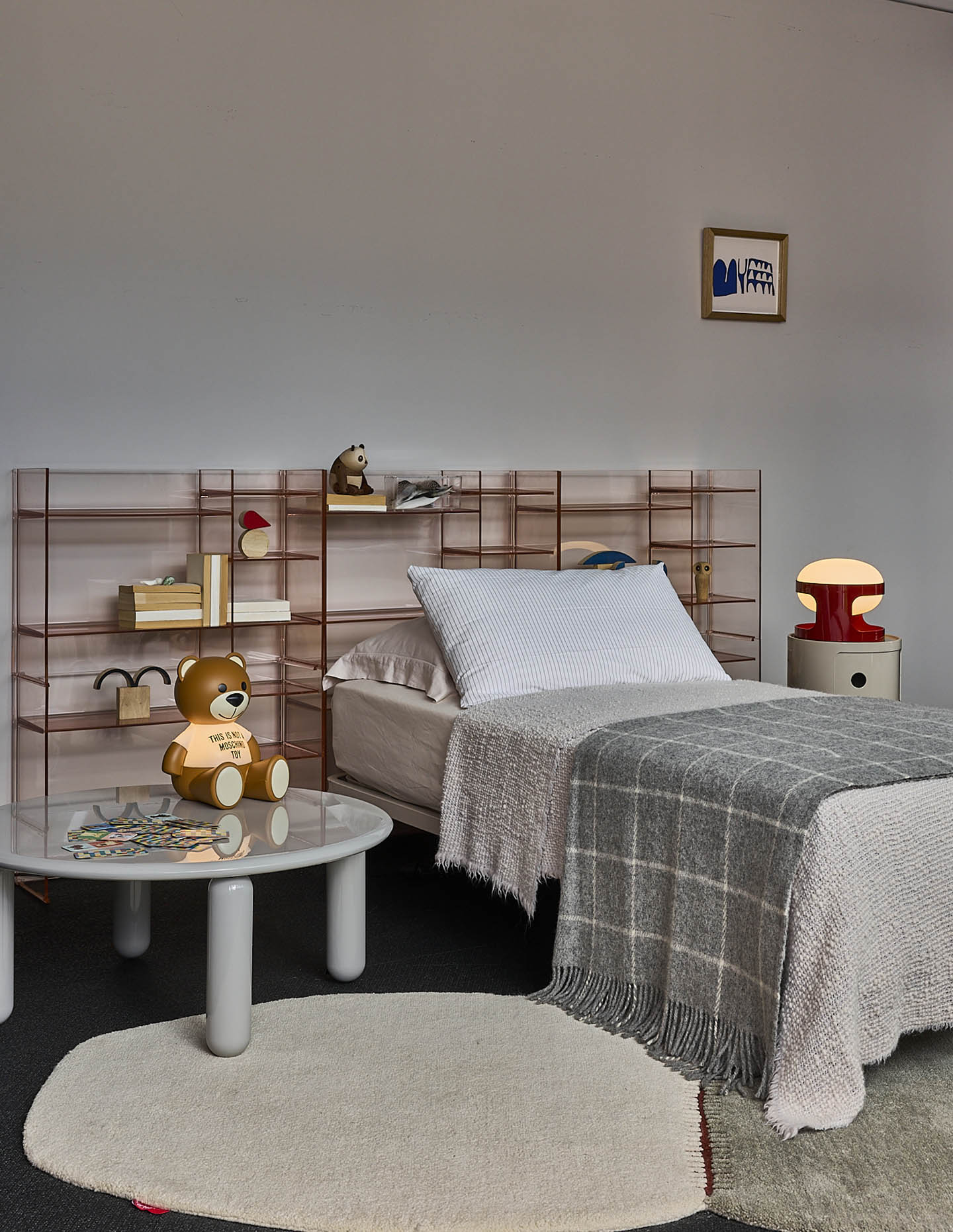 For the first time, the concept extends decisively into the night-time realm. The master suite is conceived as a retreat, while children’s rooms integrate enduring icons such as Componibili by Anna Castelli Ferrieri and Mobil by Antonio Citterio into everyday domestic life. A study featuring Ferruccio Laviani’s Four Table reflects contemporary working patterns, and Kartell Laufen solutions bring architectural cohesion to the bathroom.