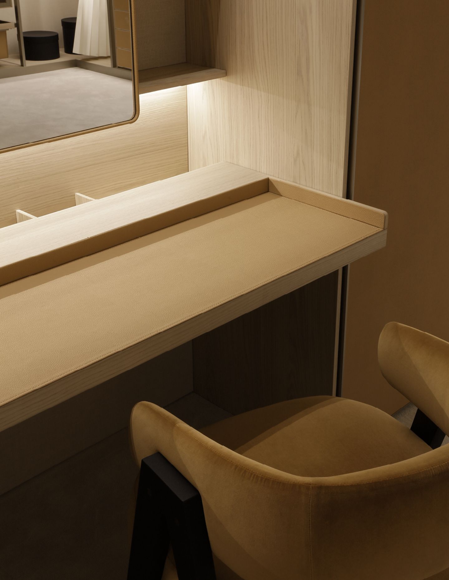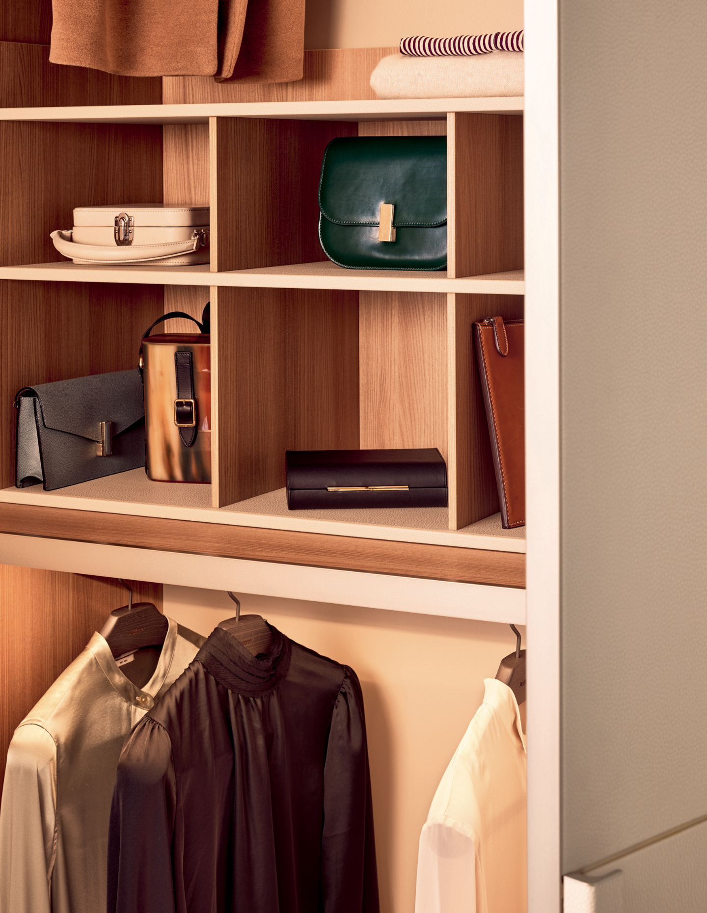 In this context, the wardrobe becomes its own expression of wellness. It’s a space designed to slow the pace of the day, where order and organisation replace distraction. Just as a finely tailored jacket requires proper hanging, or leather shoes benefit from careful spacing and airflow – Poliform wardrobes are designed to protect and enhance what they contain. Organisation is expressed through refined design, allowing garments to be easily seen, reached and returned to their place. For those with a collection of adored clothes, jewellery and accessories, this sense of order is essential.