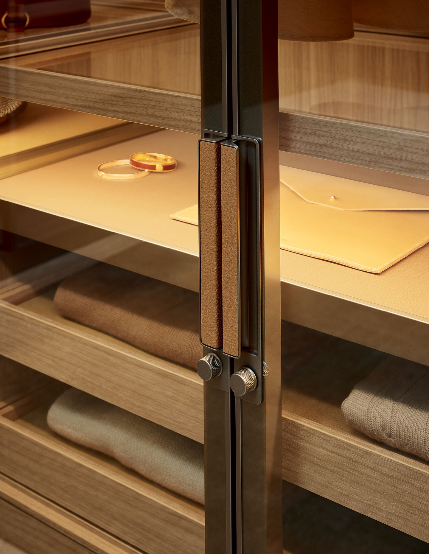 Material selection plays a defining role across all of the systems. Finishes range from subdued matte lacquers to timber veneers and reflective glass, each chosen to sit comfortably within contemporary Australian interiors. Integrated, recessed interior lighting brings clarity without glare, allowing colours and textures to register softly. These decisions speak to Poliform’s broader design philosophy, where luxury is communicated through balance and control rather than excess.