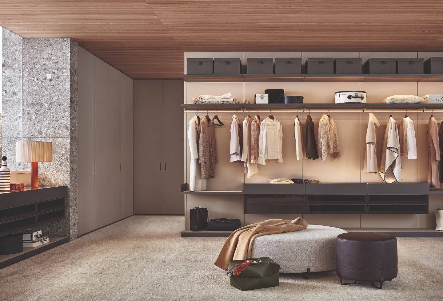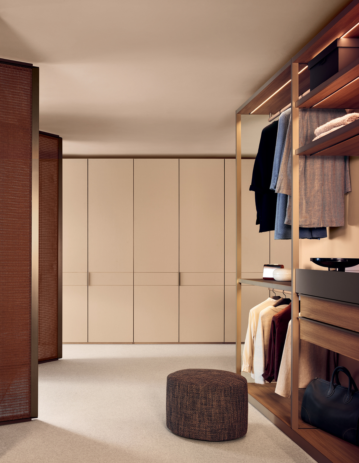 Poliform’s Cover Wardrobe, by contrast, leans into architectural expression. Full-height panels slide to conceal or expose the joinery elements, creating moments of reveal that shift the mood of a room without altering its footprint.