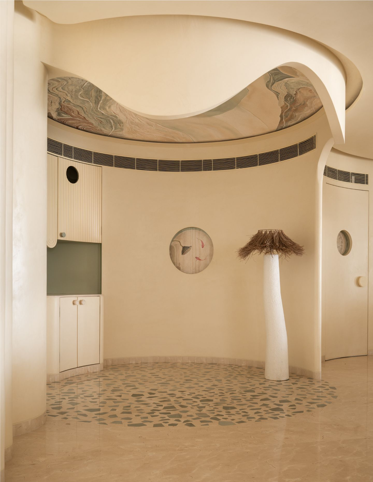 MuseLAB’s Soft Serve transforms a high-rise apartment in Thane, India into a calm, pastel-toned retreat. Drawing on the Japanese concept of Seijaku, the interiors use a disciplined palette of ecru, sage, taupe and blush layered with stone, concrete and timber veneer. The muted colour language creates a sense of quiet luxury, pairing serenity with playful material expression.