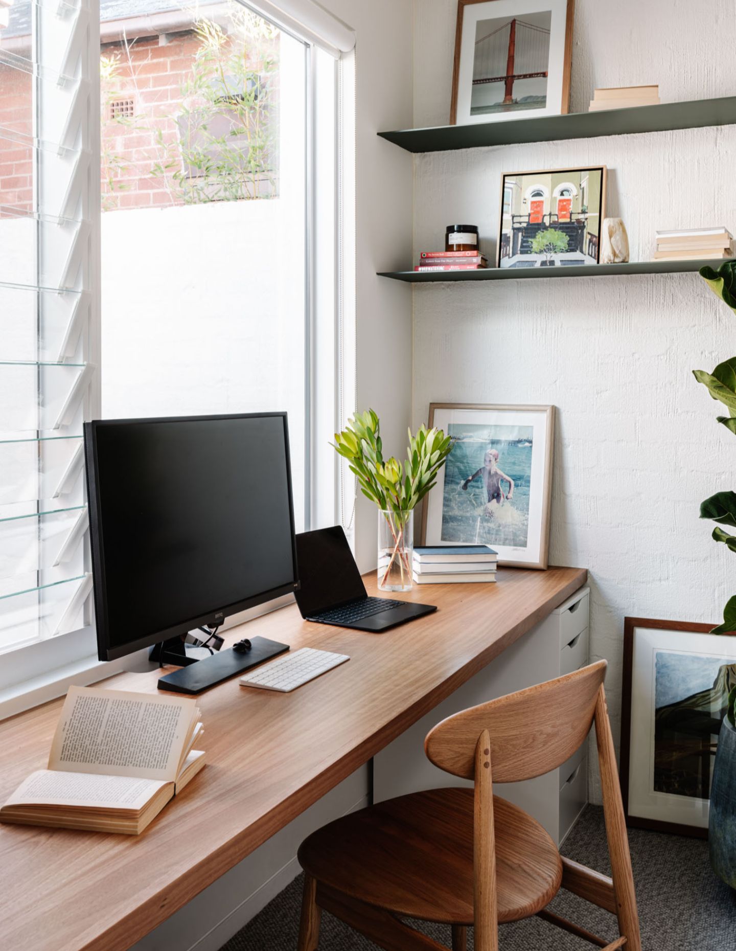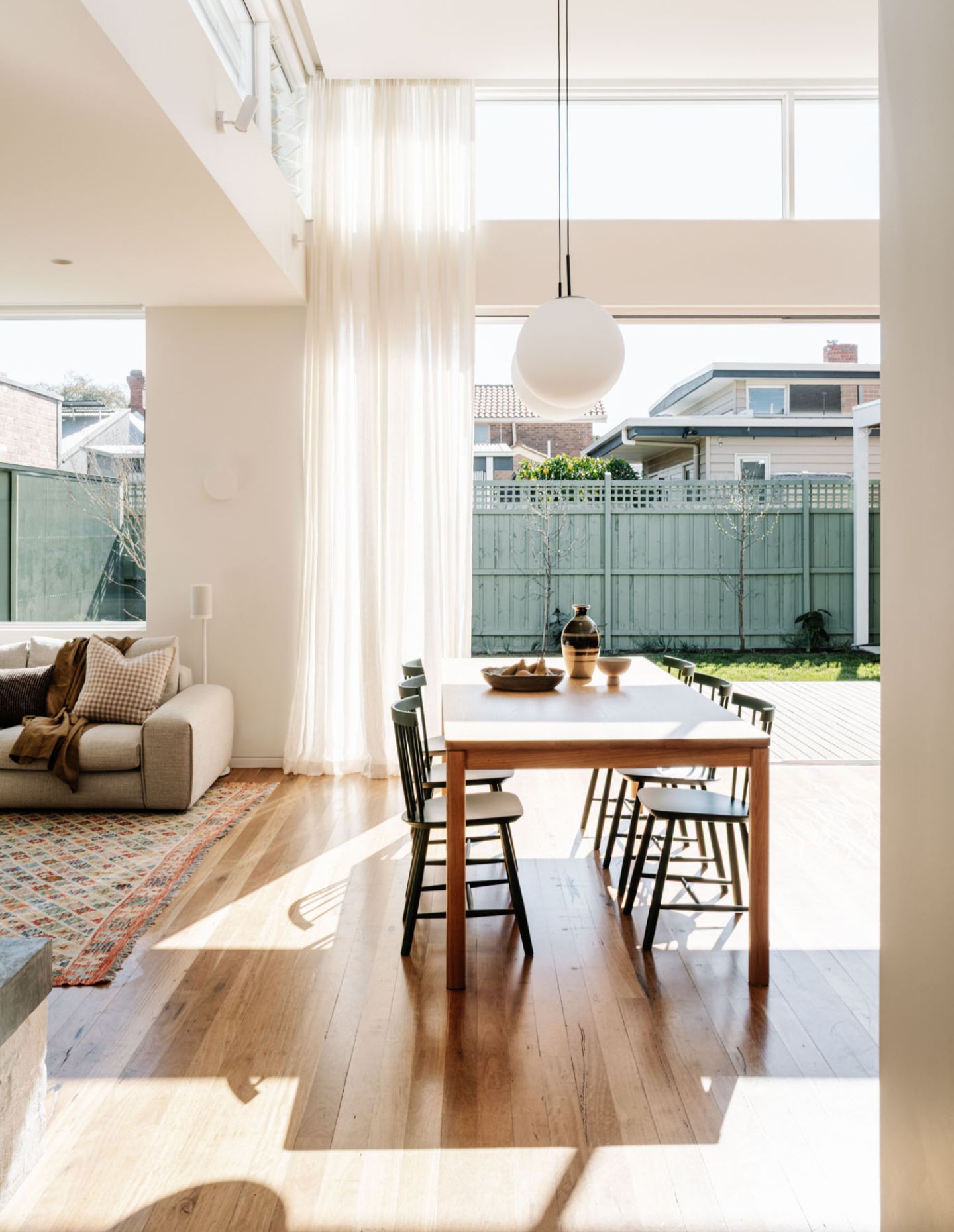 Compounding this expansive ambience, the highlight windows that earn the dwelling its name flood the interiors with light at all times of the day, engaging in a mesmerising dialogue with the home’s palette. “The natural light illuminates the beautiful natural materials, including the Blackbutt flooring and cabinetry, with a warm glow,” Ben says. The home’s rear orientation towards the North ensures outstanding access to sunlight all year round, while the highlight windows, Ben adds, bring in beautiful morning light from the East and sunsets to the West.
