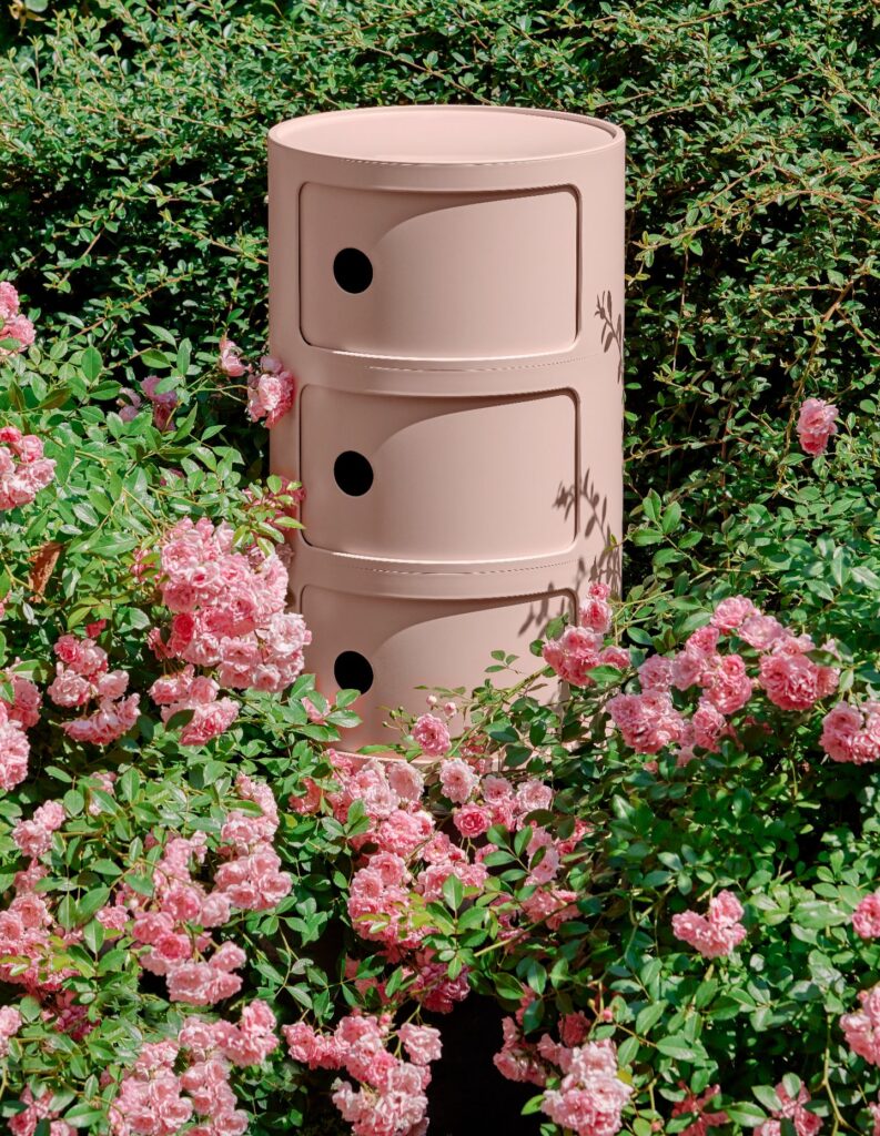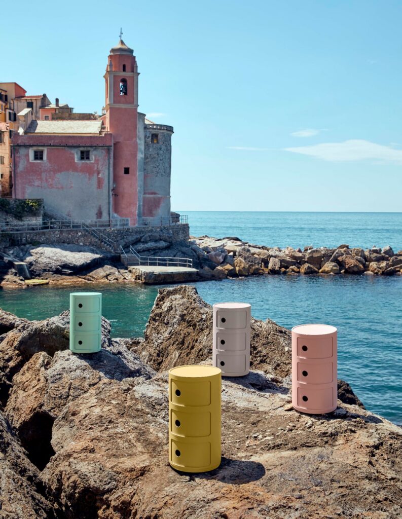 Kartell’s material research extends beyond seating. The Componibili Bio originally designed by Anna Castelli Ferrieri in 1967, reworks the storage icon using a biopolymer derived from agricultural waste, aligning the same familiar form with circular design principles and contemporary environmental goals.