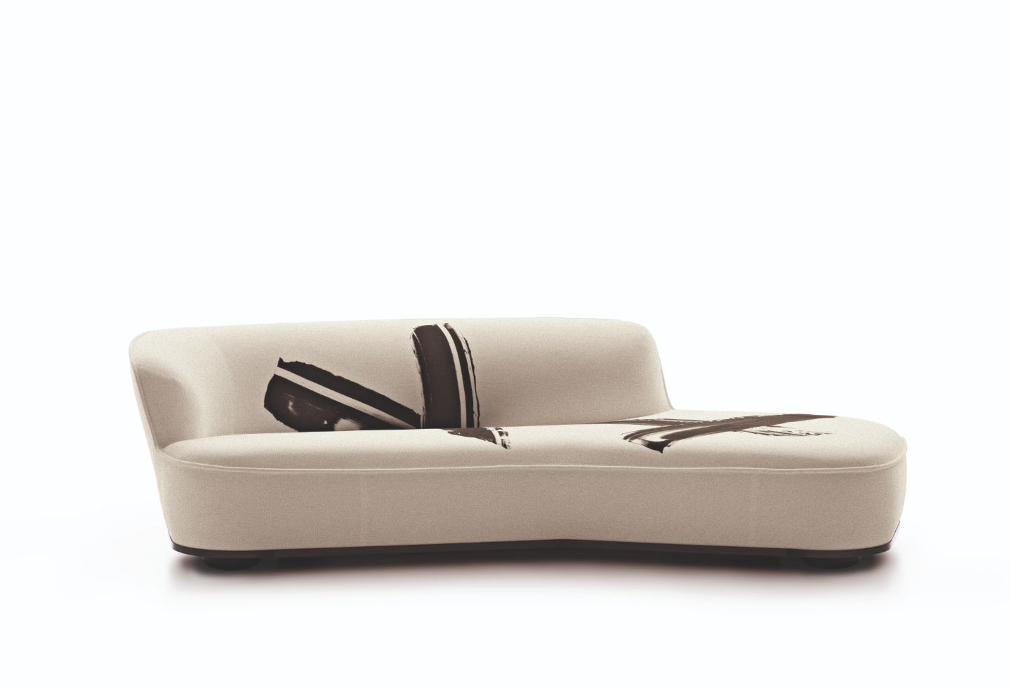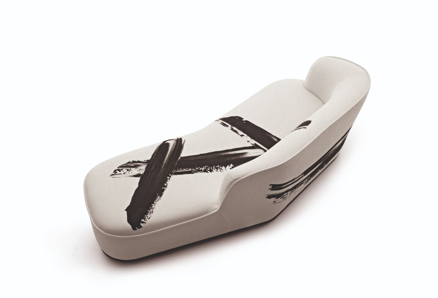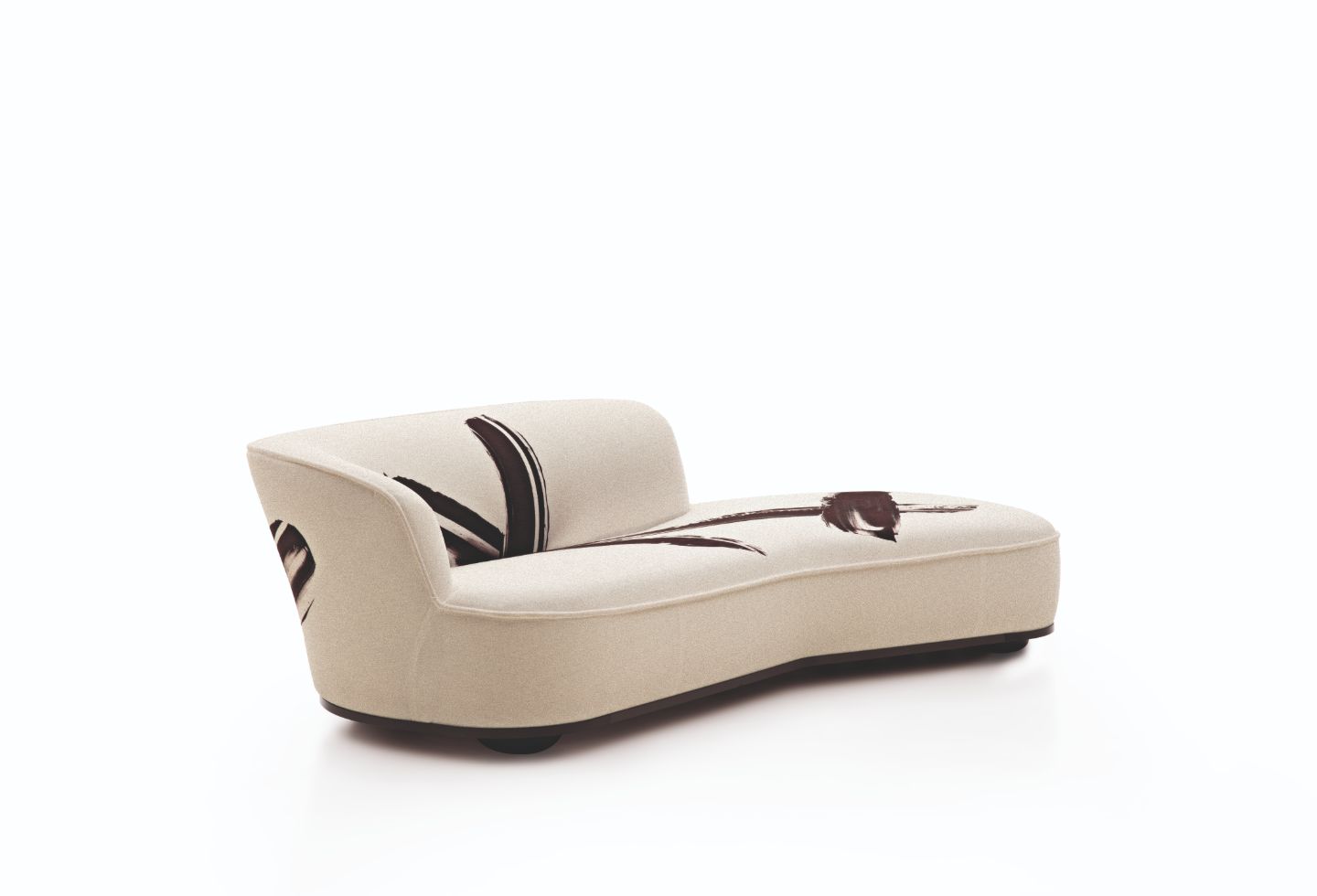 In celebrating its 50th anniversary in 2025, the brand also returned to Milan Design Week with a series of limited editions that underscore its enduring values while embracing evolving expressions. Among them is the Lilum dormeuse, produced in just 50 pieces and upholstered in a fabric featuring original artwork by Dutch artist Patrick van Riemsdijk. His calligraphic brushwork echoes Maxalto’s affinity for balanced contrast, bridging minimalism and ornament in dialogue with form and function. The Pathos table was another appearance at Salone del Mobile, a piece reimagined by Citterio in 2011 and released here as a special 50-piece limited edition with a bronze laser-cut structure and untreated solid Italian walnut top.