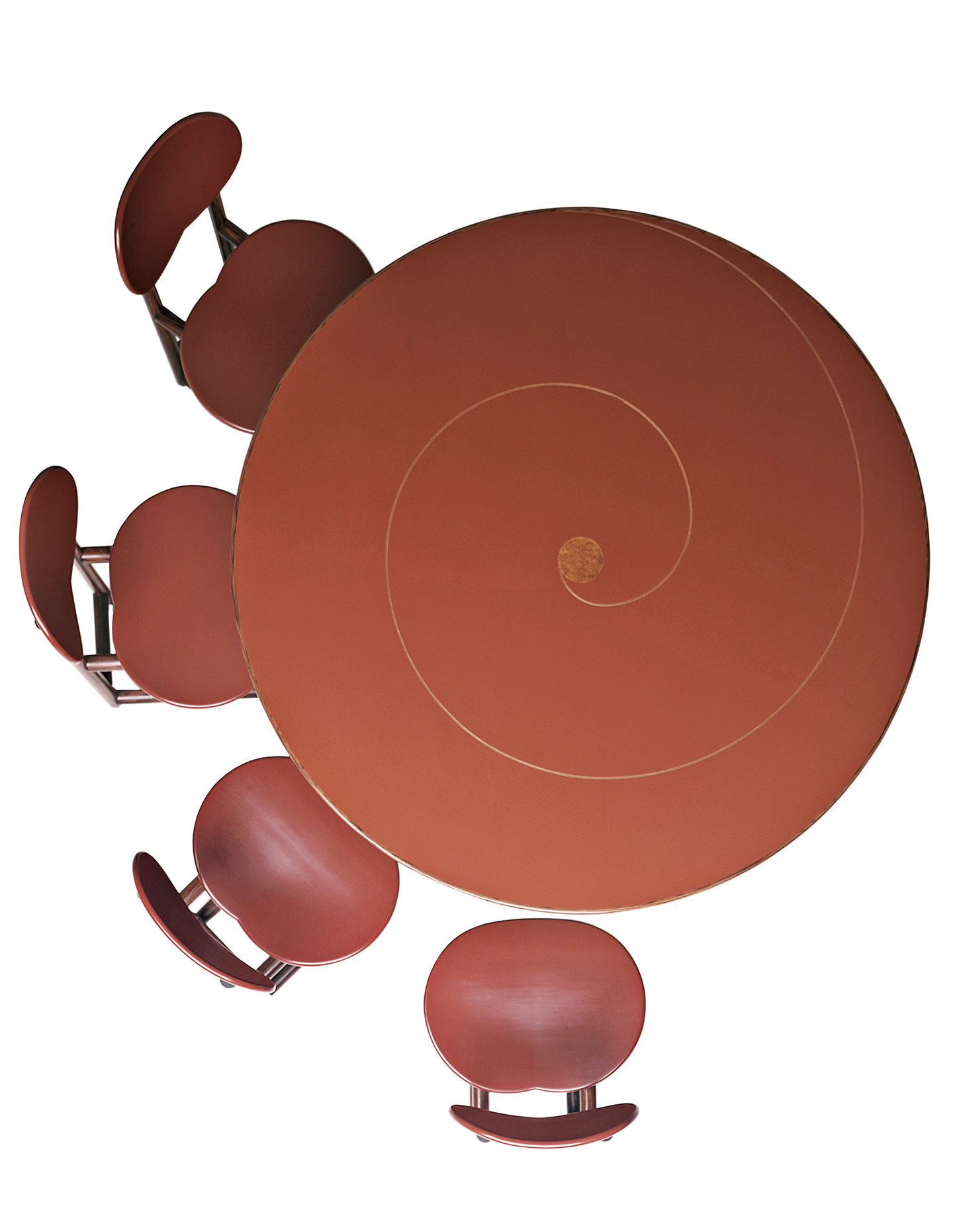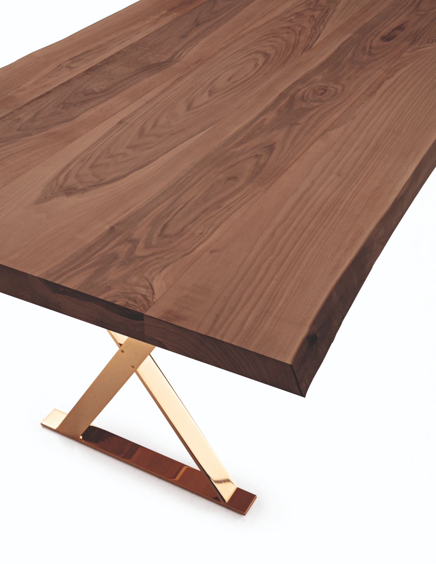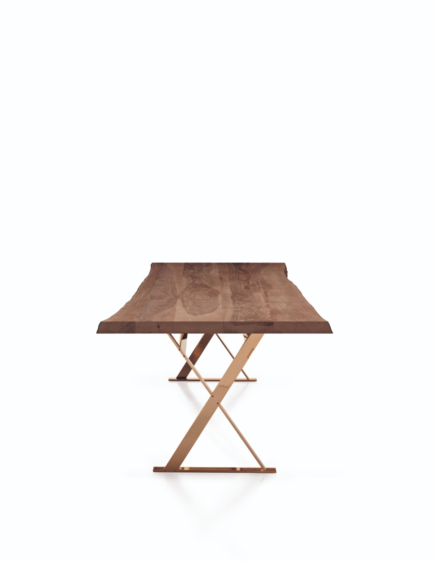 In celebrating its 50th anniversary in 2025, the brand also returned to Milan Design Week with a series of limited editions that underscore its enduring values while embracing evolving expressions. Among them is the Lilum dormeuse, produced in just 50 pieces and upholstered in a fabric featuring original artwork by Dutch artist Patrick van Riemsdijk. His calligraphic brushwork echoes Maxalto’s affinity for balanced contrast, bridging minimalism and ornament in dialogue with form and function. The Pathos table was another appearance at Salone del Mobile, a piece reimagined by Citterio in 2011 and released here as a special 50-piece limited edition with a bronze laser-cut structure and untreated solid Italian walnut top.