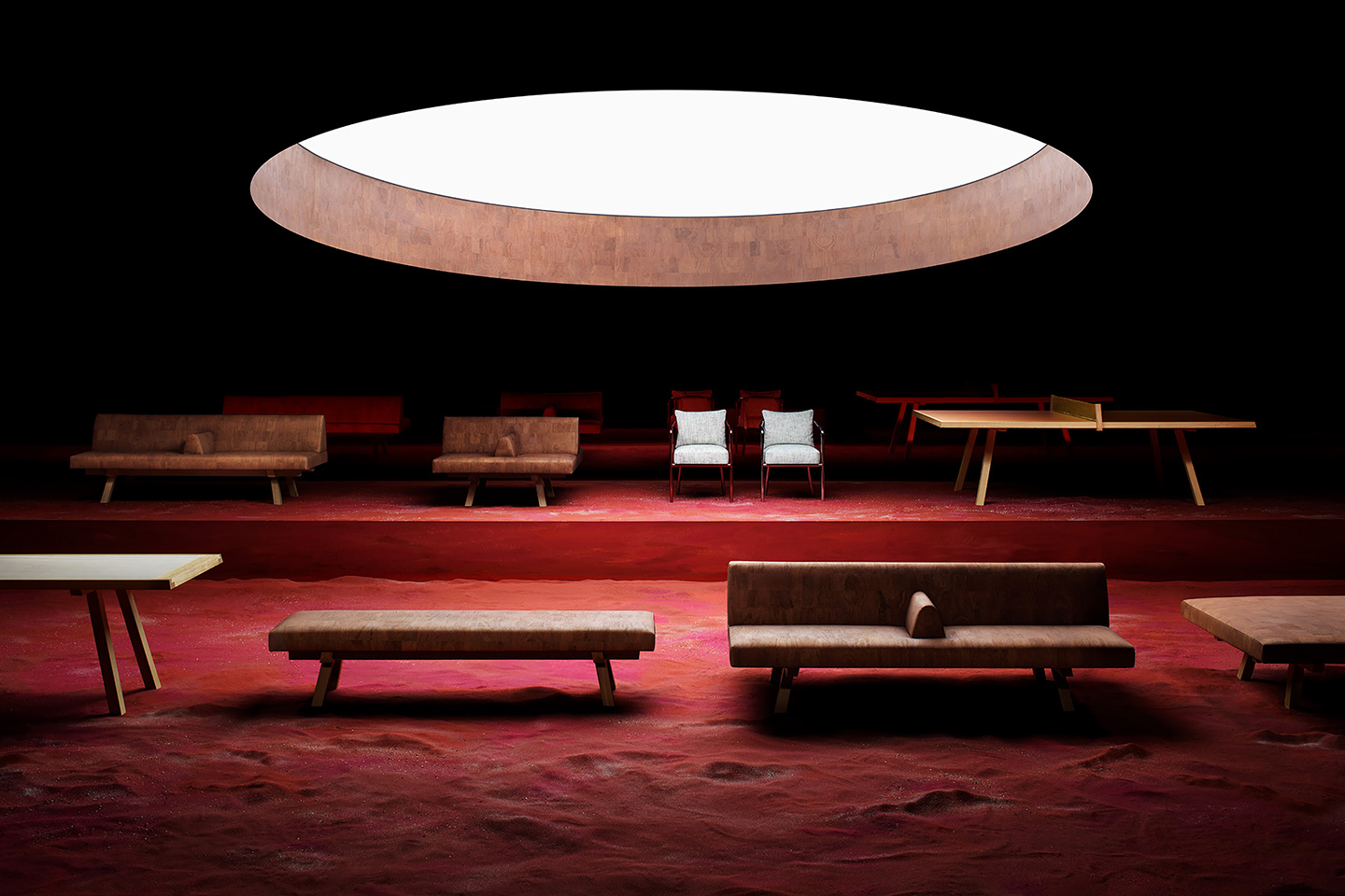 The range includes tables in various sizes and finishes, benches, cork-upholstered sofas, coffee tables and a ping pong table. Solid wood forms the structural framework, with table tops in travertine and coloured glass. Cork upholstery introduces a durable, renewable surface that develops character over time.