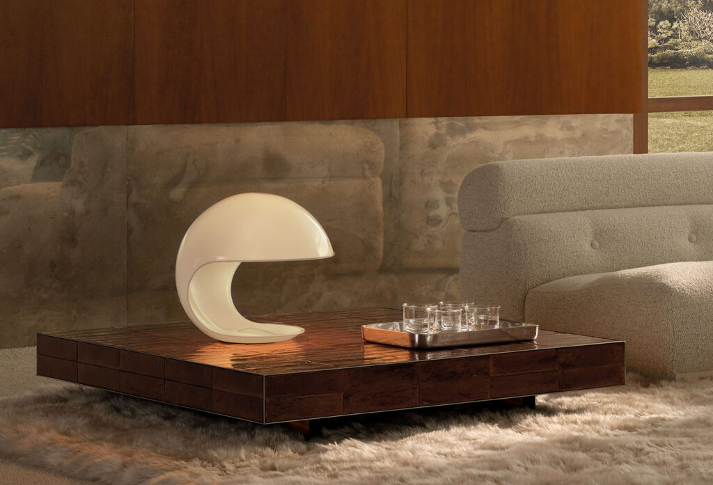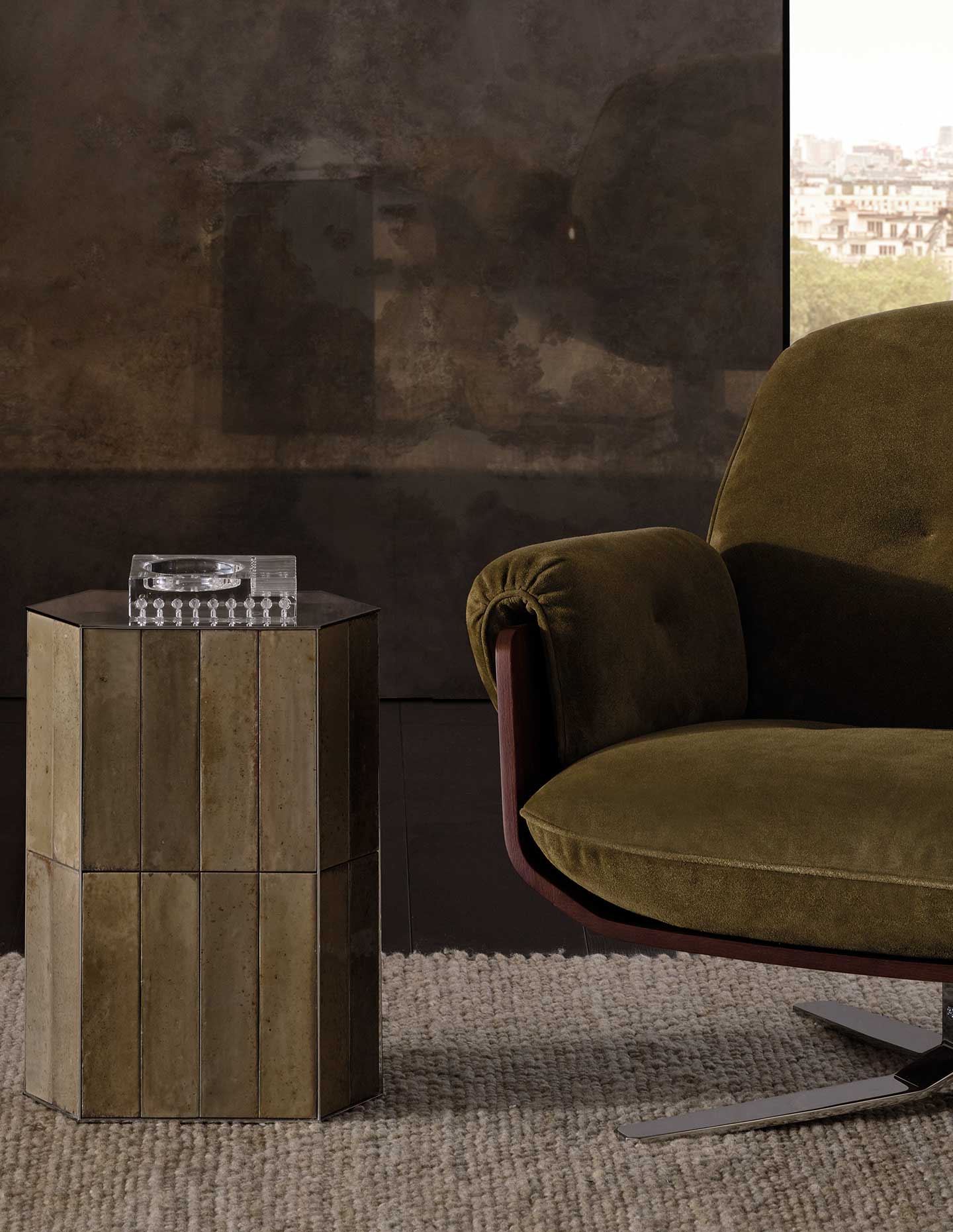 His Andrée Coffee Table (below) combines clean, rigid lines with the rich texture of glazed ceramic tile. This refined contrast lends the piece a distinctive artisanal character, animating the living space with a subtle, glistening effect. Thanks to natural variation in the ceramic finish, each table is unique.