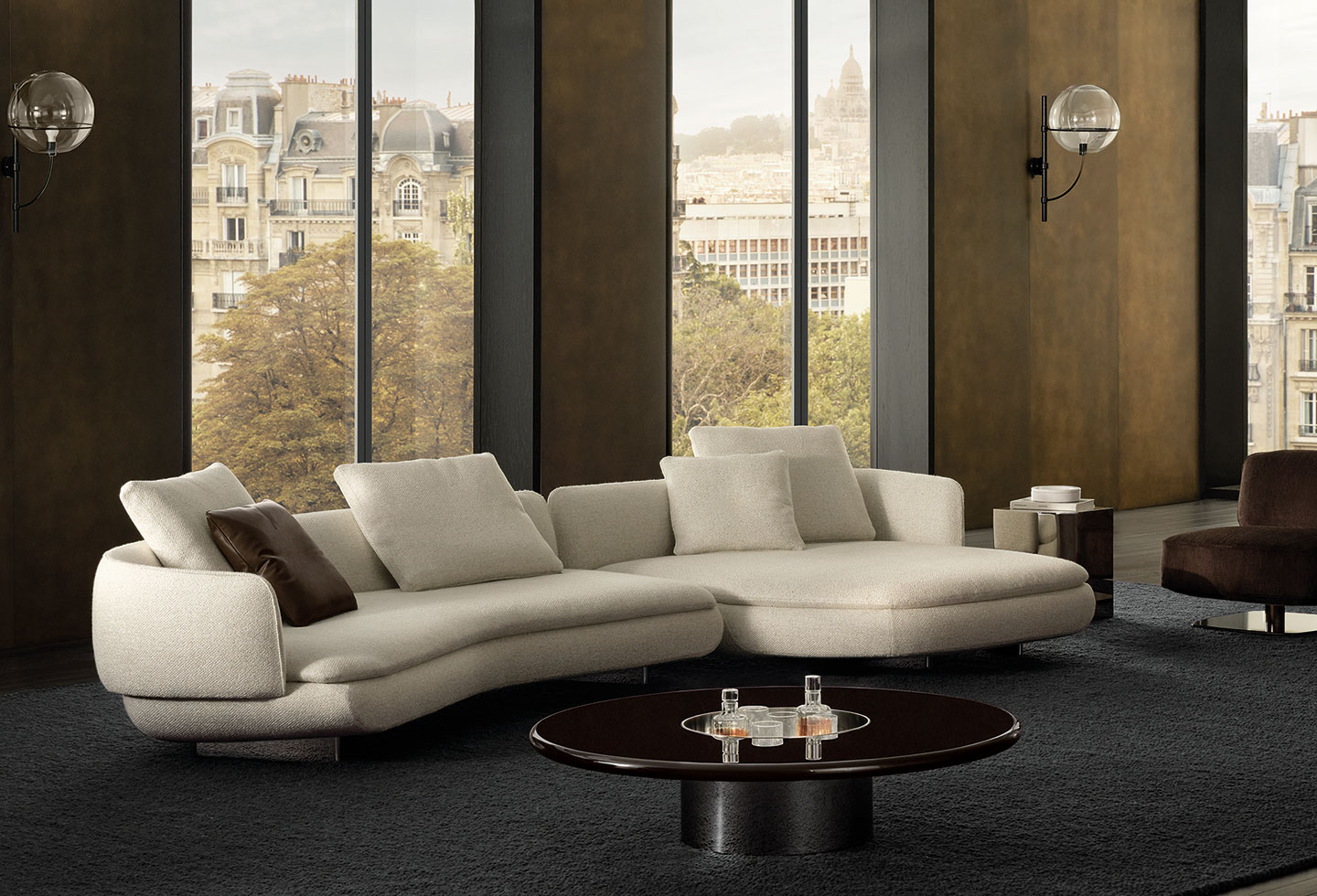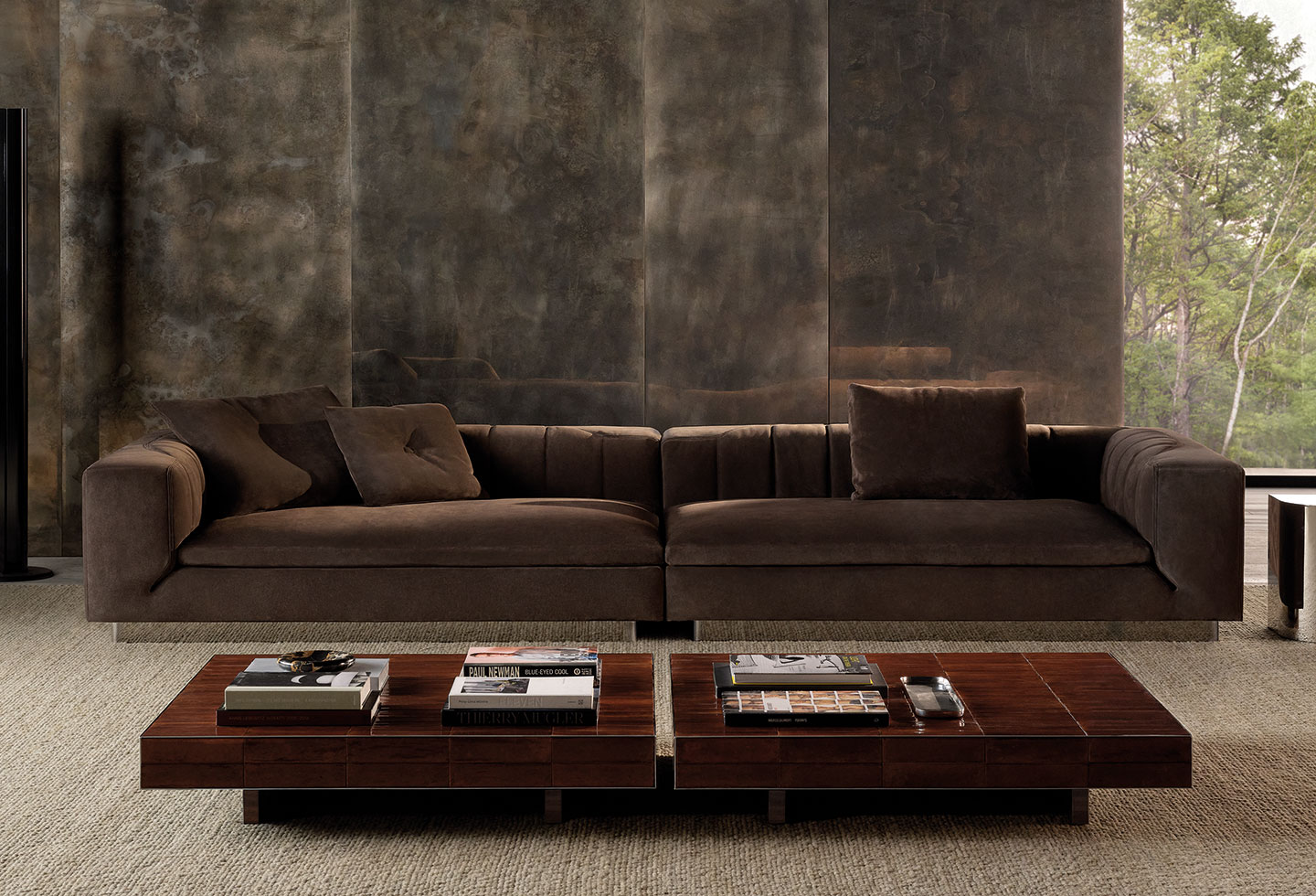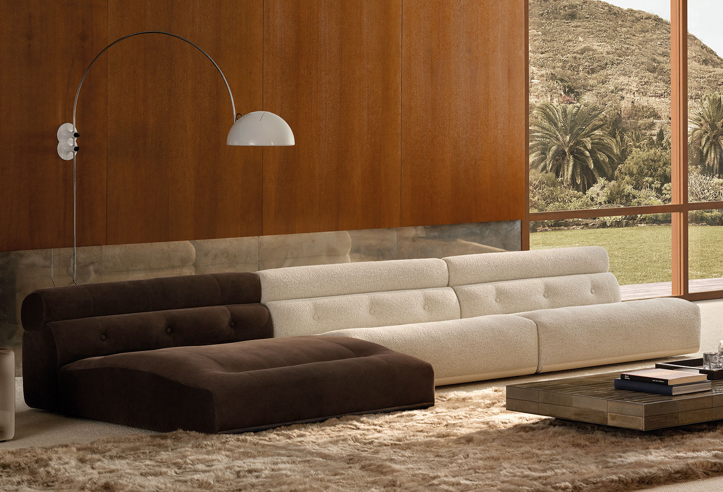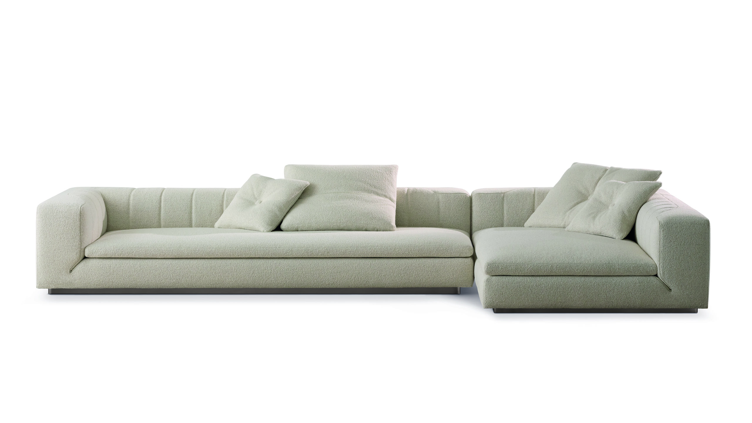 Hannes Peer‘s contributions blend past with present, balancing tradition with modernity in ways that align with Minotti’s desire to unite aesthetics and functionality. His Riley seating system (pictured above) exists as a juxtaposition between restraint and expression, with one side distinctly architectural and outward facing. The opposite side is softer on the interior, featuring a strong graphic element that invites relaxation.