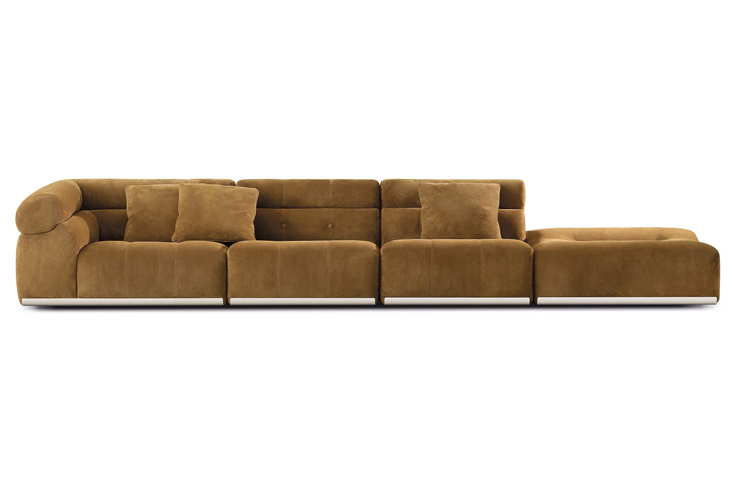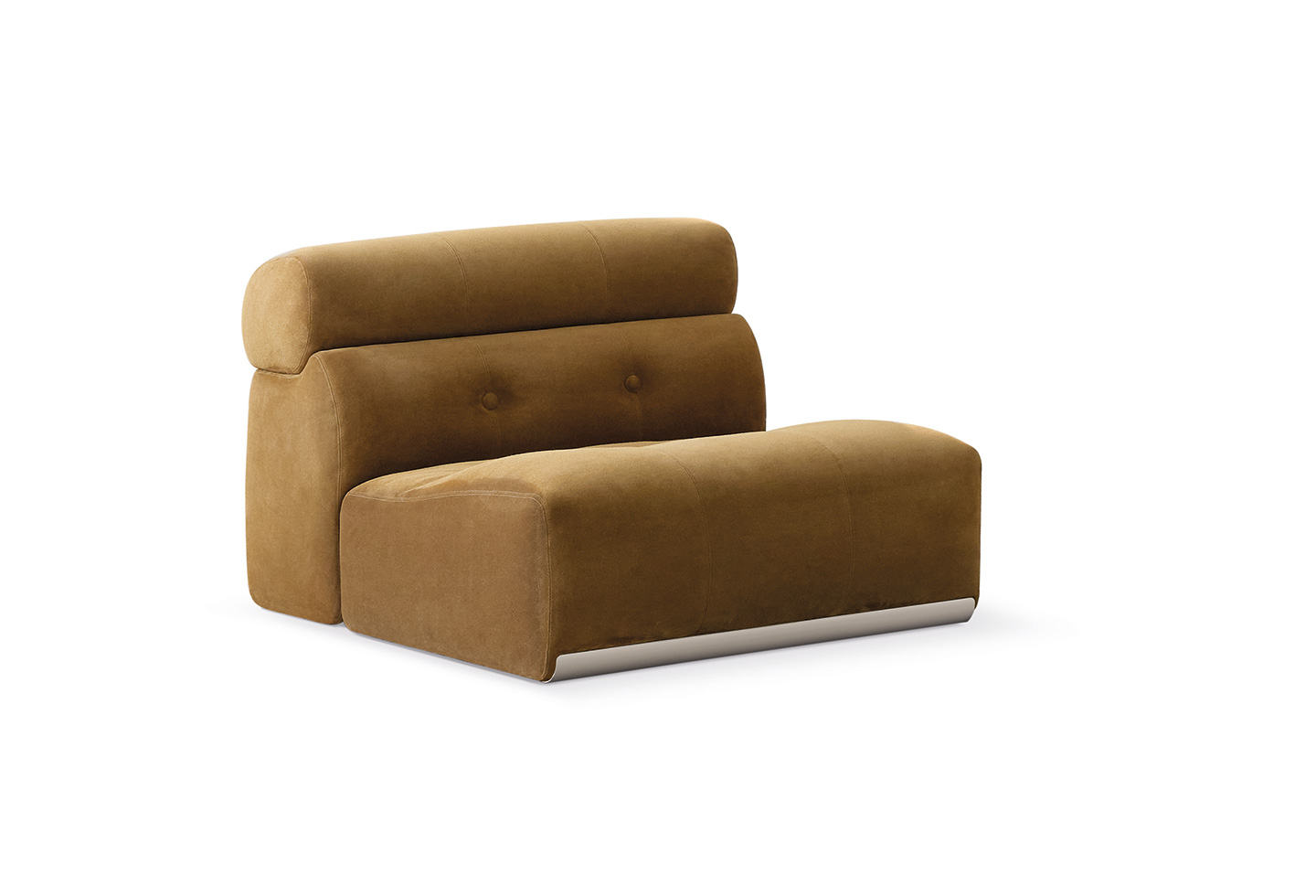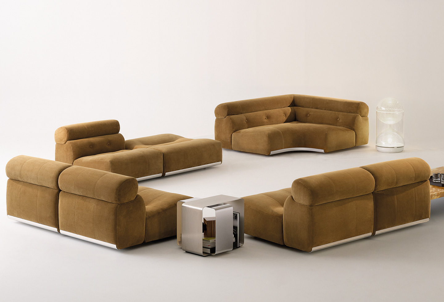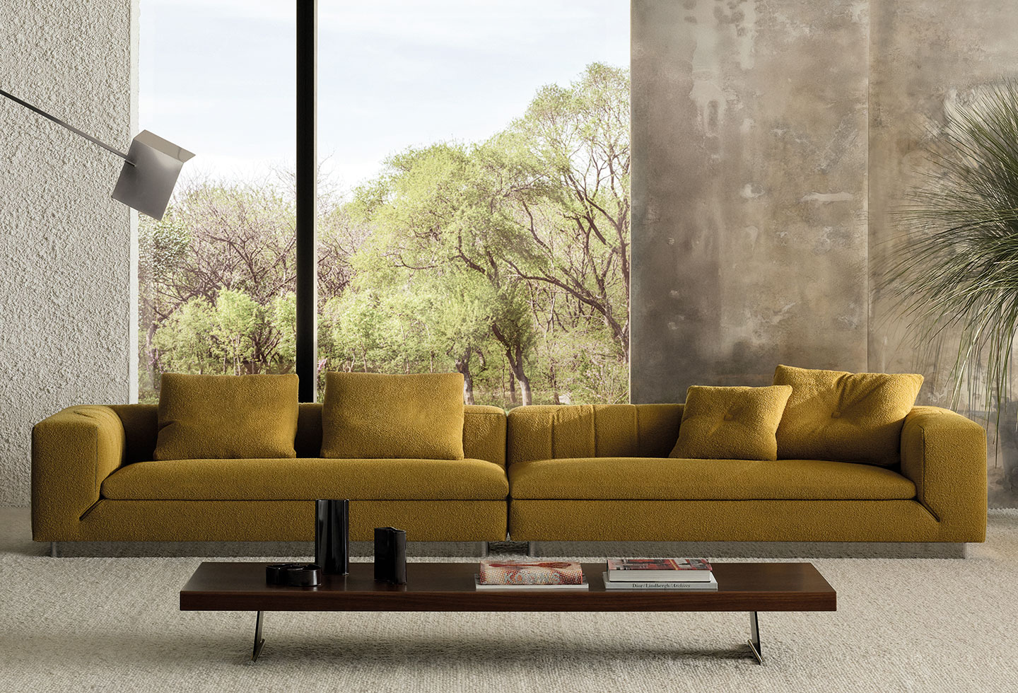 Hannes Peer‘s contributions blend past with present, balancing tradition with modernity in ways that align with Minotti’s desire to unite aesthetics and functionality. His Riley seating system (pictured above) exists as a juxtaposition between restraint and expression, with one side distinctly architectural and outward facing. The opposite side is softer on the interior, featuring a strong graphic element that invites relaxation.