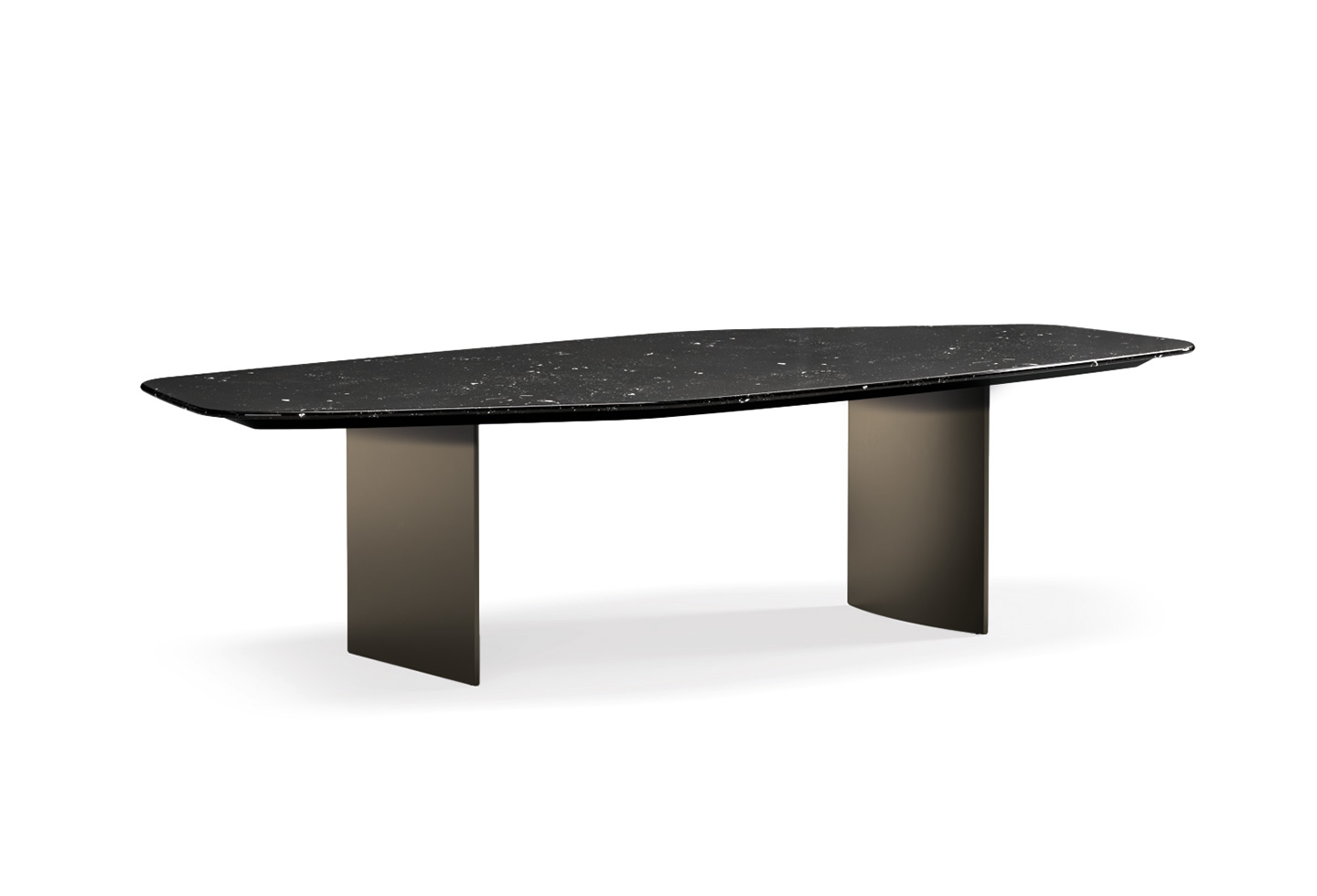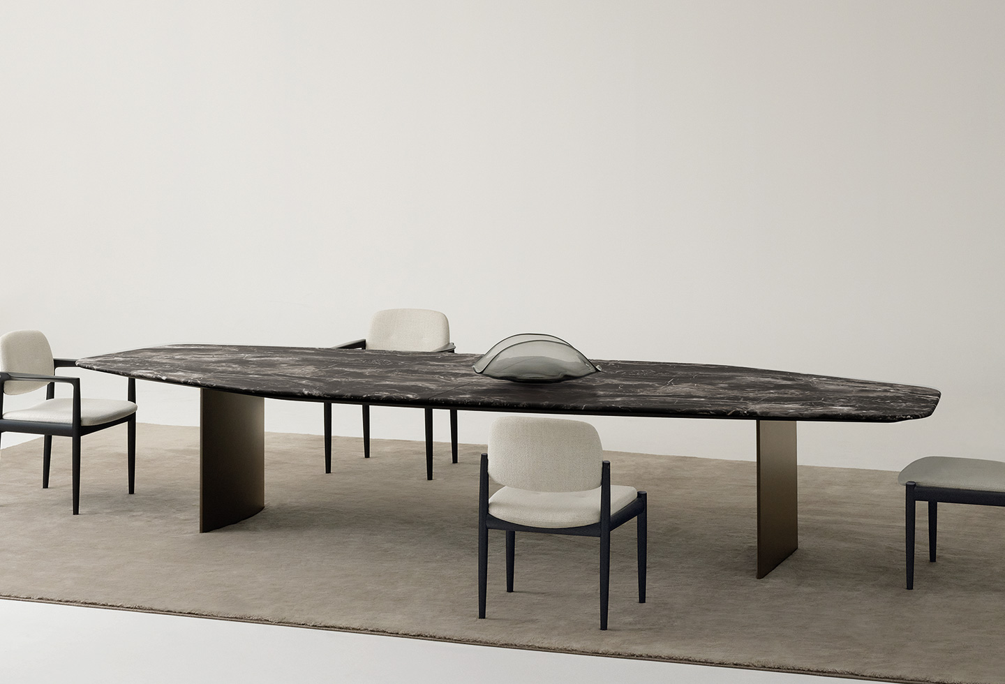 His Linha Livre dining table (above) departs from traditional rectangular forms, embracing a dynamic polygonal silhouette that allows for a convivial arrangement of seats, fostering a more inclusive dining experience.