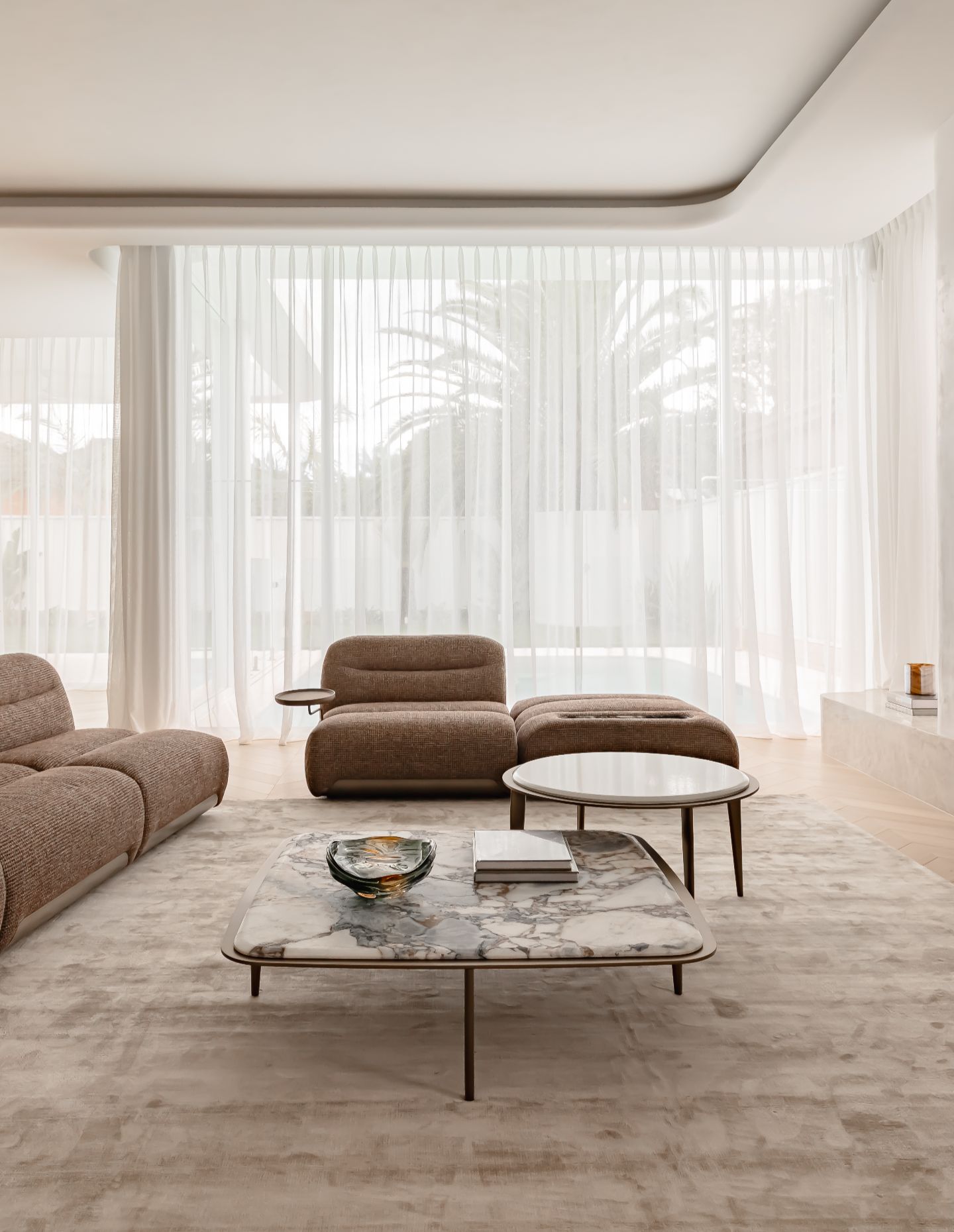 The furniture collection itself speaks to Raffine’s commitment to enduring design. The Brielle Table is exemplary – a dining piece where marble meets metal and timber in proportions that feel both substantial and refined. Clean lines and considered materiality create a table that anchors a room without overwhelming it. Similarly, the Dante Sofa demonstrates architectural form applied to upholstered furniture, where structure and comfort coexist in a design built for longevity across both residential and commercial, public spaces.