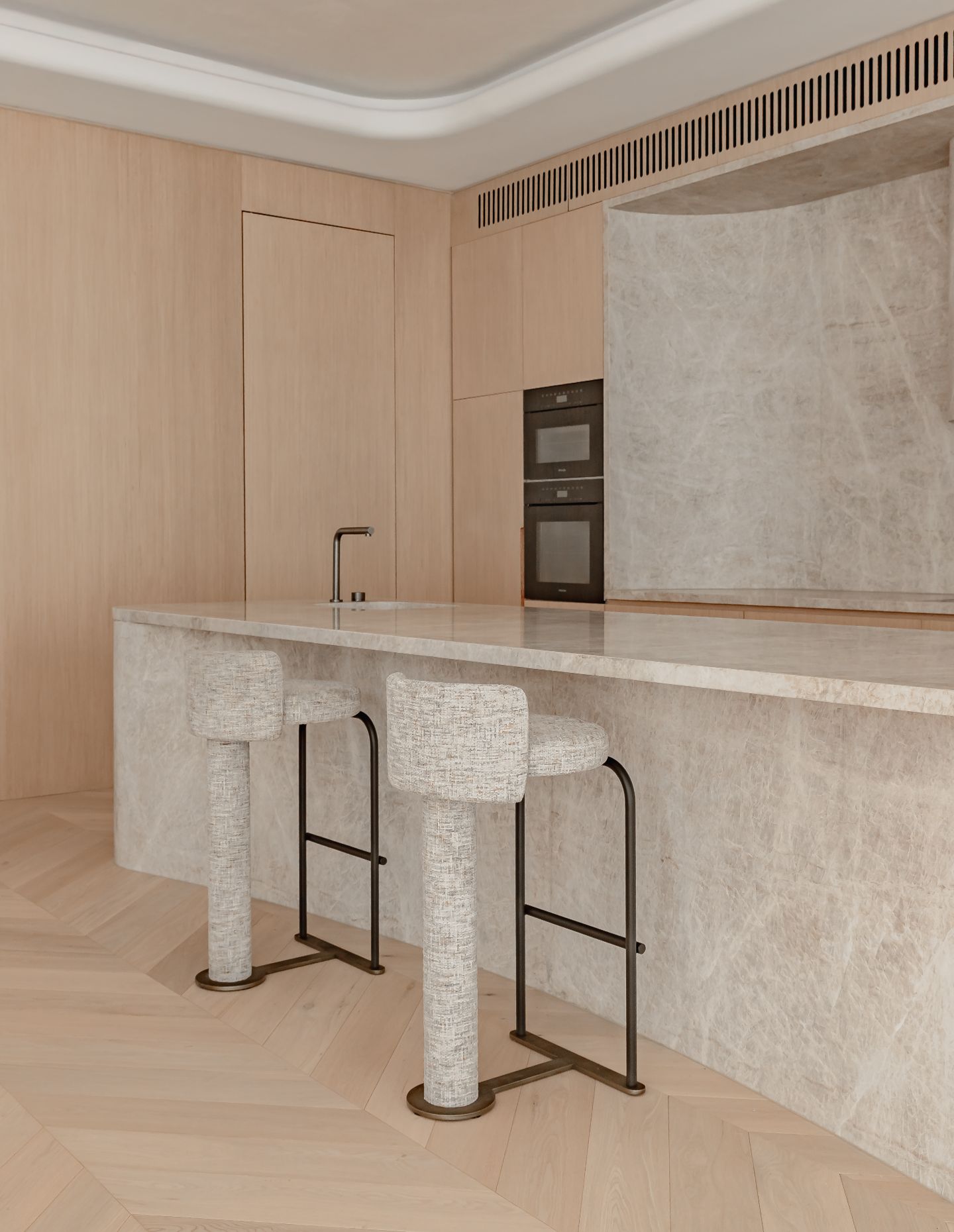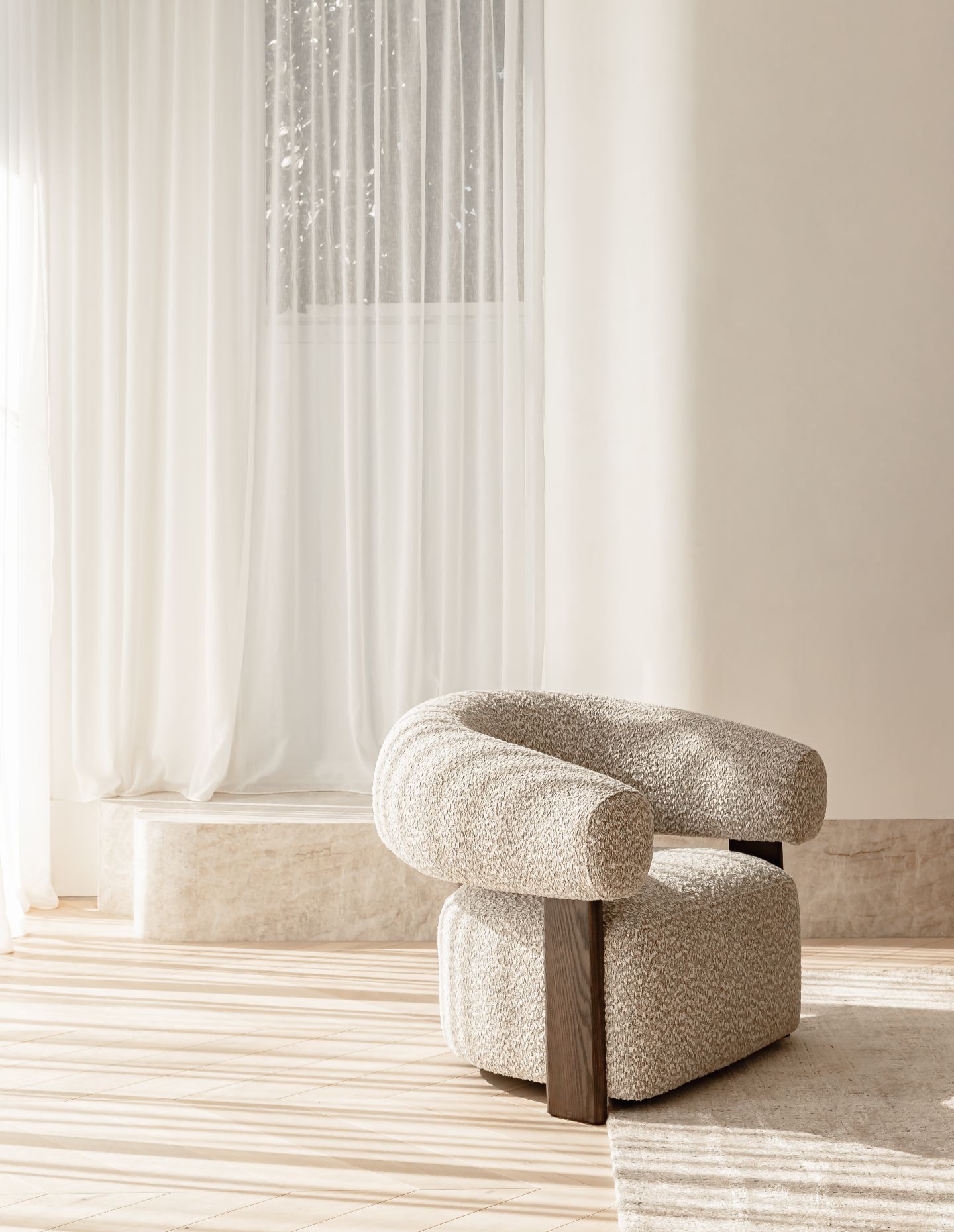 Marble, metal and timber recur throughout the collection as guiding materials. The Florian Mirror captures light and reflects Raffine’s material sensibility in equal measure, while the Jamie Barstool translates solid construction and elegant detailing into seating designed for endurance. Rounded forms and natural finishes distinguish the Petri Armchair, a piece that embodies sculptural restraint and that feels considered and purposeful.