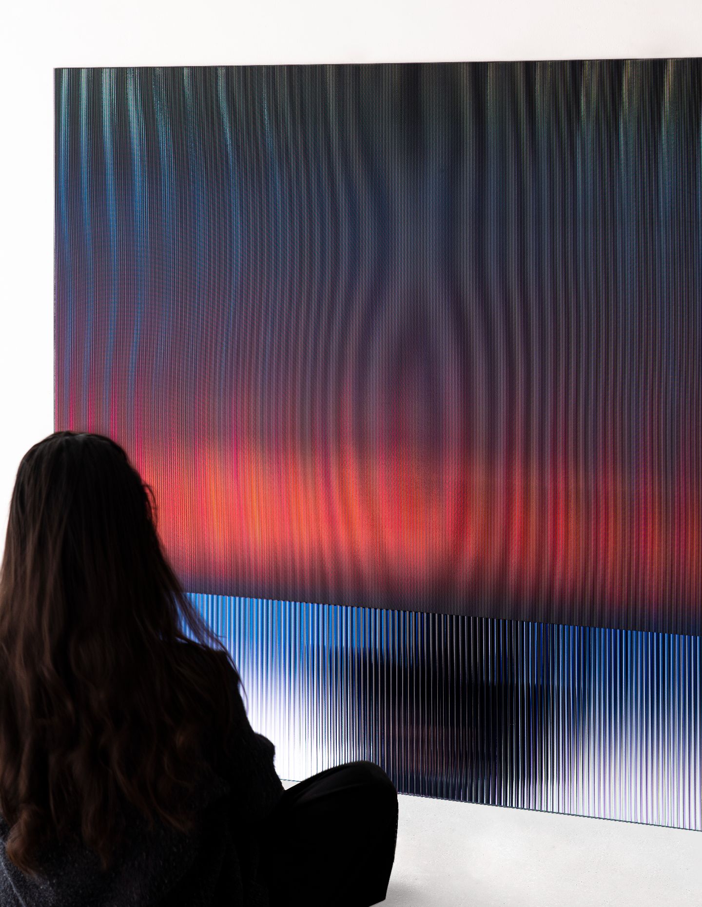Our studio has been developing this technique to translate the mesmerising, fleeting patterns of the atmosphere into a permanent medium. Through glass marquetry, we create a surface that breathes. The interplay of reflection and refraction with light and colour ensures the work is always in dialogue with its surroundings, capturing a rare kinetic energy found where the sky meets the water. Each piece records a specific moment we observed and photographed, often from our home or studio in Amsterdam, yet it continues to transform as light shifts and the viewer moves around it.