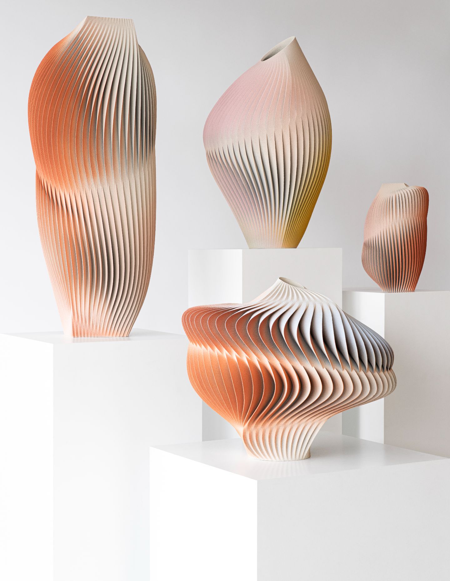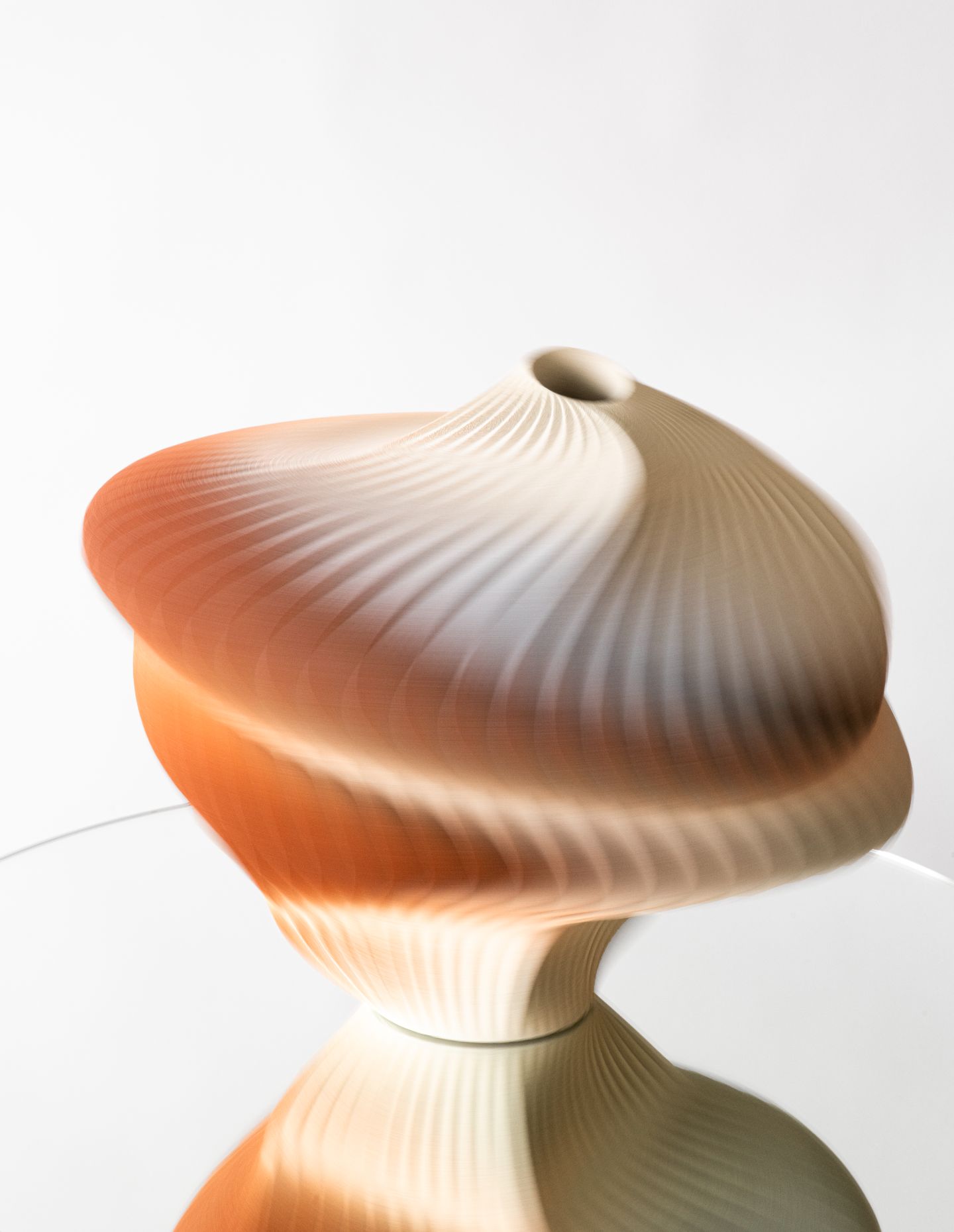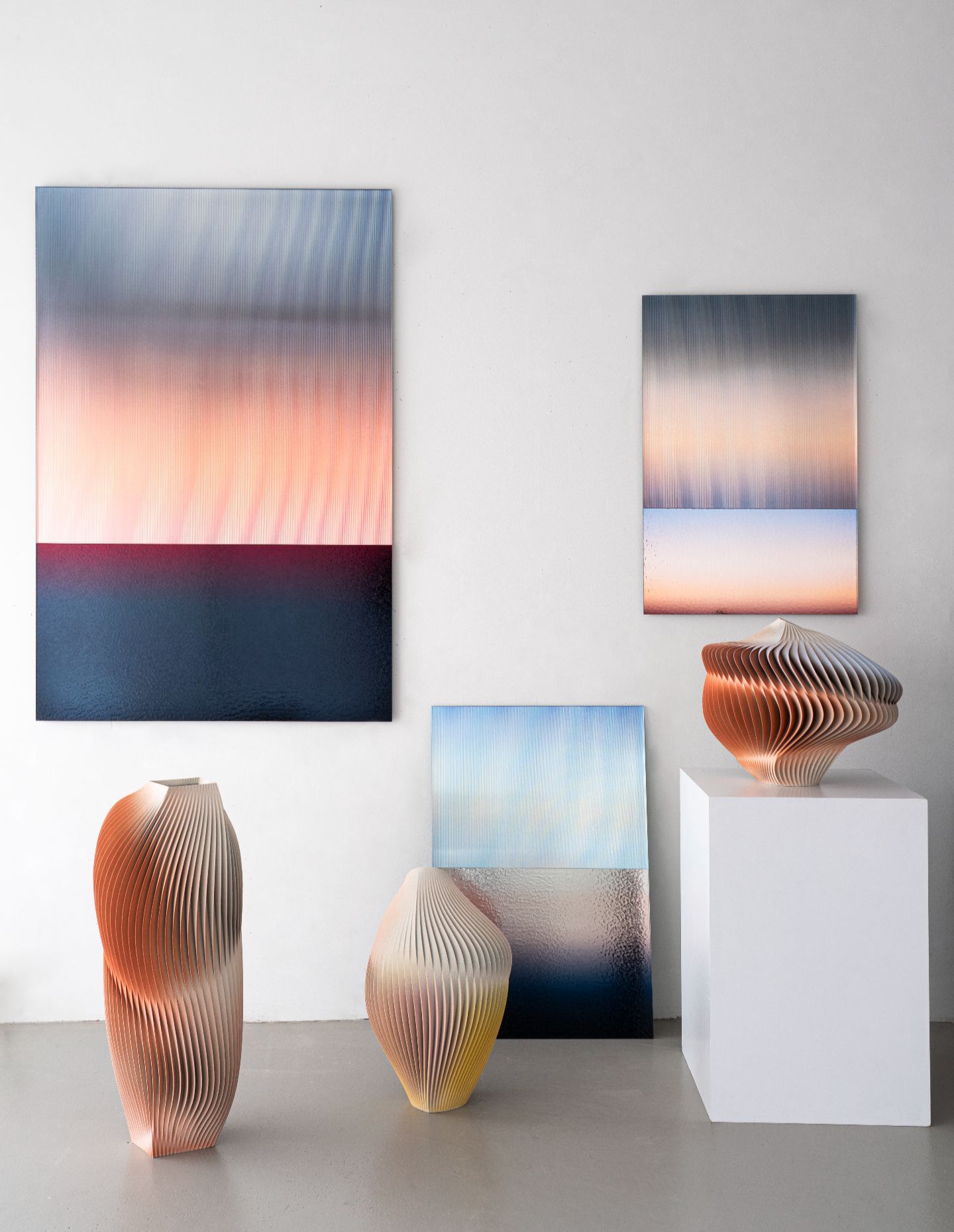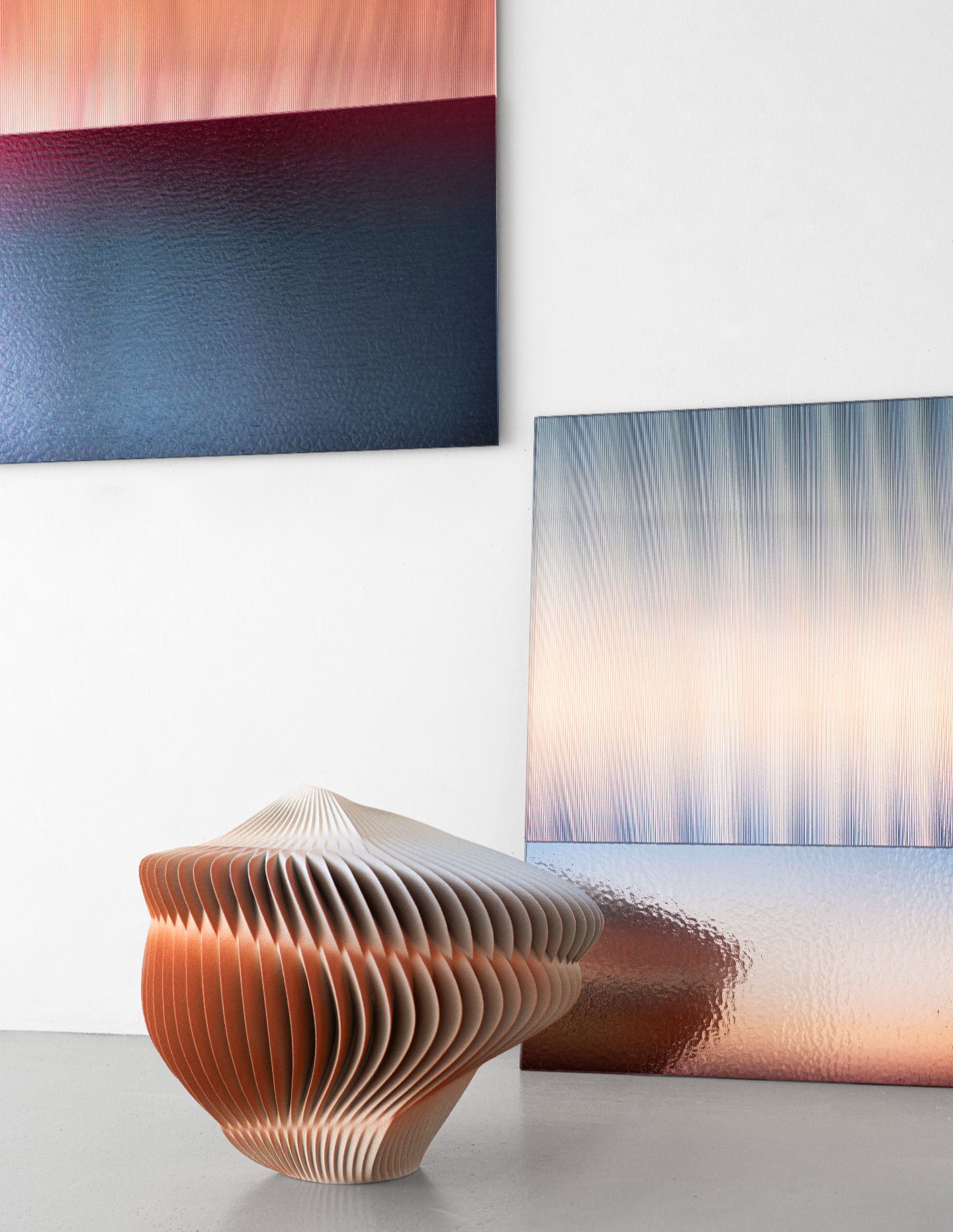 Our work represents a transition from the view to the object. The Voices vessels are sculptural studies in movement, 3D-printed in sand and meticulously hand-painted to evoke forms caught in motion. They sit in dialogue with the Windows, almost as if peering into their horizons. Similarly, the Radiance tables introduce a kinetic, undulating energy to otherwise solid forms. Together, these works create a space where the ephemeral light of the sky is grounded into functional, sculptural art objects.