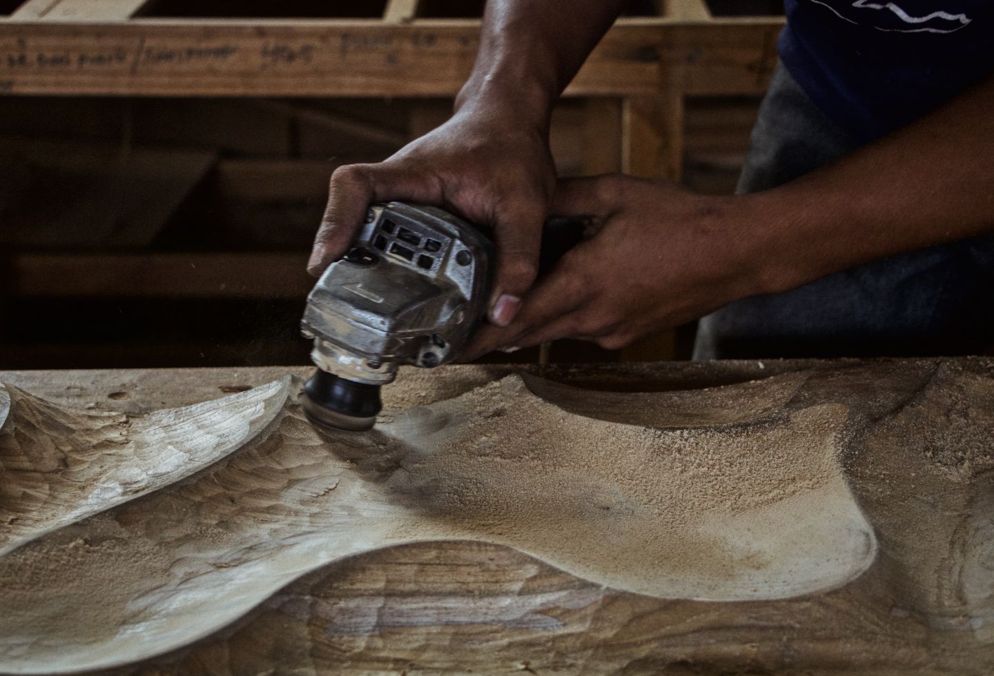 The Maui Collection exemplifies this entirely. At its heart is a father—a generational woodworker—and his love for his daughter. The collection uses timber harvested from logs aged between 75 and 100 years, dried in a kiln for seven days, then carved using traditional techniques that no machine could replicate. “Our pieces feel deeply human,” Maroun says. “As much as they’re refined, there’s this play of taking real primitive forms and putting them in very refined and elegant interiors.”