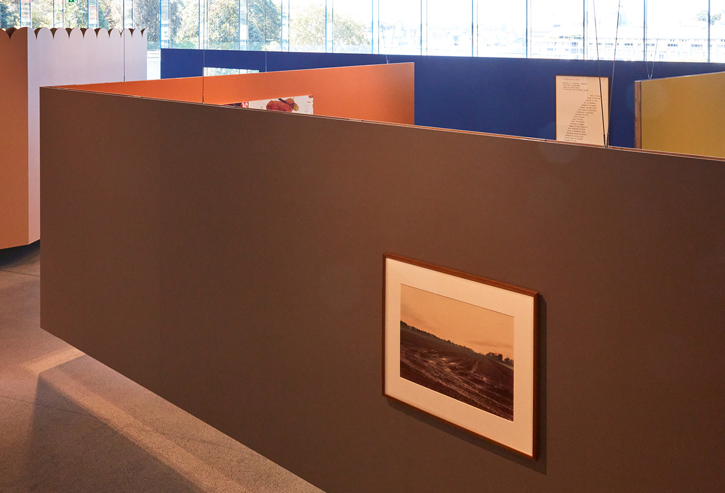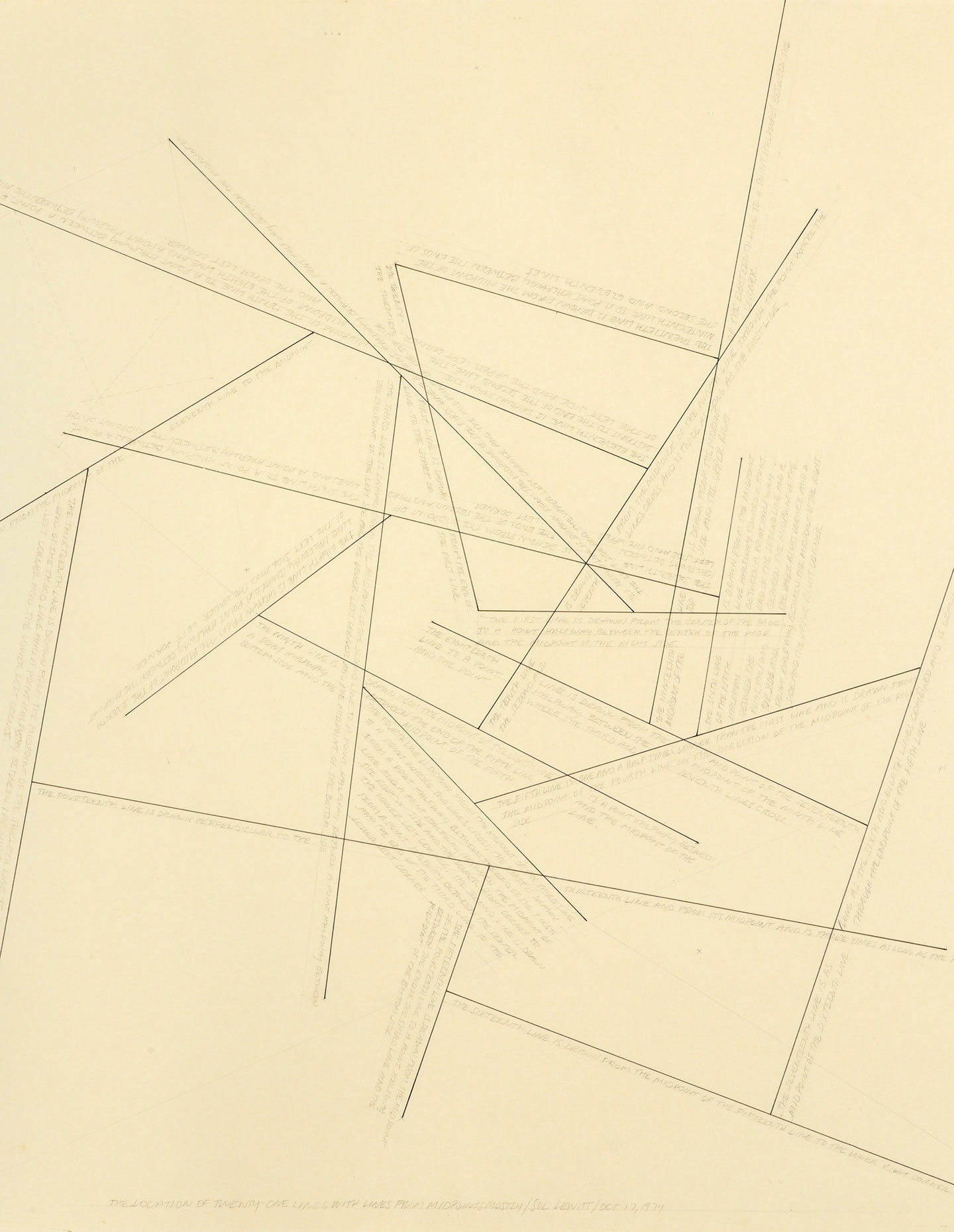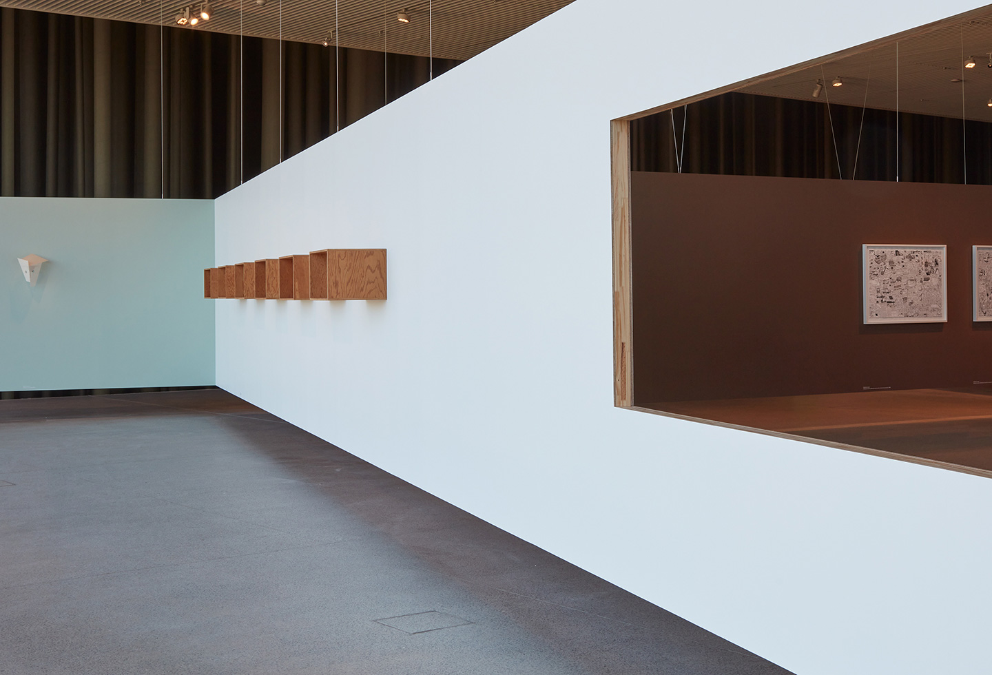 The exhibition‘s architecture emerged from an unexpected source – Sol LeWitt’s The location of twenty-one lines with lines from midpoints mostly, 1974, a drawing Demand discovered. Demand reflects: “It is almost the same square shape as the exhibition space. I thought to myself, it could be quite funny if you could walk through the drawing. It was not intended to be a floorplan; however, I didn’t want the walls to be hung in a grid, or to see everything at once, or impose my own plan. It had to be inherent to the project itself.”