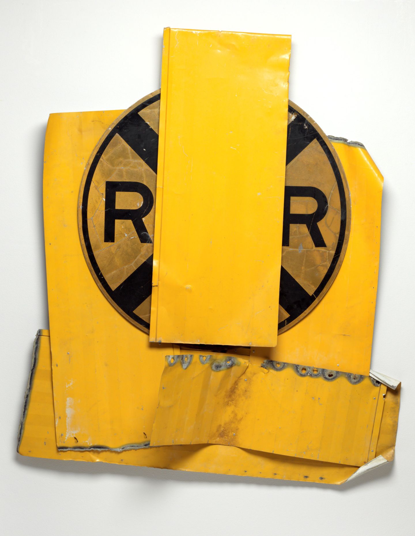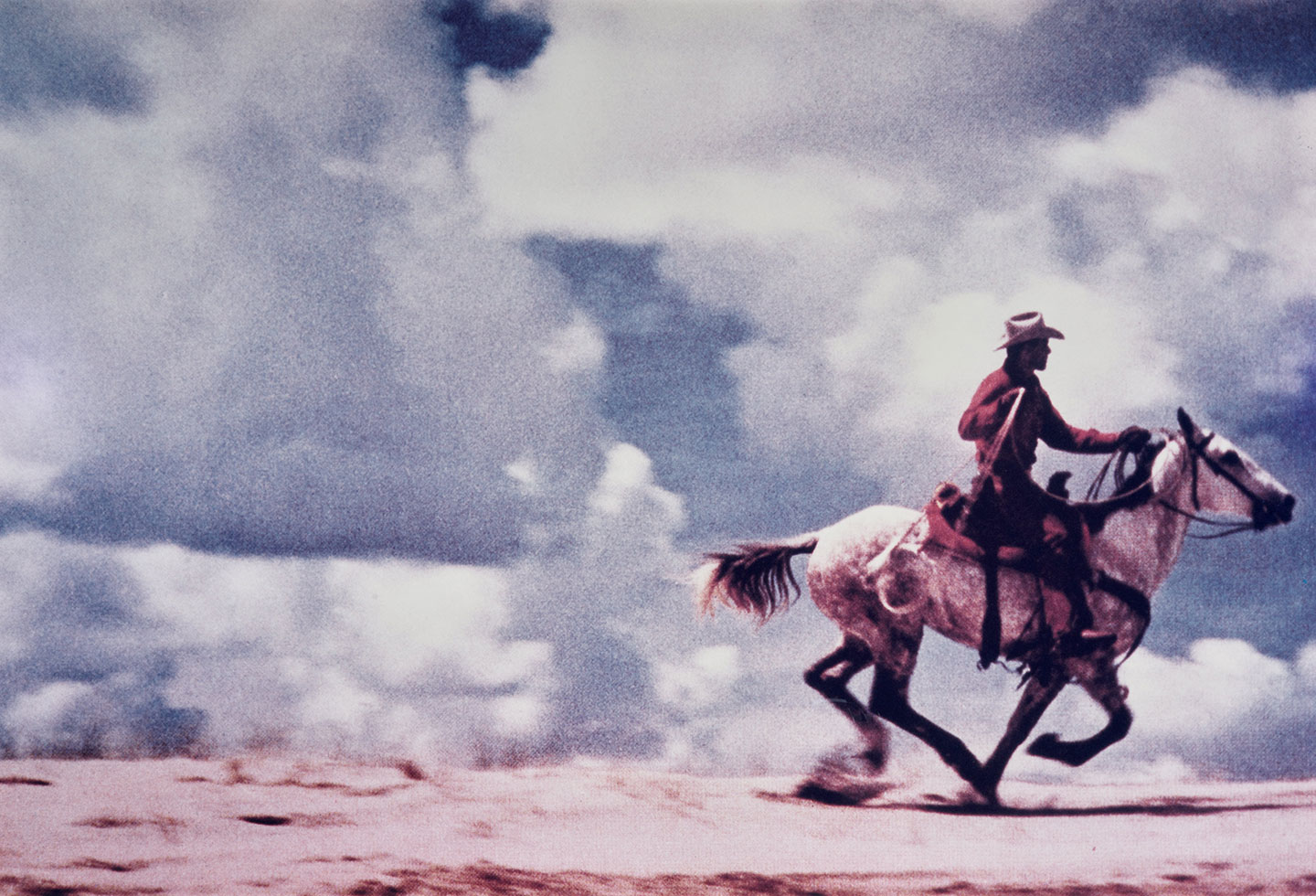 Similarly, the exhibition’s colour palette emerged from the artworks rather than imposed aesthetic choices. “As a starting point, I took the green of the Gursky background with the brown of the frame and that is the wall colour,” Demand describes, allowing each work to influence its immediate environment. This approach transforms familiar pieces: Andreas Gursky’s Düsseldorf, Flughafen II, 1994 gains new resonance, Richard Prince’s iconic depiction of the Marlboro-man archetype Untitled (cowboy), 1980-1989 has softened in front of its rose hued ground; and Robert Rauschenberg’s Yellow visor glut, 1989 is ever striking against a black backdrop.