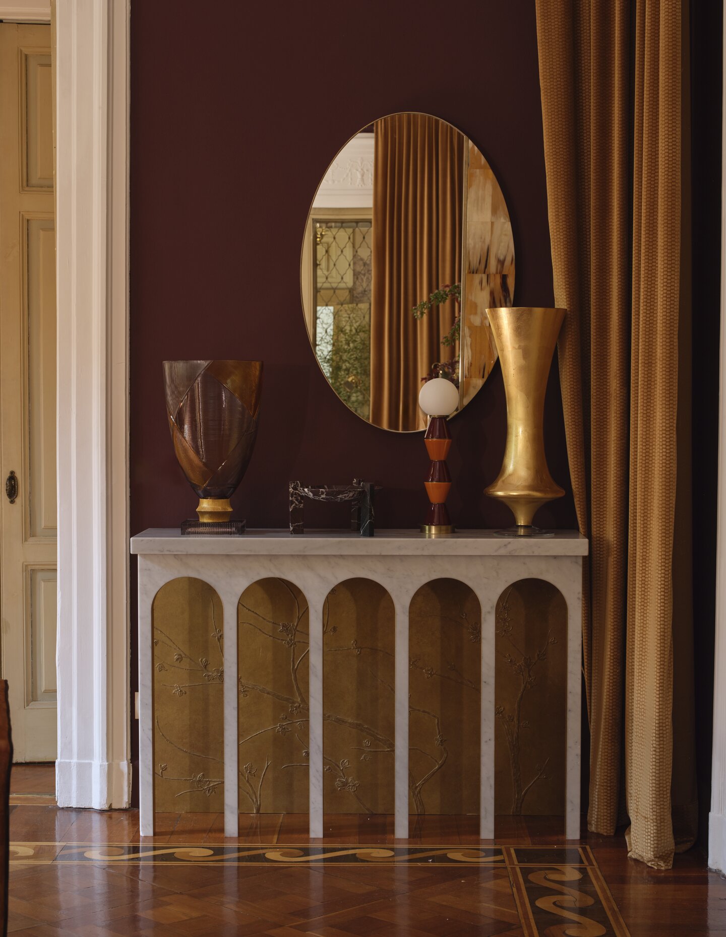 Each room takes on a distinct identity. Sasha Adler’s vestibule and reading room draw on Venice, with a mood that is intimate yet theatrical. Rockwell Group’s dining room looks to Naples and its dramatic contrasts, treating dining as both ritual and performance. MAWD’s grand salon turns to Rome, building depth through colour, materiality and a strong sense of composition, while Charlap Hyman & Herrero channel Palermo in entertainment salons that soften grandeur with a more inhabited, time-worn sensibility. Urjowan Alsharif Interiors completes the sequence with a Florentine alcove conceived as a retreat — contemplative, crafted and finely detailed. Artemest describes the whole as “a multisensory journey through Italy’s artistic capitals,” and that feels about right: the project is at its best when it lets decoration, craftsmanship and atmosphere carry cultural meaning without collapsing into nostalgia.