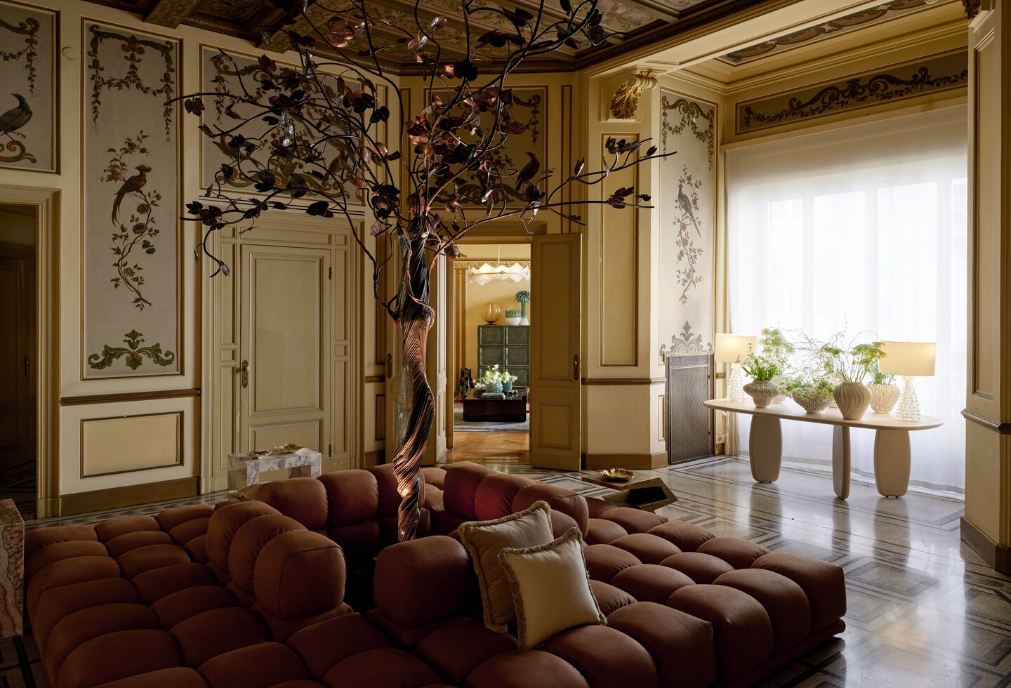 For the fourth edition of L’Appartamento by Artemest, Palazzo Donizetti once again becomes the setting for a decorative world built room by room. This year’s exhibition takes “Italian Grandeur” as its curatorial theme, bringing together a group of international studios to reinterpret the spirit of different Italian cities through a sequence of domestic interiors filled with furniture, lighting and objects made by Italian artisans. Set within the frescoed rooms and ceremonial spaces of the 19th-century palazzo, the exhibition is immersive from the outset, using the architecture itself as part of the argument rather than simply as backdrop.
