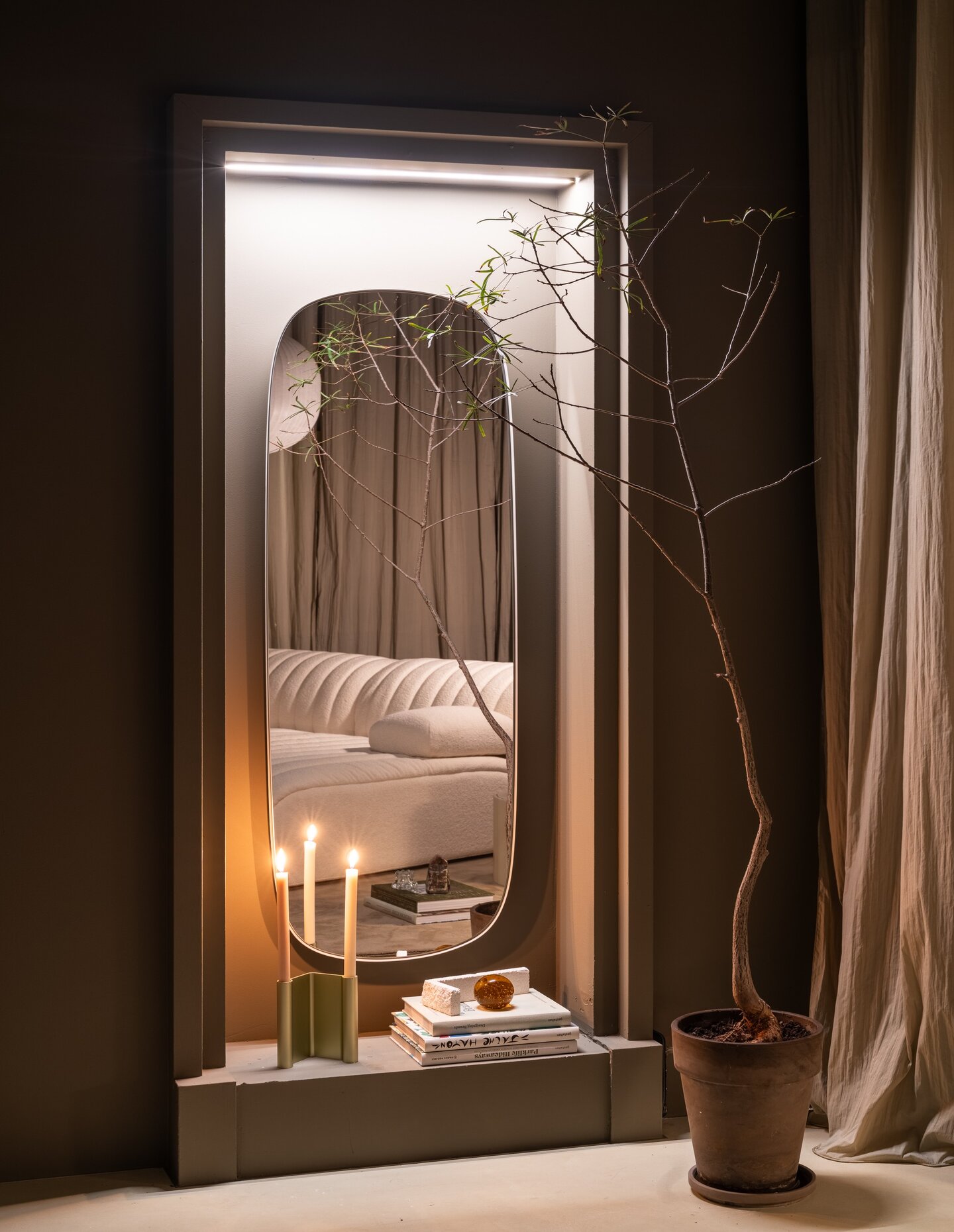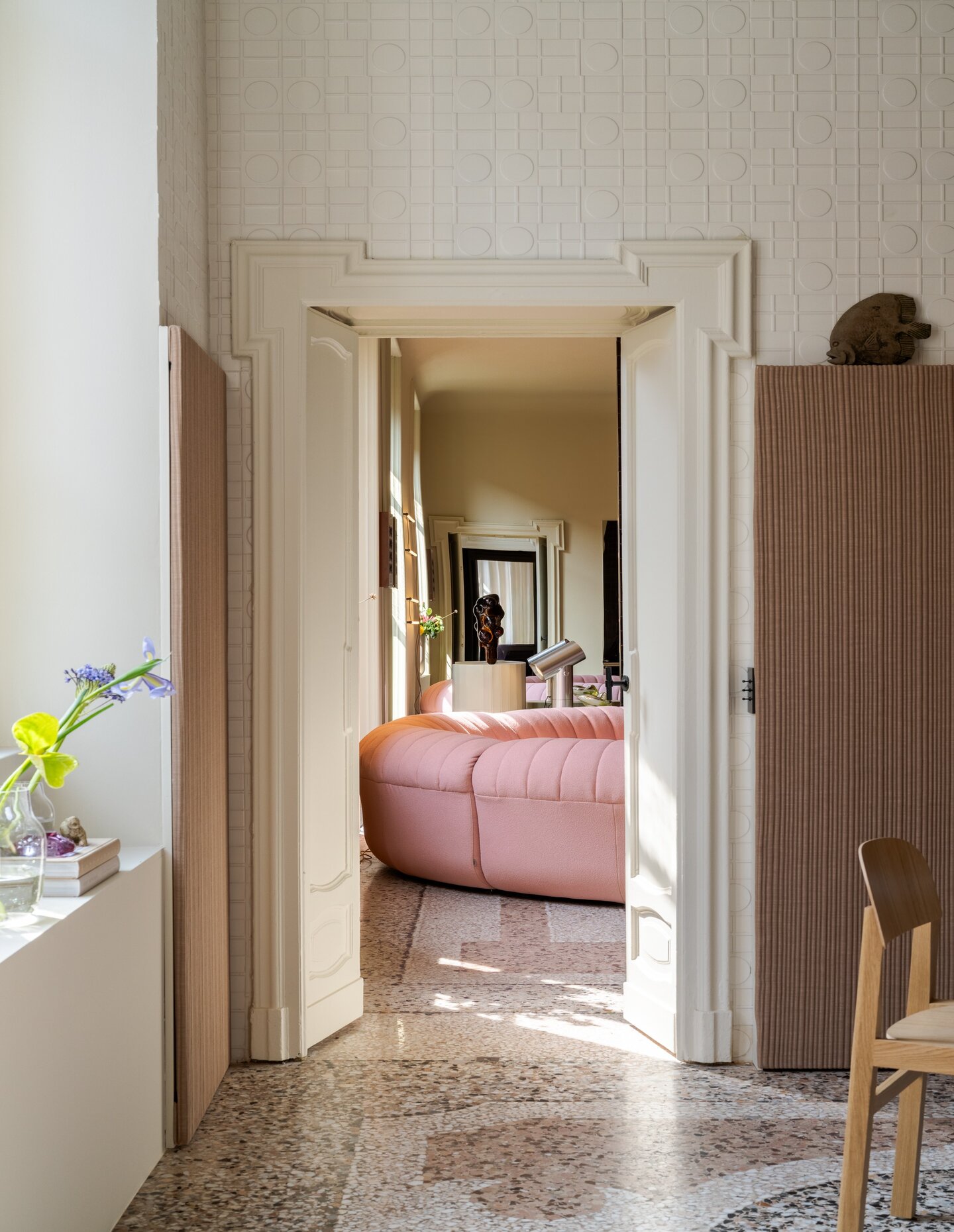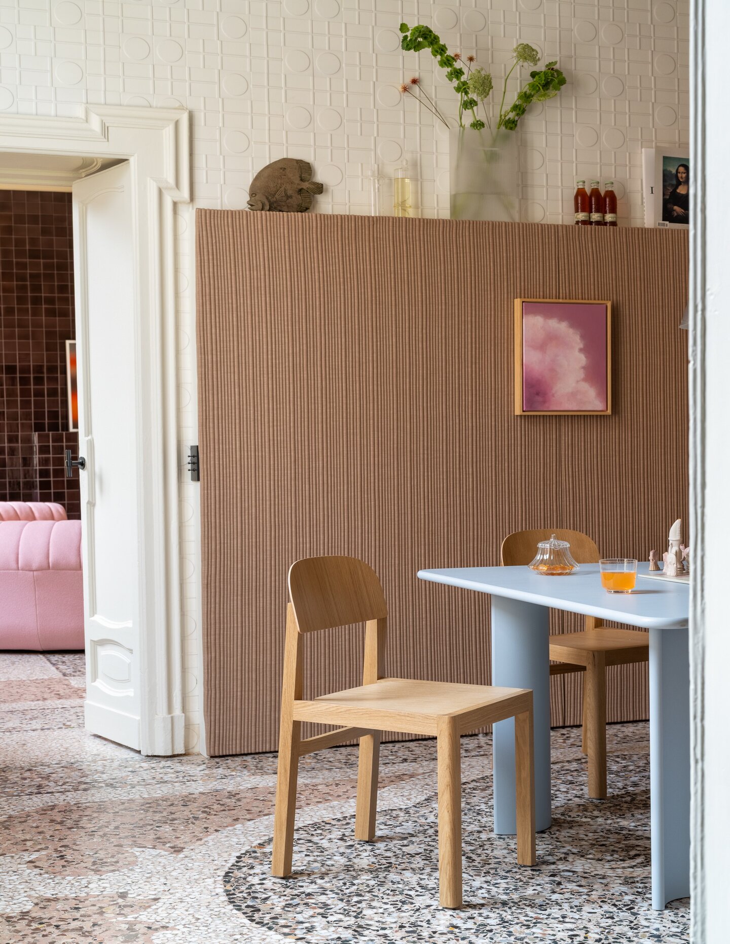 That same attitude carries through to the debut of the Coltre Modular Sofa by Studiopepe, which sits at the centre of the installation. Named after the Italian word for blanket, Coltre is designed as a sculptural modular system with a quilted textile layer draped over a more structured base. The parallel stitched lines give it softness and volume without losing clarity, and the piece can expand into larger configurations or stand alone in lounge-chair form. It is an apt addition to a presentation concerned with comfort as something emotional as well as physical. The apartment’s strength lies in that overall balance: it doesn’t overstate its ideas, but instead suggests that good domestic design can support everyday life without ever becoming overly polished or prescriptive.