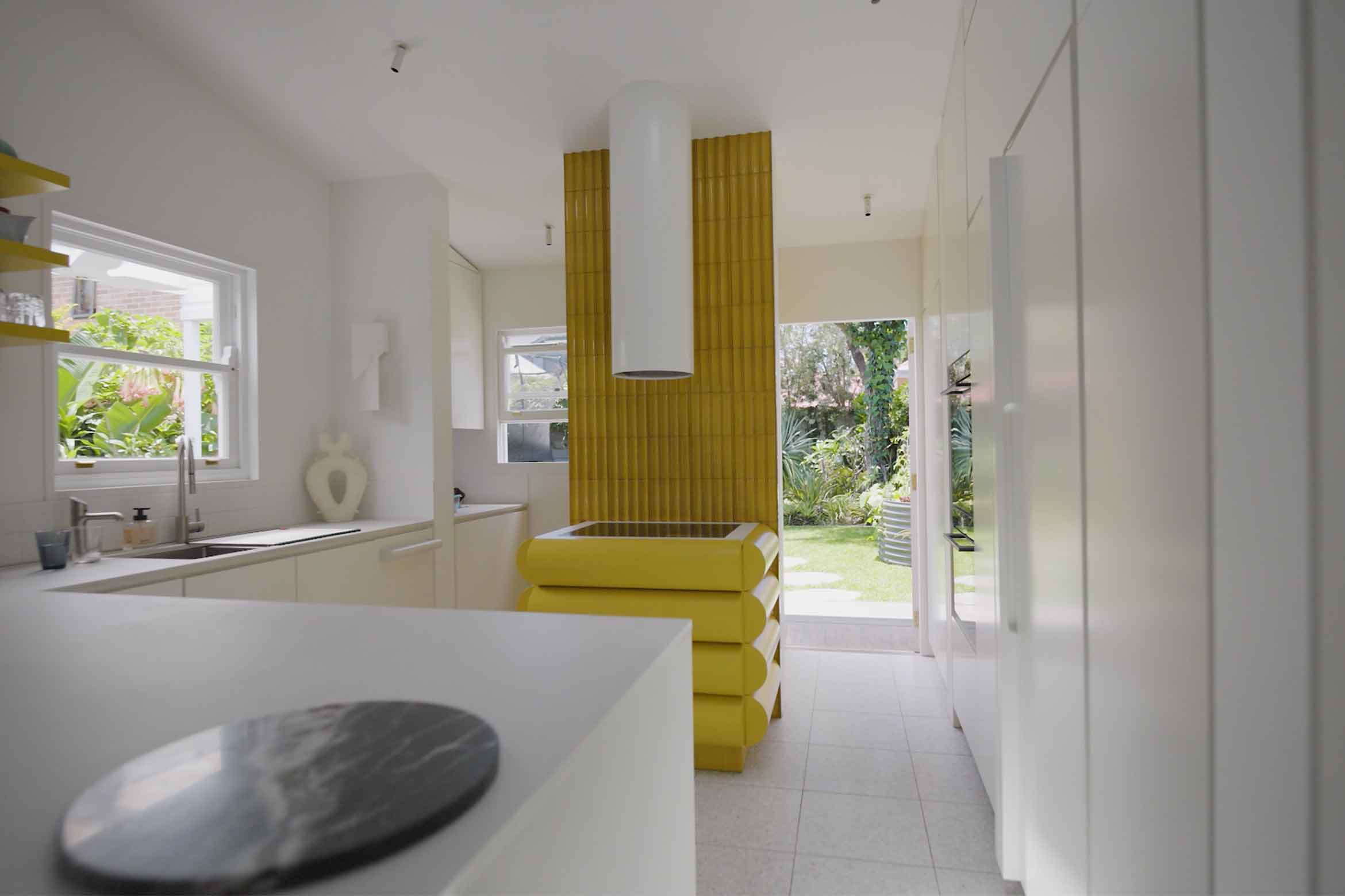 By removing walls and adding essential openings, Charlotte established a circular flow that connects the kitchen to the garden, deck and dining area, while a new skylight floods the room with ample natural light. The space is defined by clean lines, honest materiality and a balanced palette – Charlotte’s conscious effort not to overpower the art. The timeless foundation of muted grey and white is punctuated by sunny spills of yellow that highlight some of the most distinctive design elements, like the striking stand-alone honeycomb-like cooktop island set against a narrow wall of mustard tiles. “Because of its central location, the cooktop needed to feel meaningful and intentional, so I created this curved, bulbous object,” Charlotte explains.