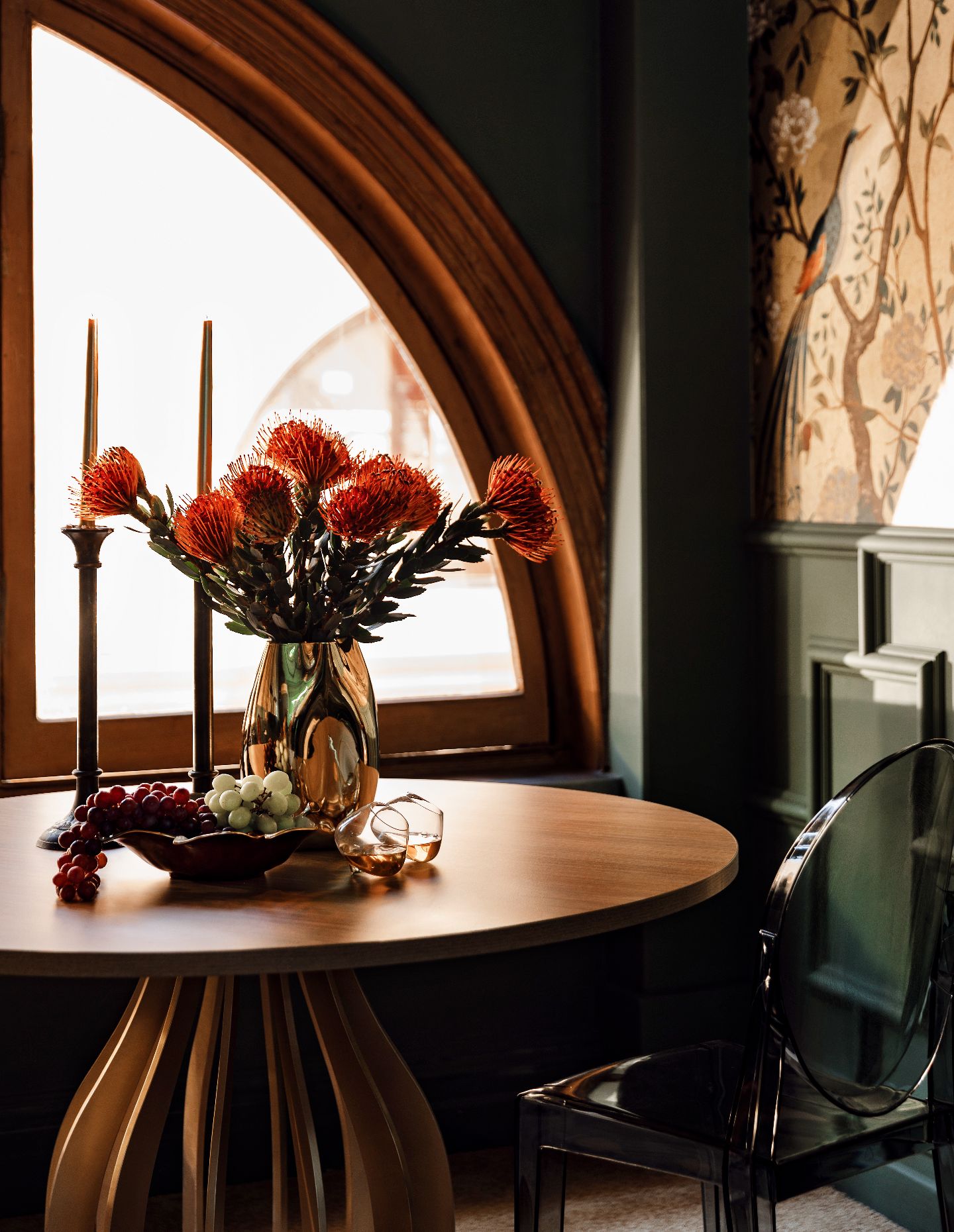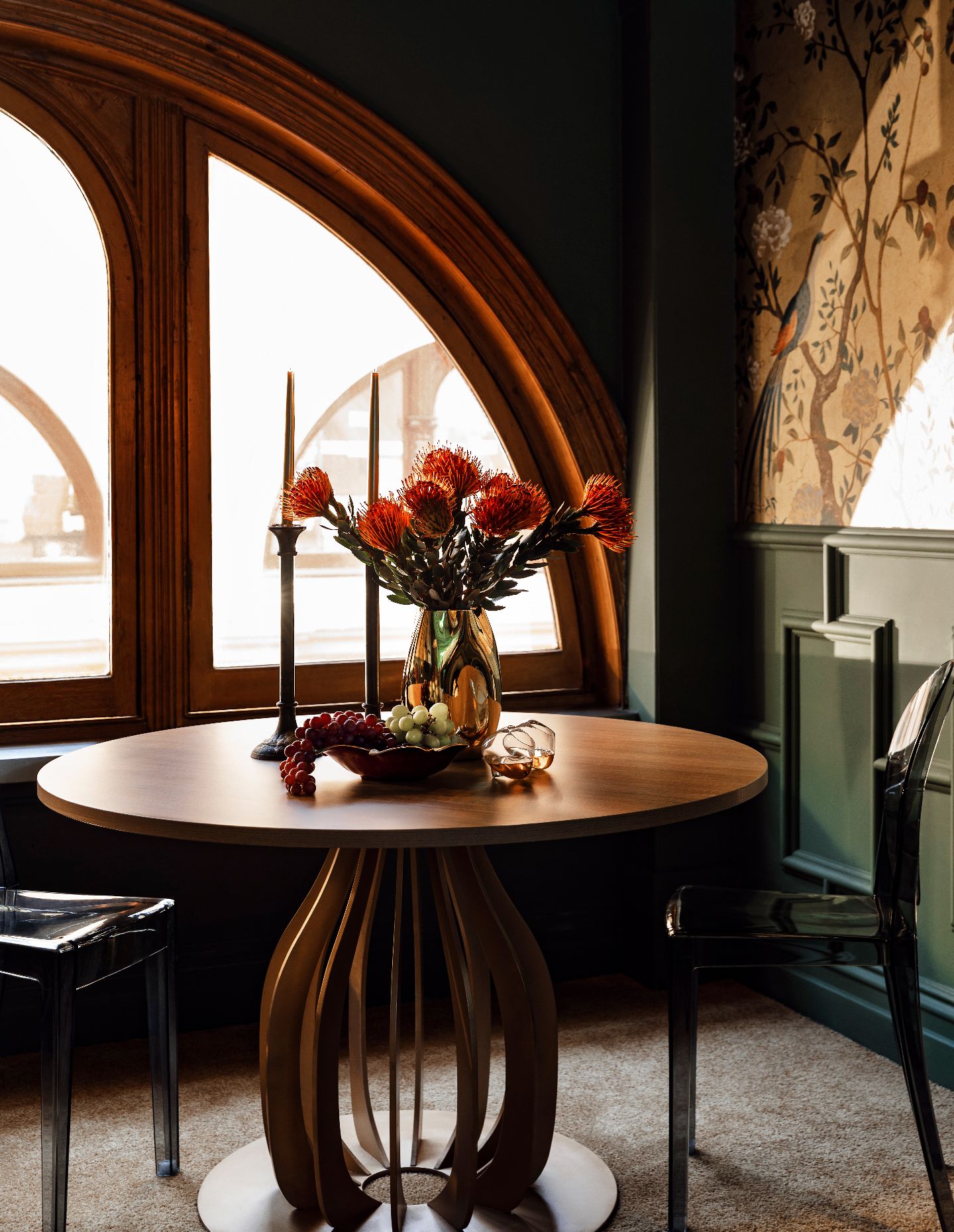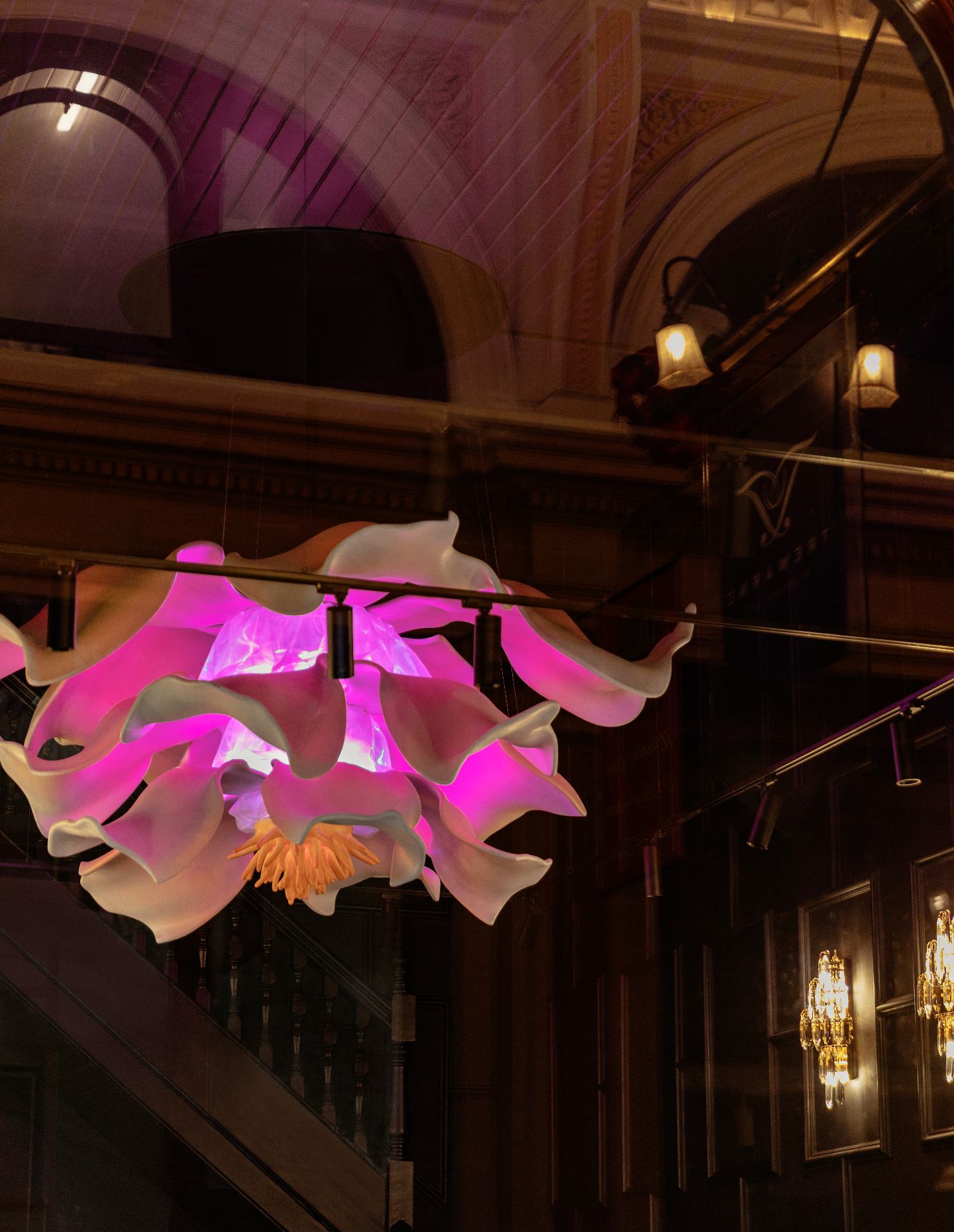 The sculptural light fitting remains a defining moment. Its scale and soft glow immediately transform the space and establish a sense of theatre within the arcade setting.