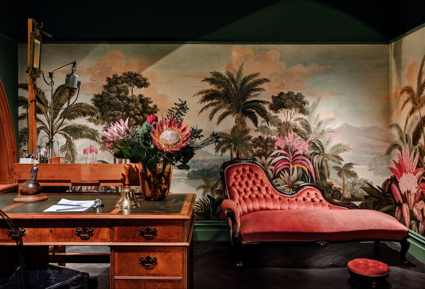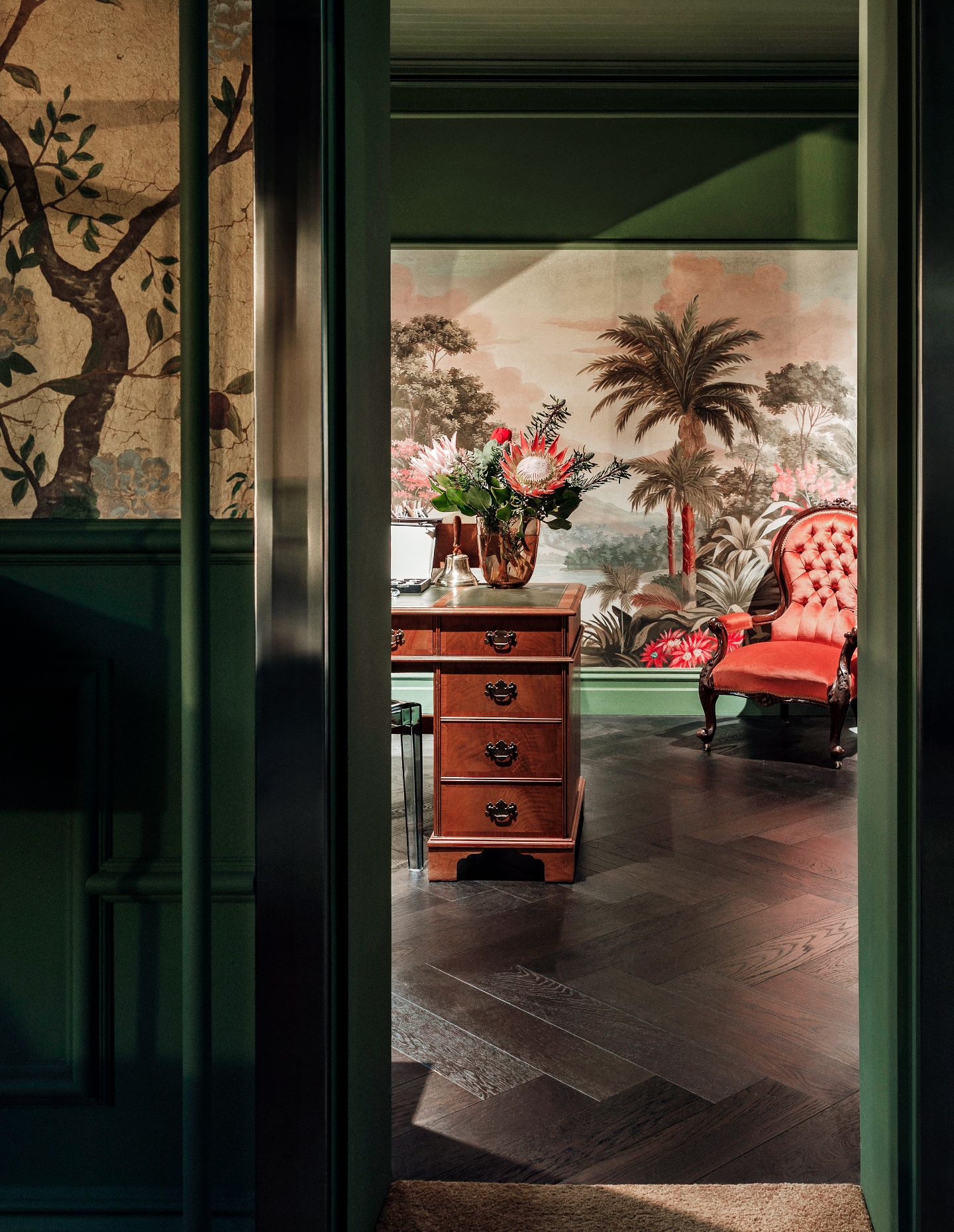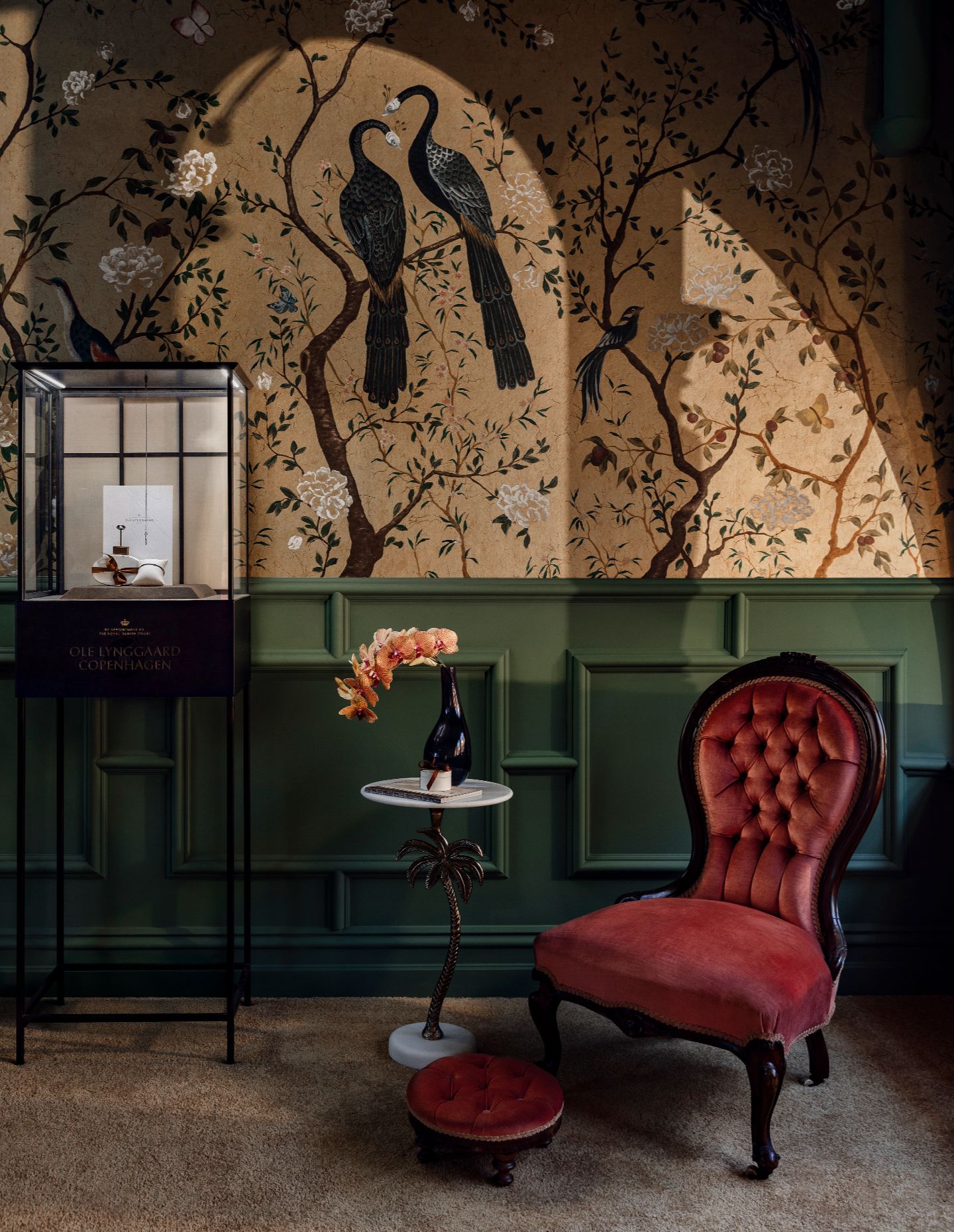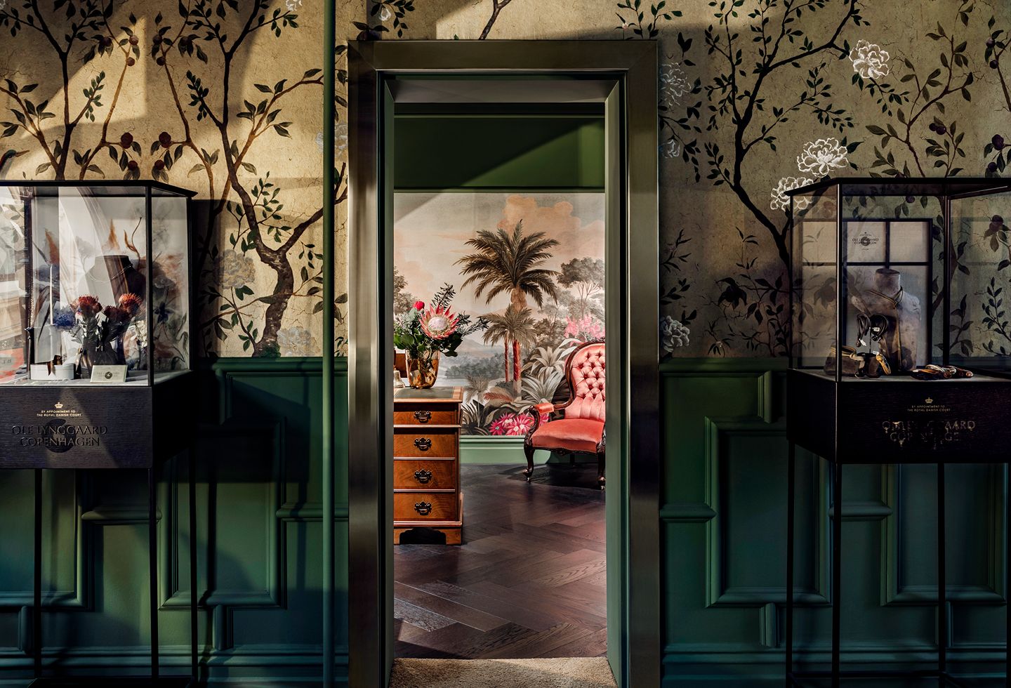 Rich wallpapers featuring botanical and Art Nouveau-inspired motifs bring a layer of romance and storytelling to the interior, complemented by bespoke inlay rugs that reinforce the project’s artisanal character. A custom-designed rug by Catherine Martin anchors the retail floor and helps define the spatial centre of the store.