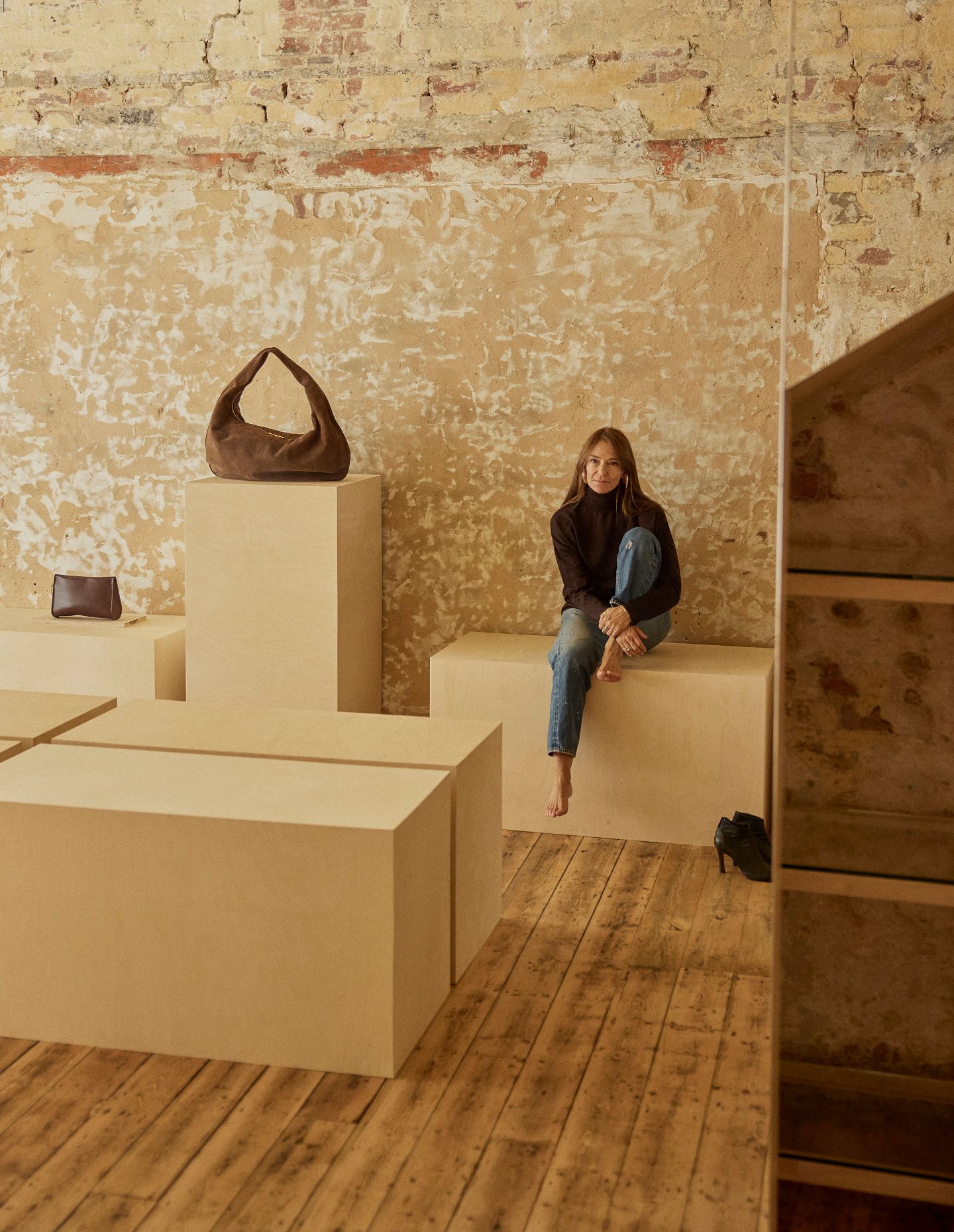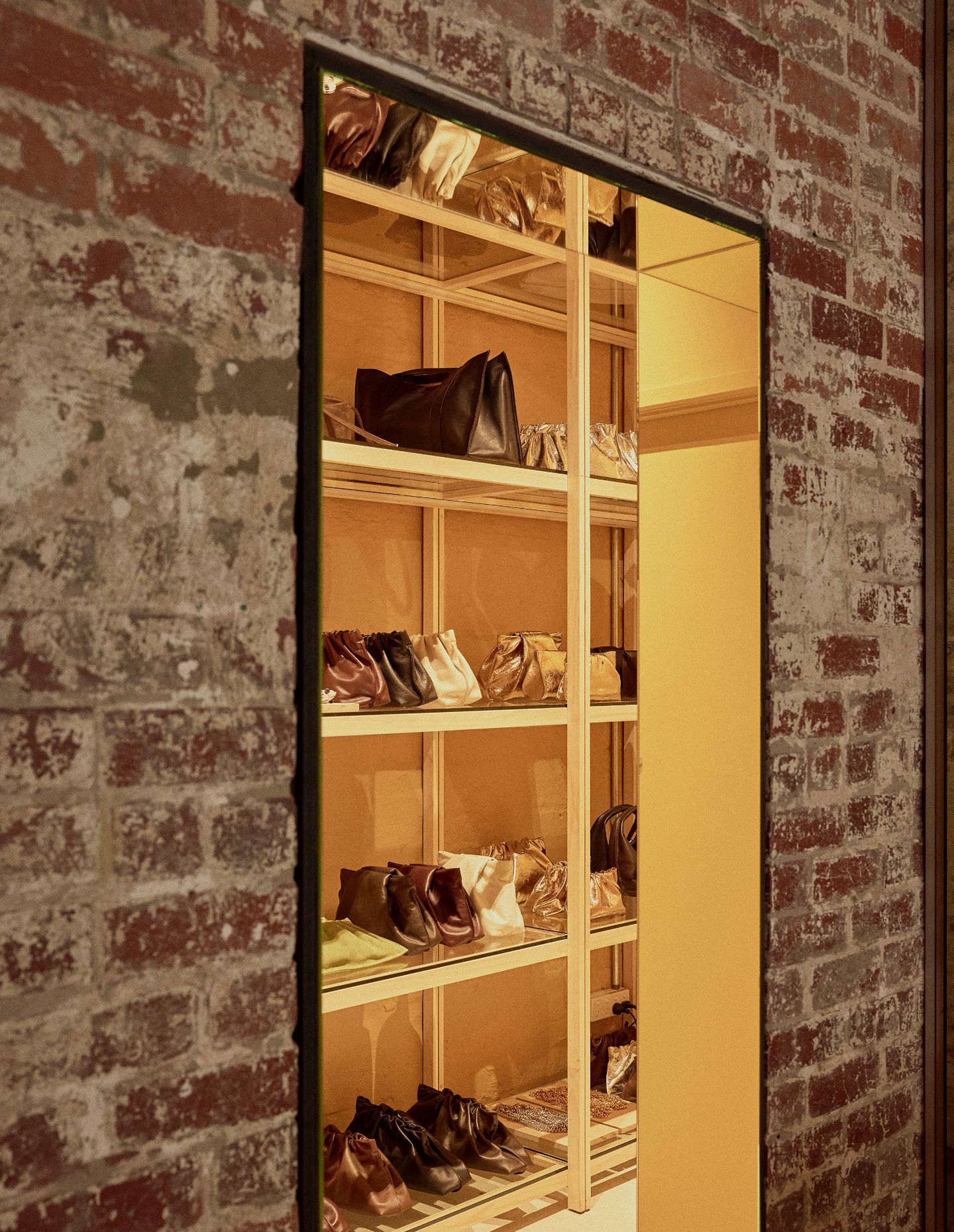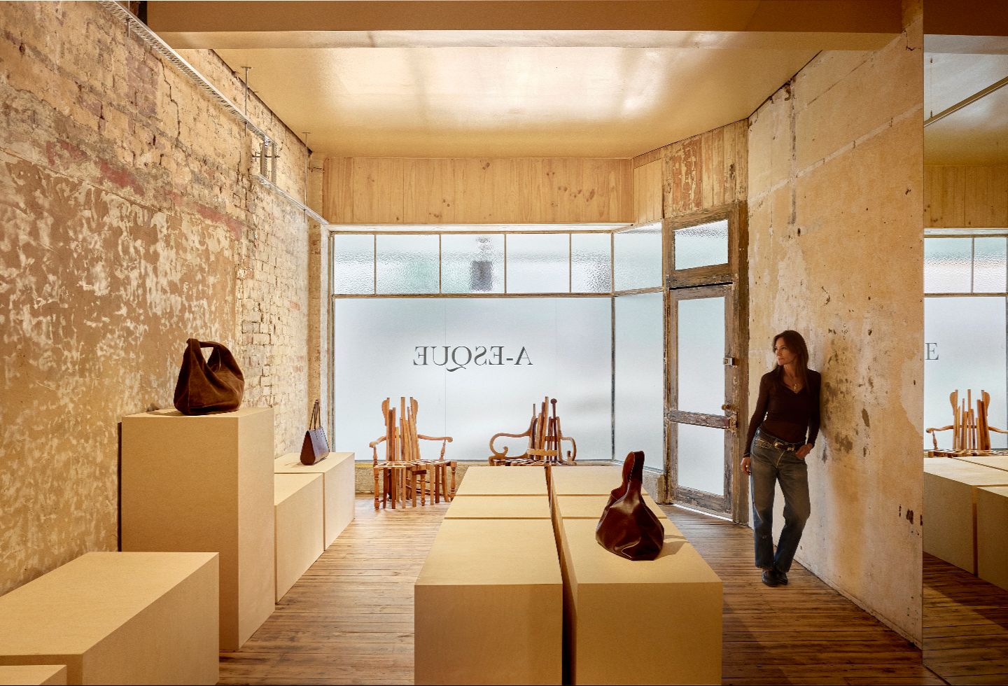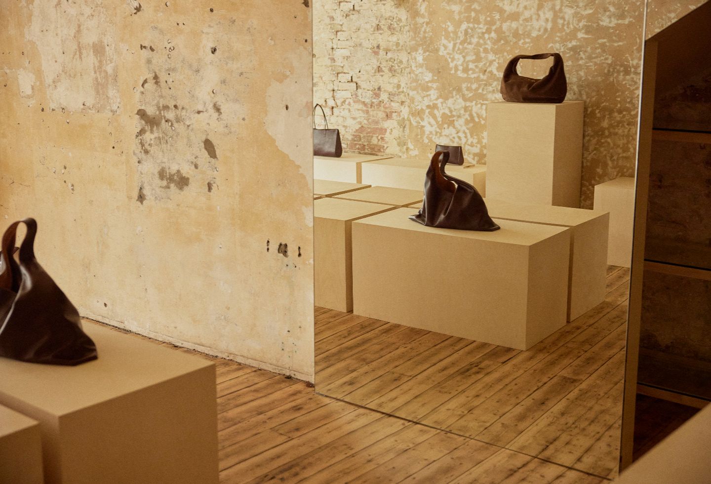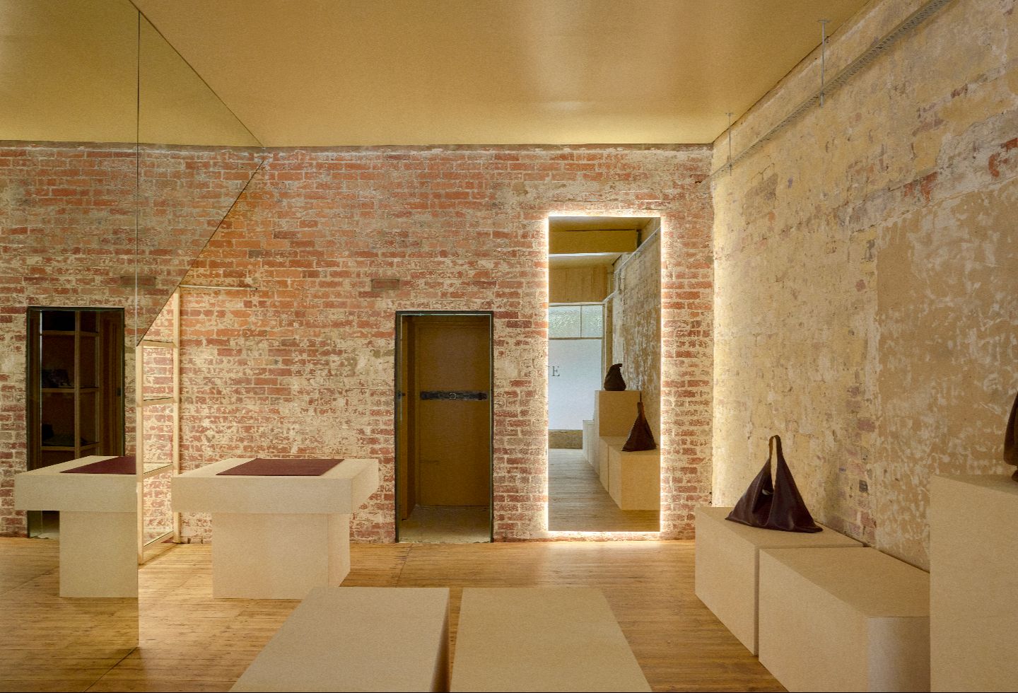 The space is very much a sum of its parts, with the stripped brick and plaster walls as the anchor — they carry the history of the building in a way that no applied finish ever could. The sanded floors have a quietness and warmth that grounds the whole space. And then there are the mirror moments — carefully positioned to expand the room and catch the light — alongside the premium ply plinths, which bring a refined, tactile quality to how the objects are presented.