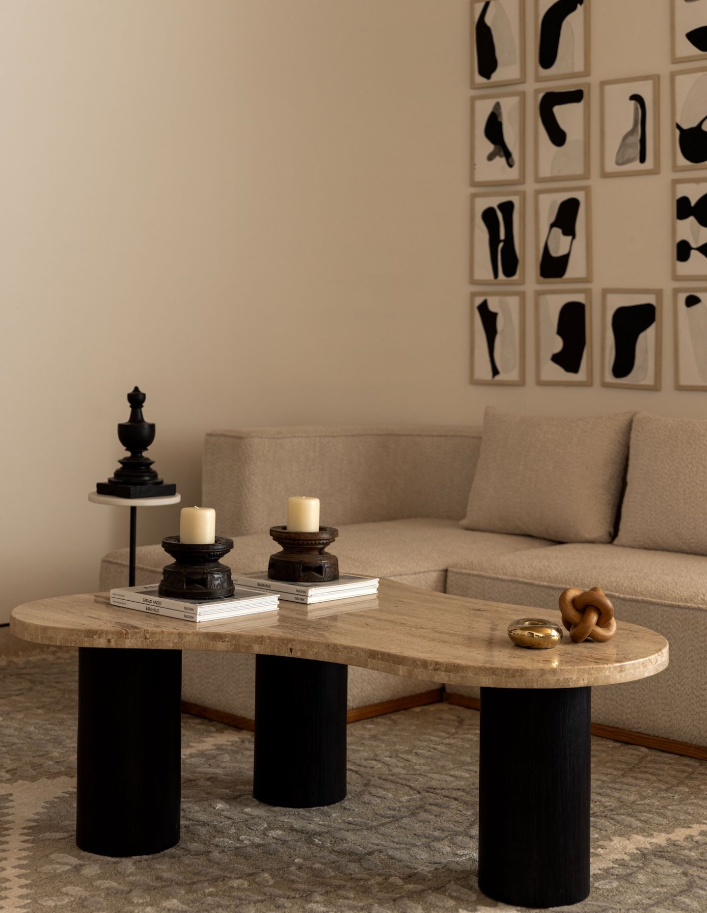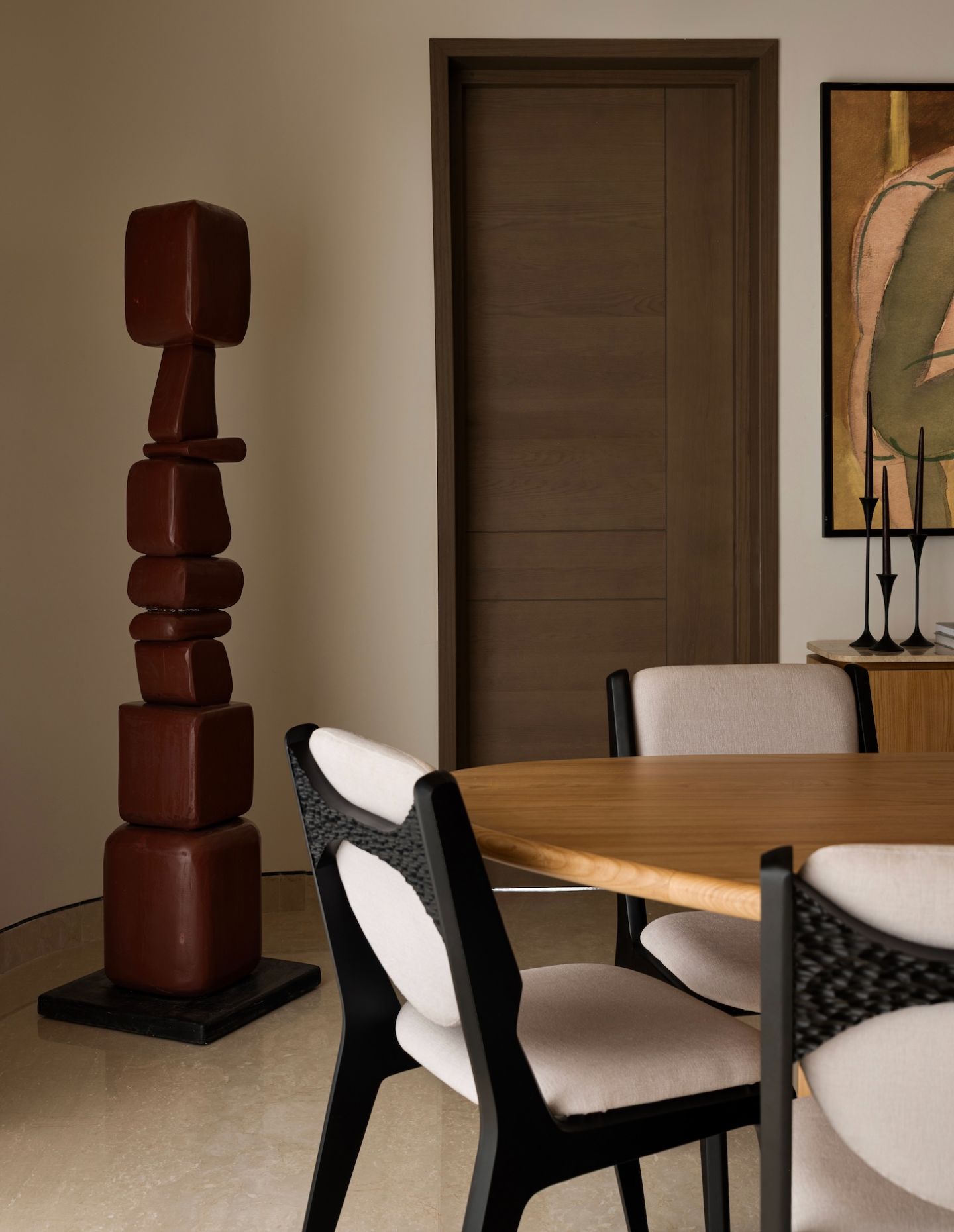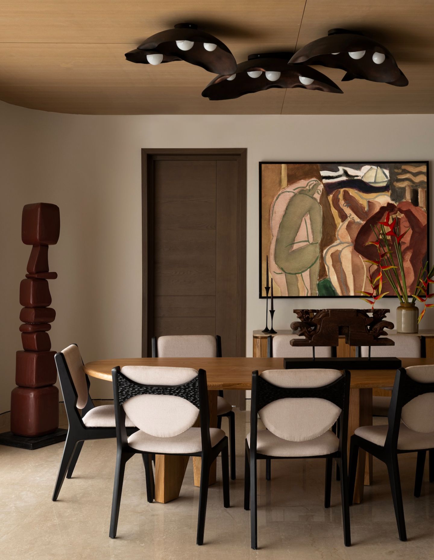 Custom totems anchor corners with sculptural presence, while the marble-clad coffee bar introduces geological weight. The bespoke spline sofa mediates between formal and informal zones. Lighting became a defining element — artisanal fixtures casting soft shadows across oak and stone.