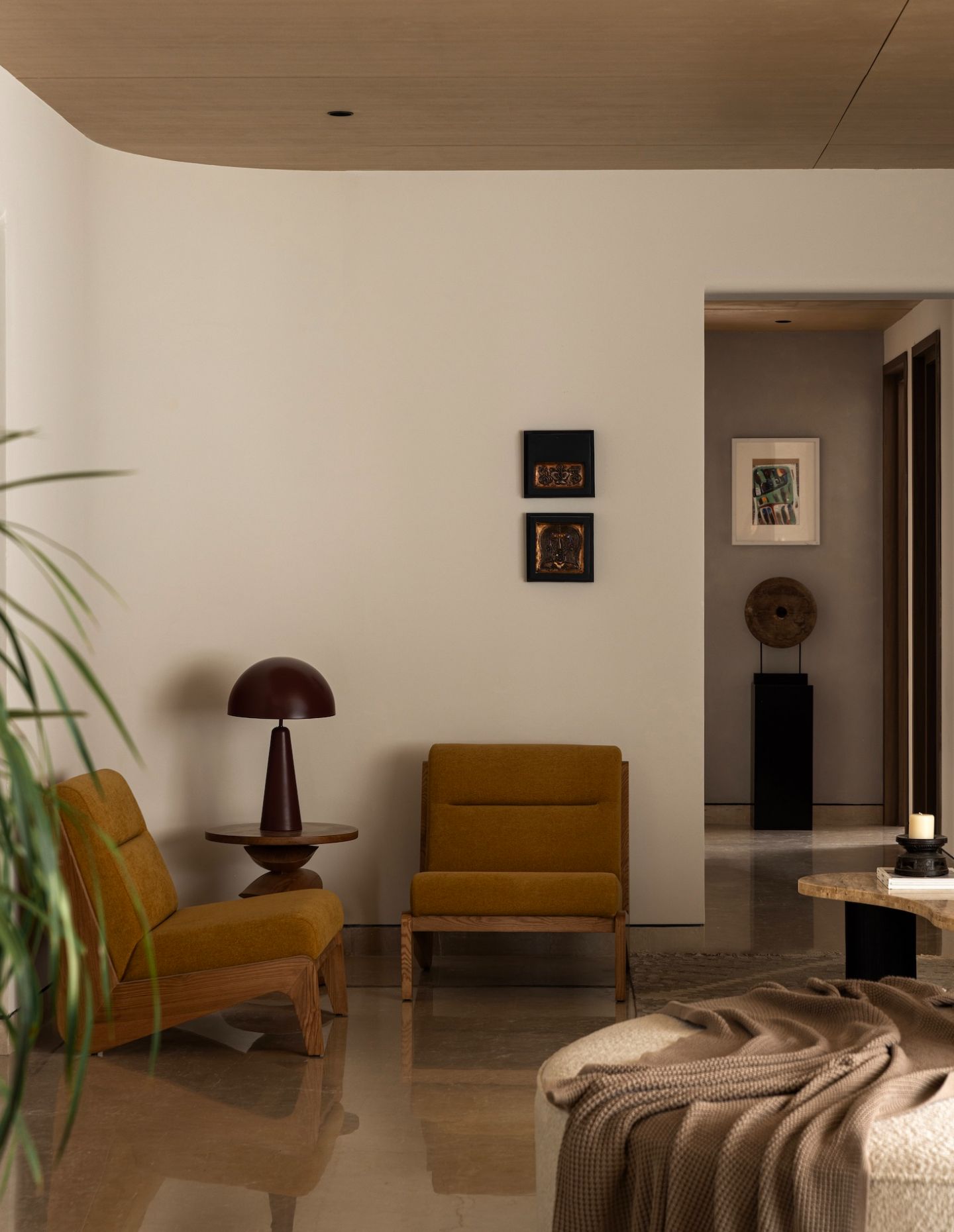 The project privileges bespoke and artisan collaborations over mass production. Furniture was custom-designed by Alara & Magari, lighting developed with Shailesh Rajput Studio, and rugs sourced from Jaipur Rugs. Vintage South Indian artefacts from HB Studio introduce layers of cultural memory.