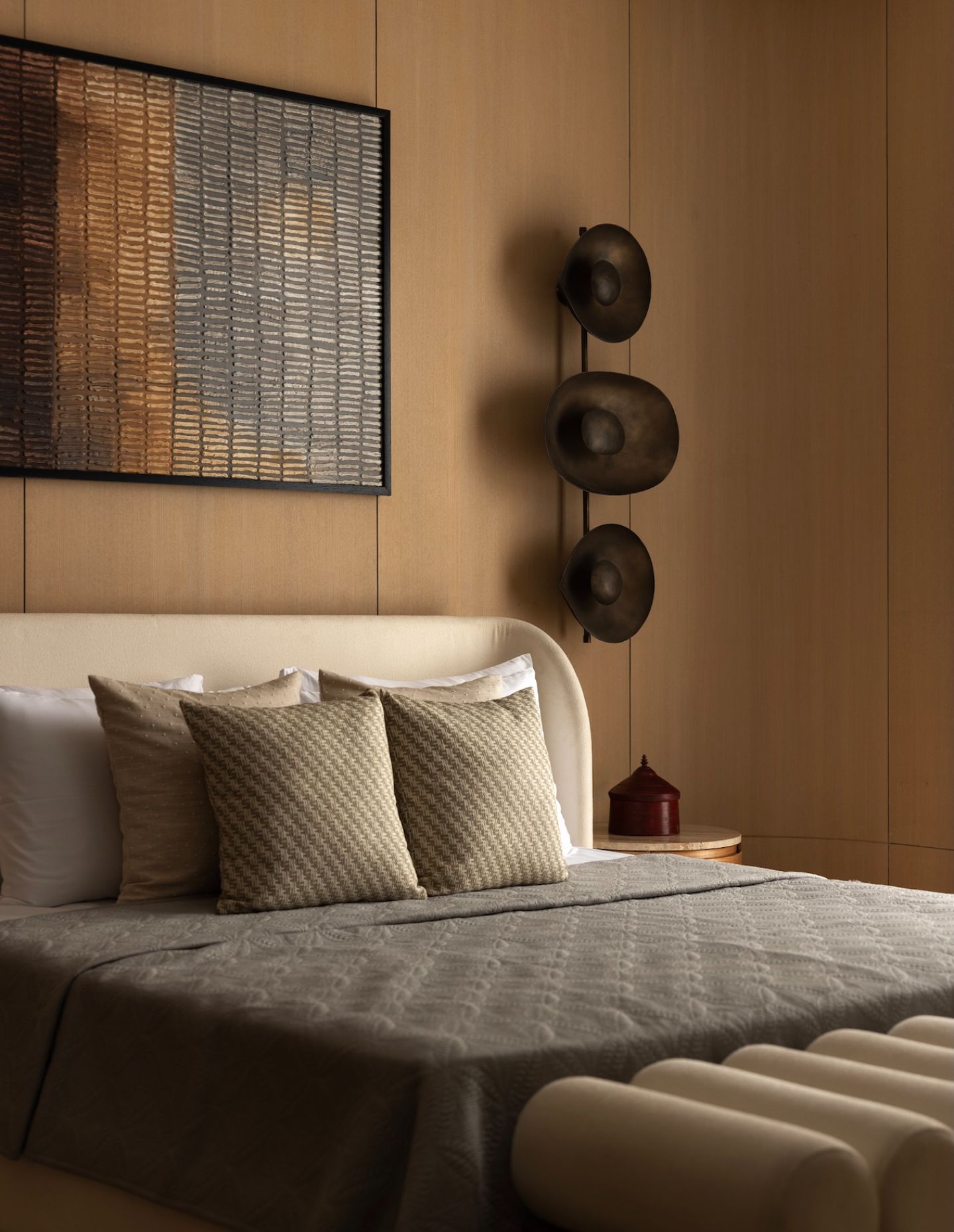 Lighting was integrated as architecture. Concealed washes, sculptural sconces and warm tonal temperatures create usability without visual disruption. Circulation remains fluid, while each zone feels anchored and resolved.