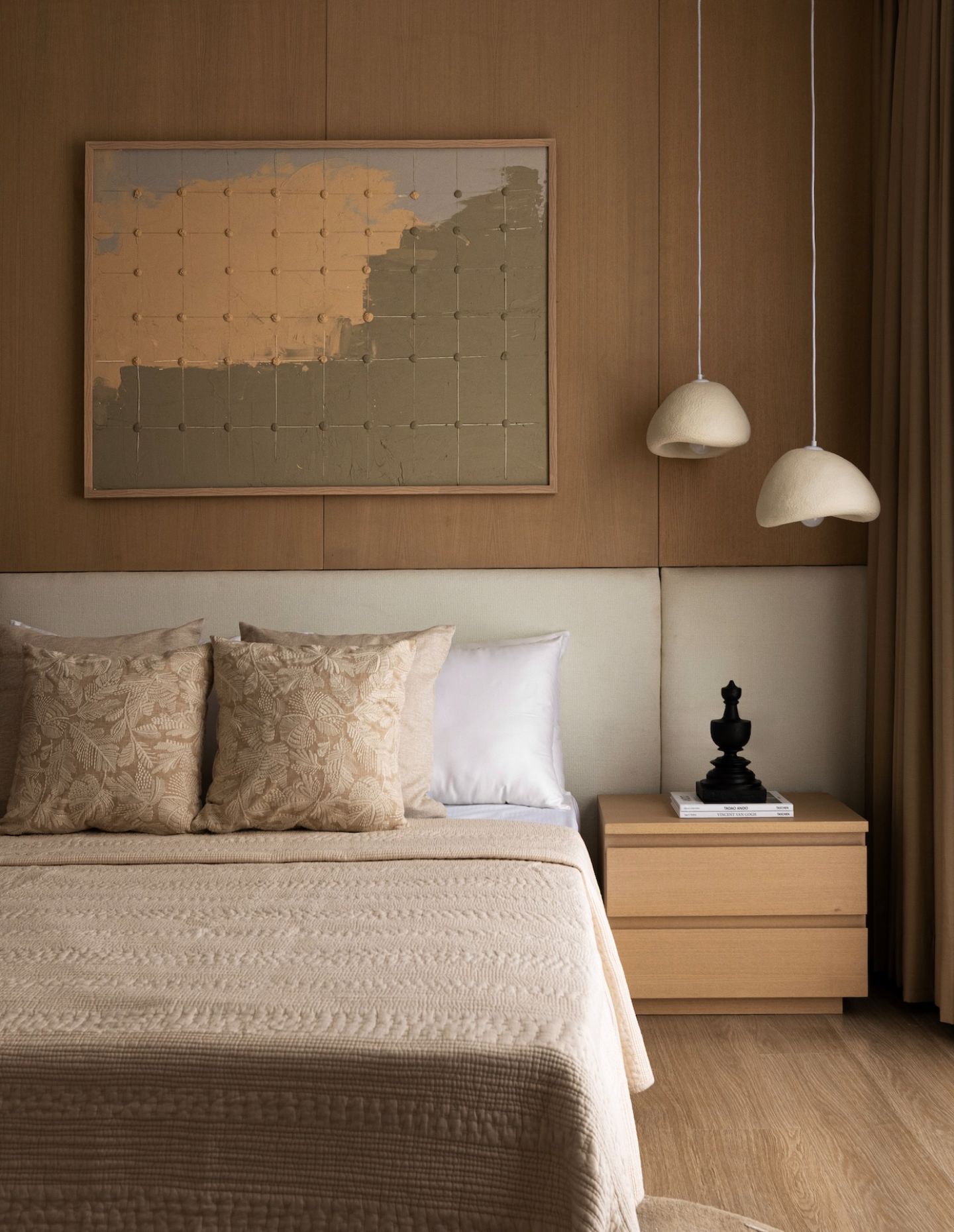 Textiles, sheers and handcrafted lighting temper the solidity of oak and stone. Structural intervention remained minimal; refinement was achieved through detailing and artisanal execution rather than demolition.