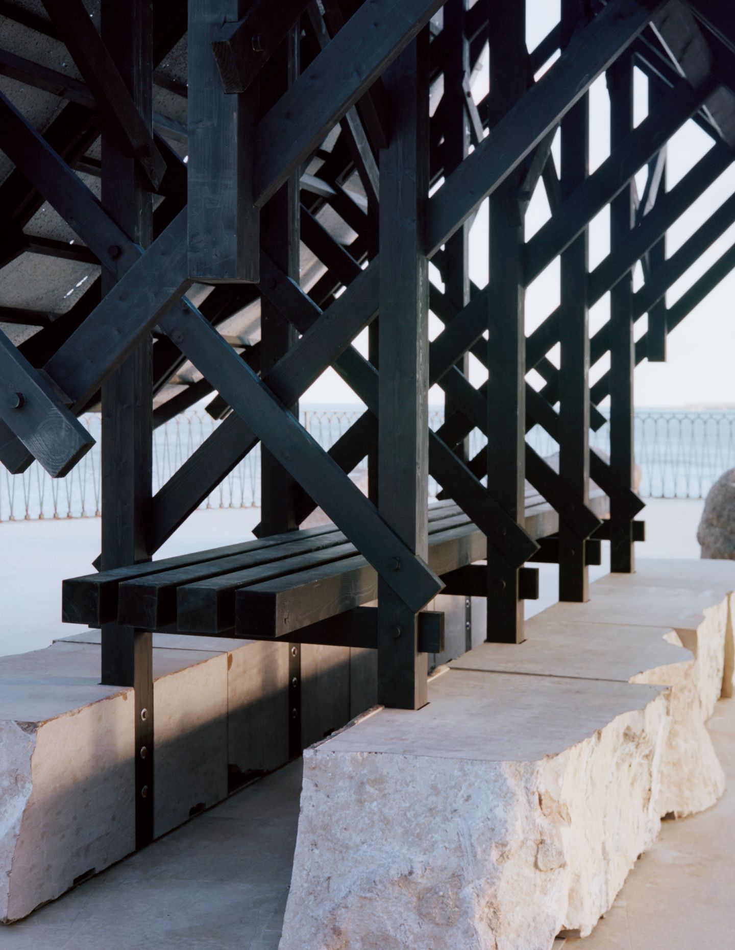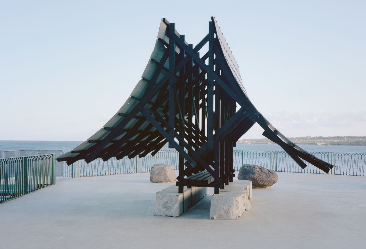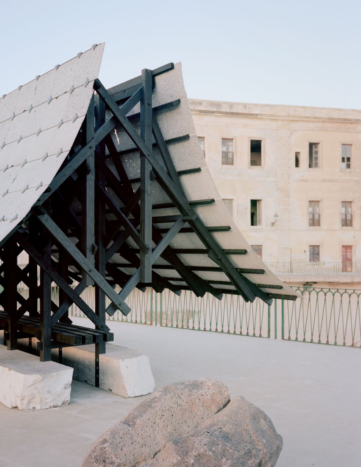 Using lava stone from the nearby Etna volcano, local wood sealed by fire, Pietra Pece limestone, bronze and sheep wool felt, the structure offers a shaded space for reunion and reflection. The double asymptotic shape echoes both the cone of the volcano dominating the landscape of eastern Sicily and the excavation shape of the nearby latomie where stone was extracted since ancient times.
