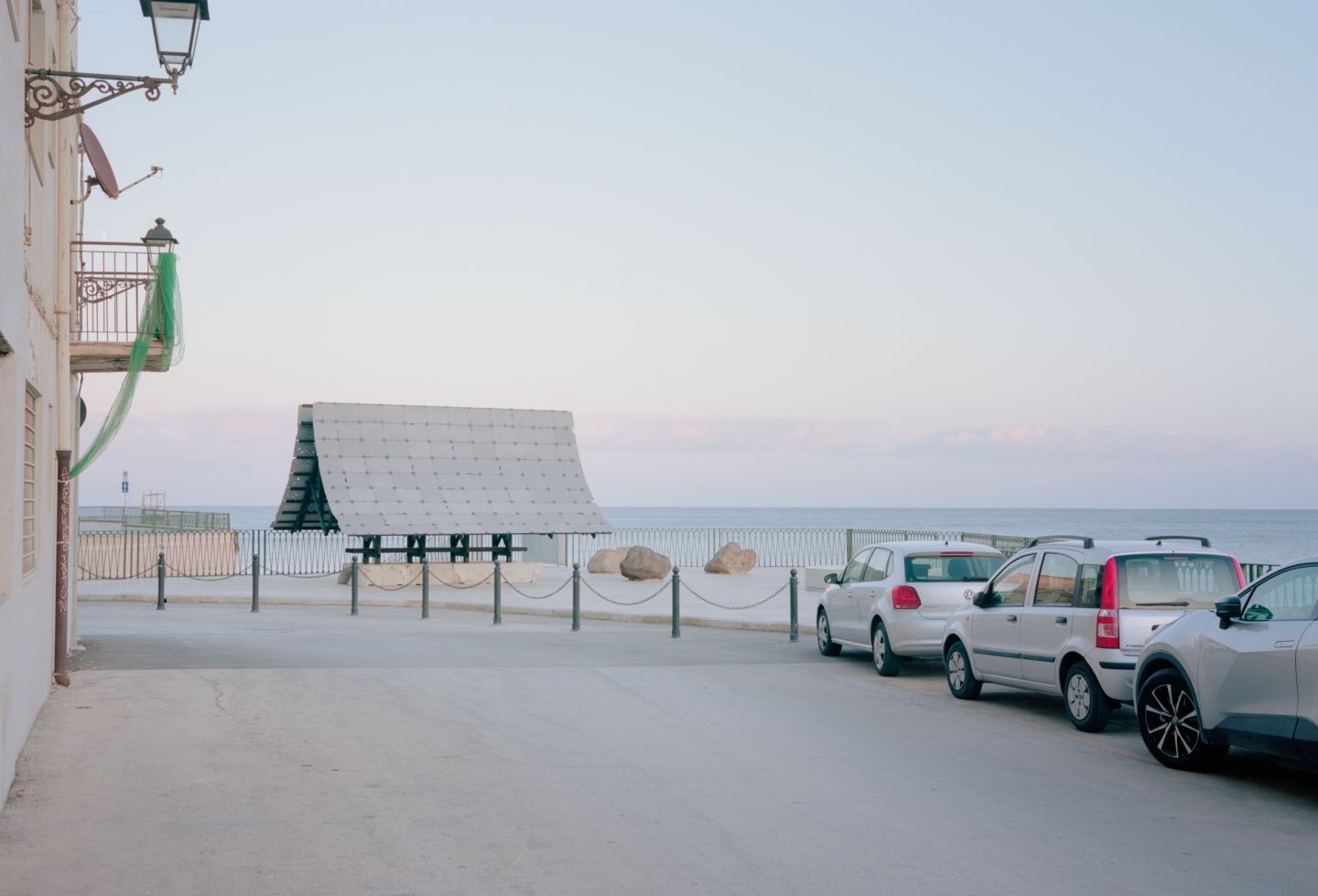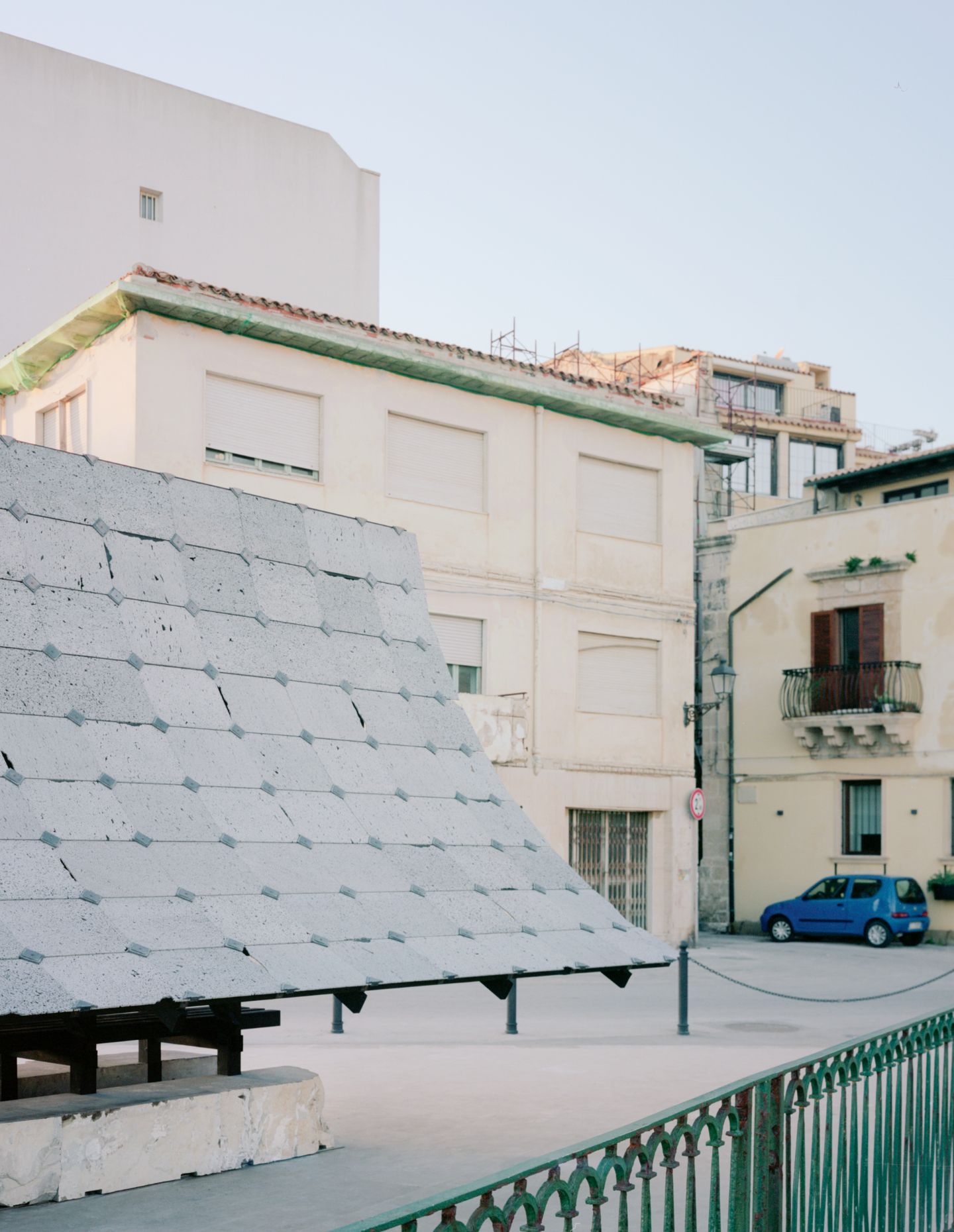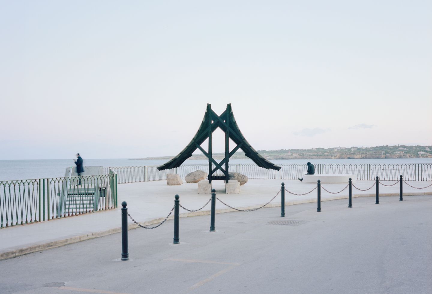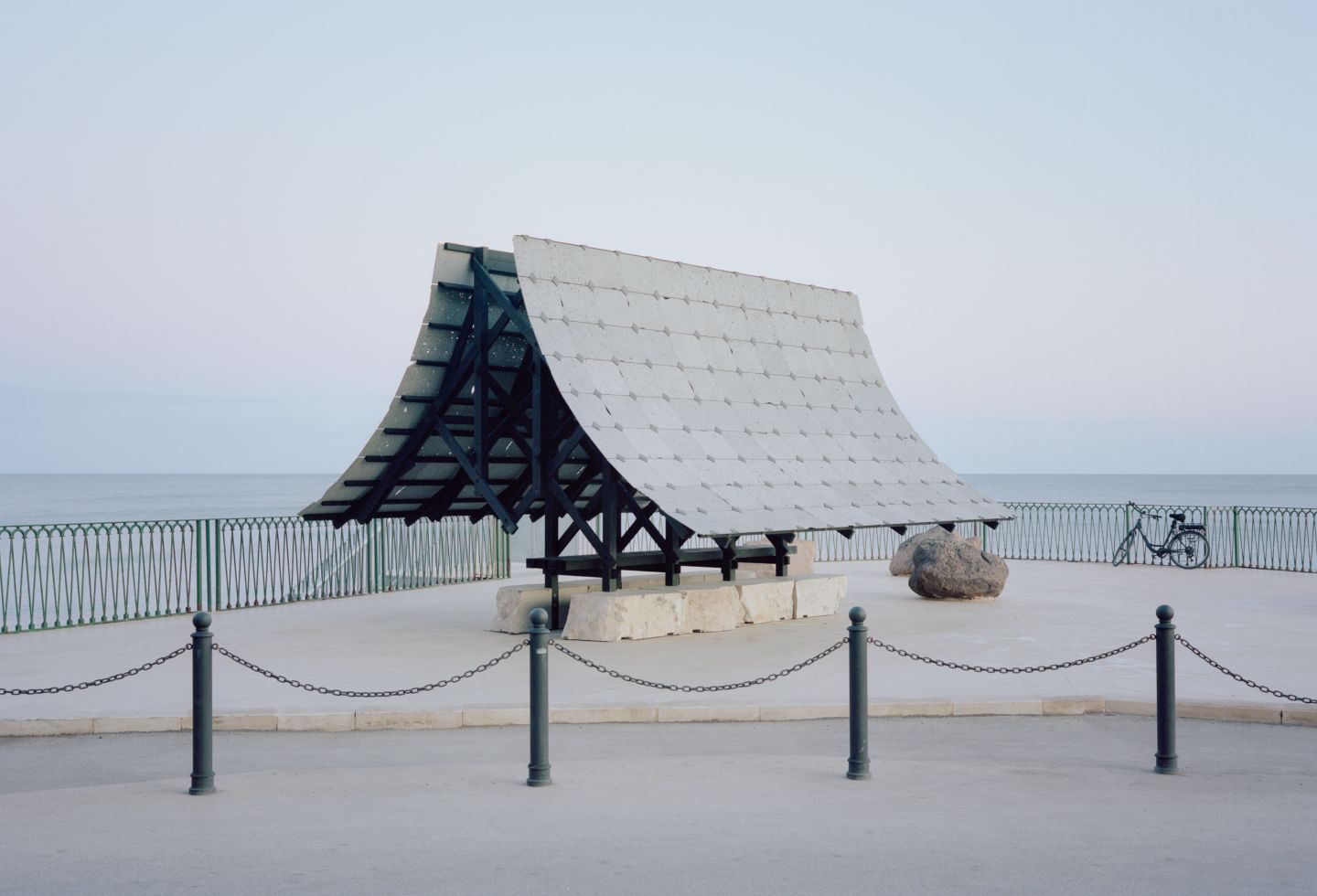 Using lava stone from the nearby Etna volcano, local wood sealed by fire, Pietra Pece limestone, bronze and sheep wool felt, the structure offers a shaded space for reunion and reflection. The double asymptotic shape echoes both the cone of the volcano dominating the landscape of eastern Sicily and the excavation shape of the nearby latomie where stone was extracted since ancient times.