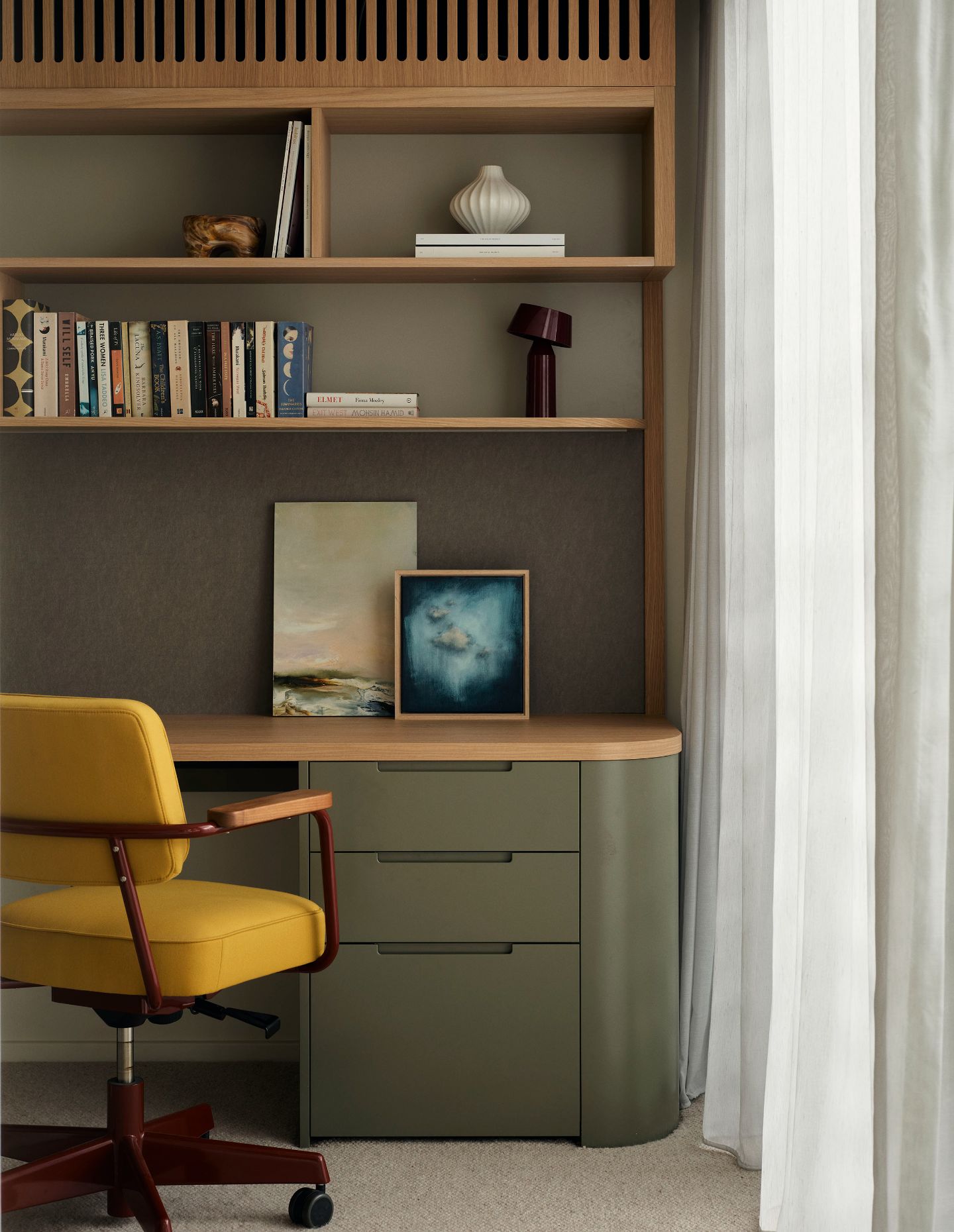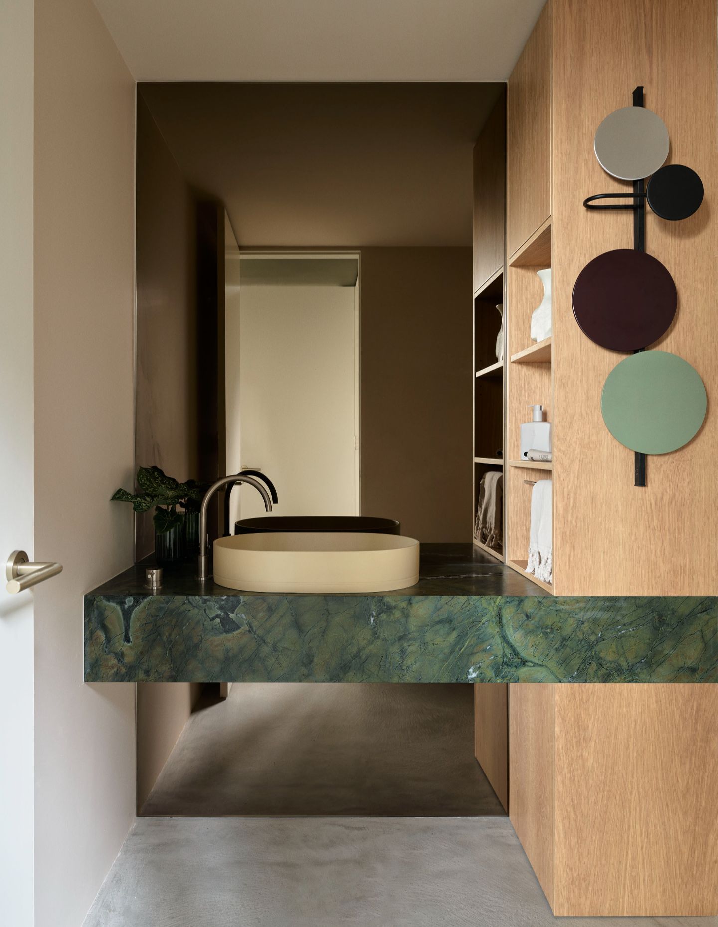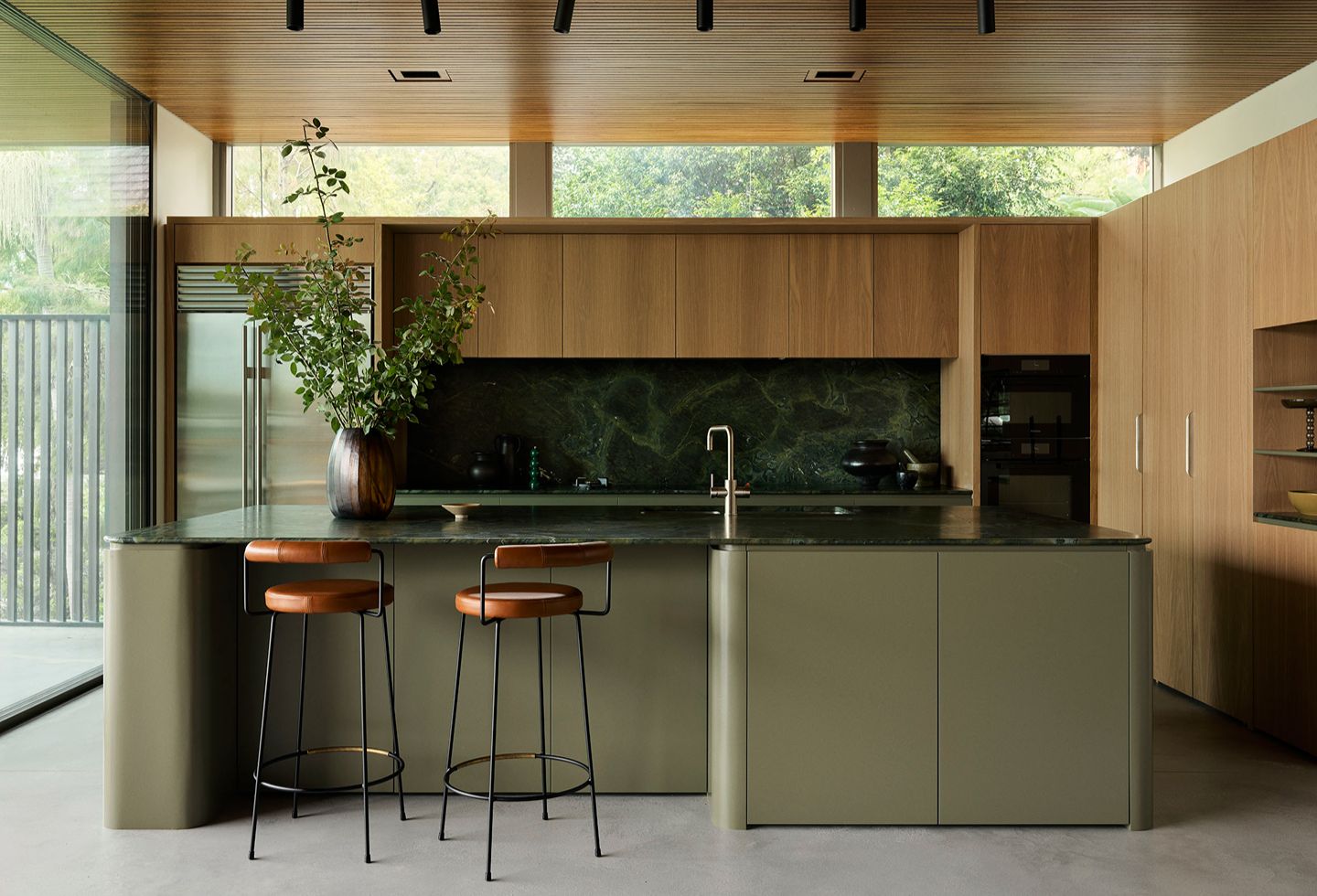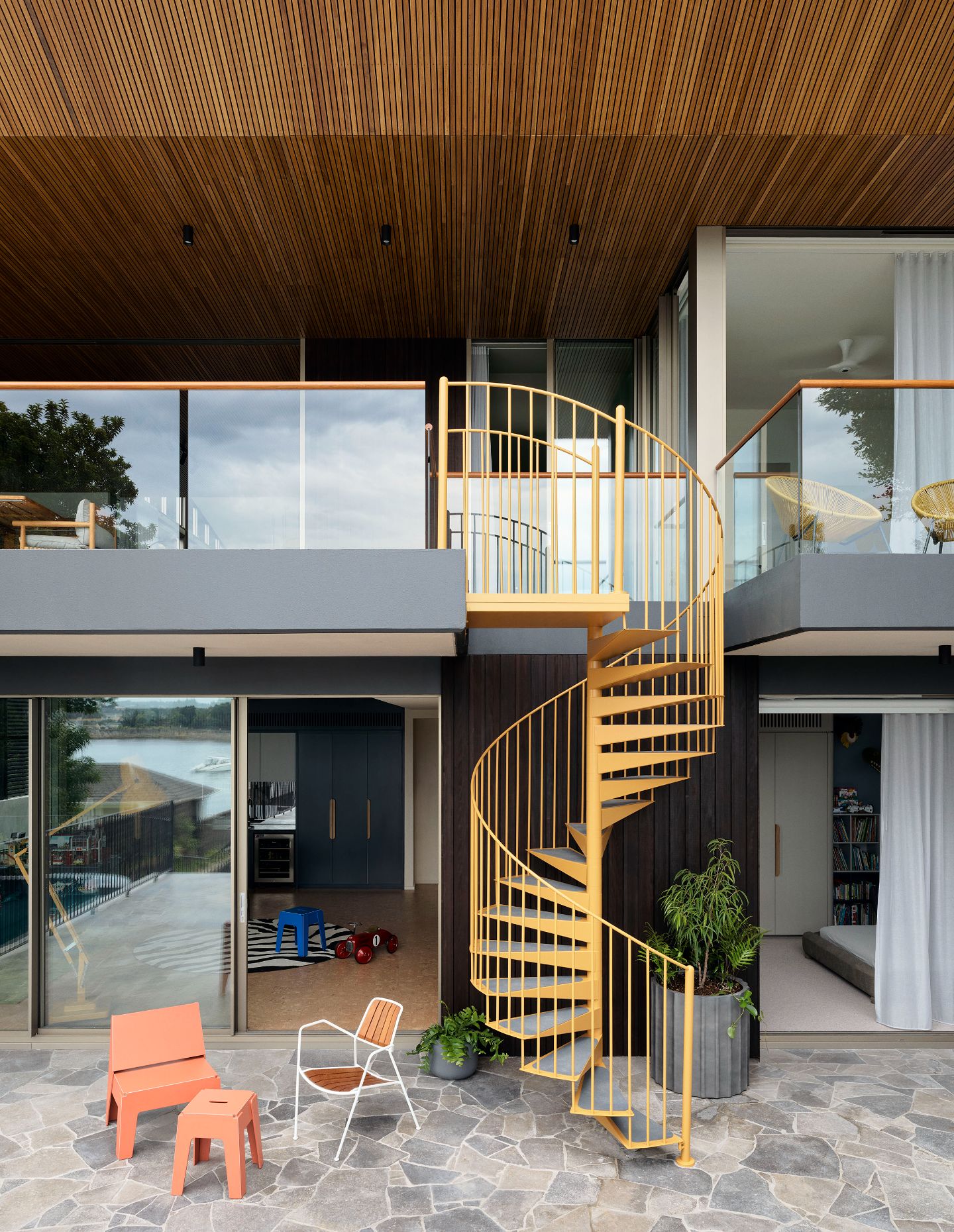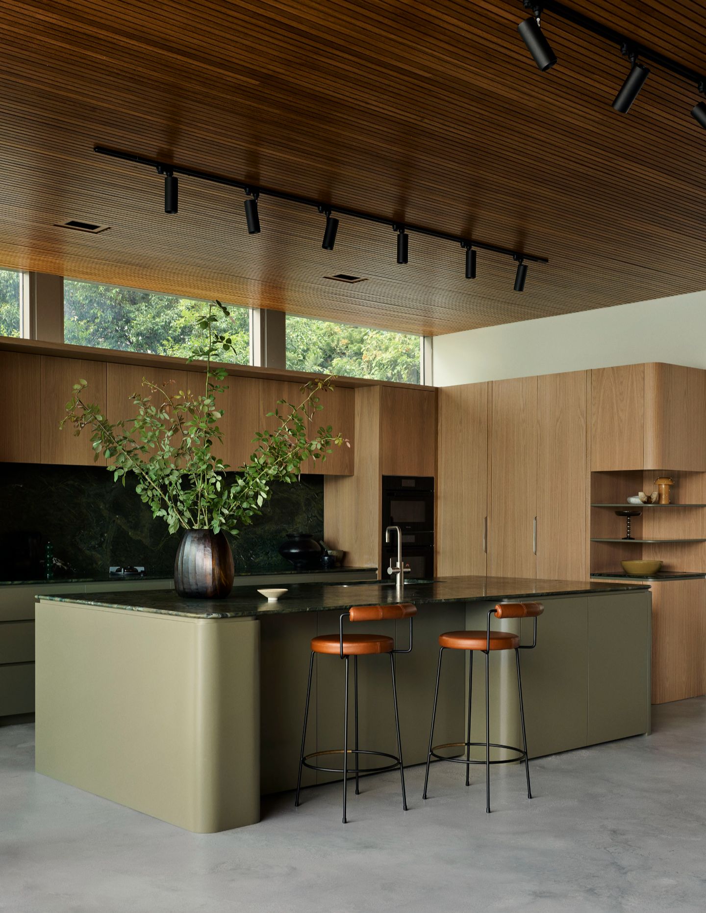 Throughout, Studio Johnston and the clients embraced a sense of play. The kitchen is anchored by deeply veined Artedomus ‘Bizanto’ stone, its green hues and shifting glimmers recalling the moody harbour waters, paired with cabinetry in muted greens. Mustard accents are deployed with intent, punctuating key thresholds. Tiled inserts beneath the fireplace, a pendant light over the banquette, and the external spiral stair connecting the terraces.