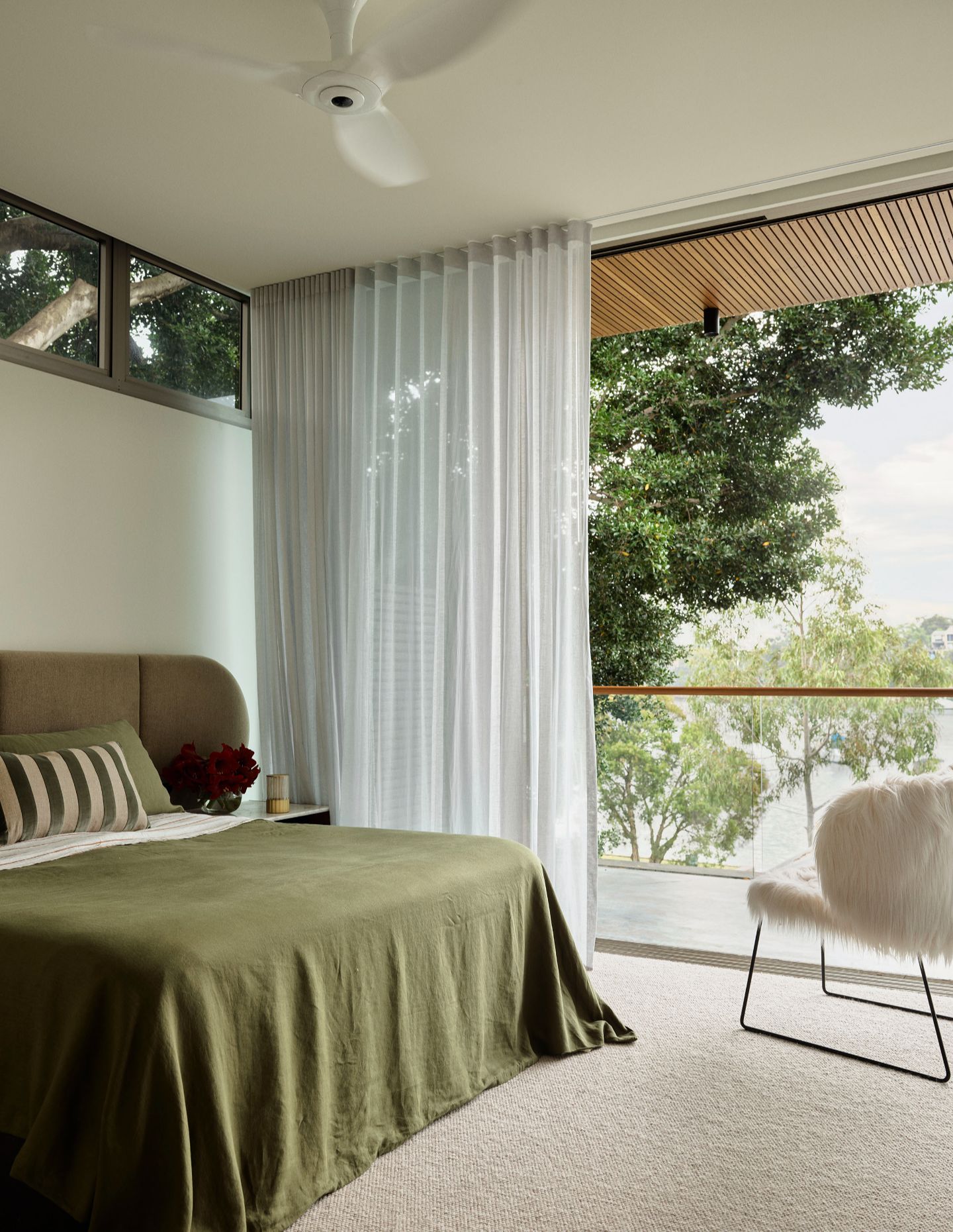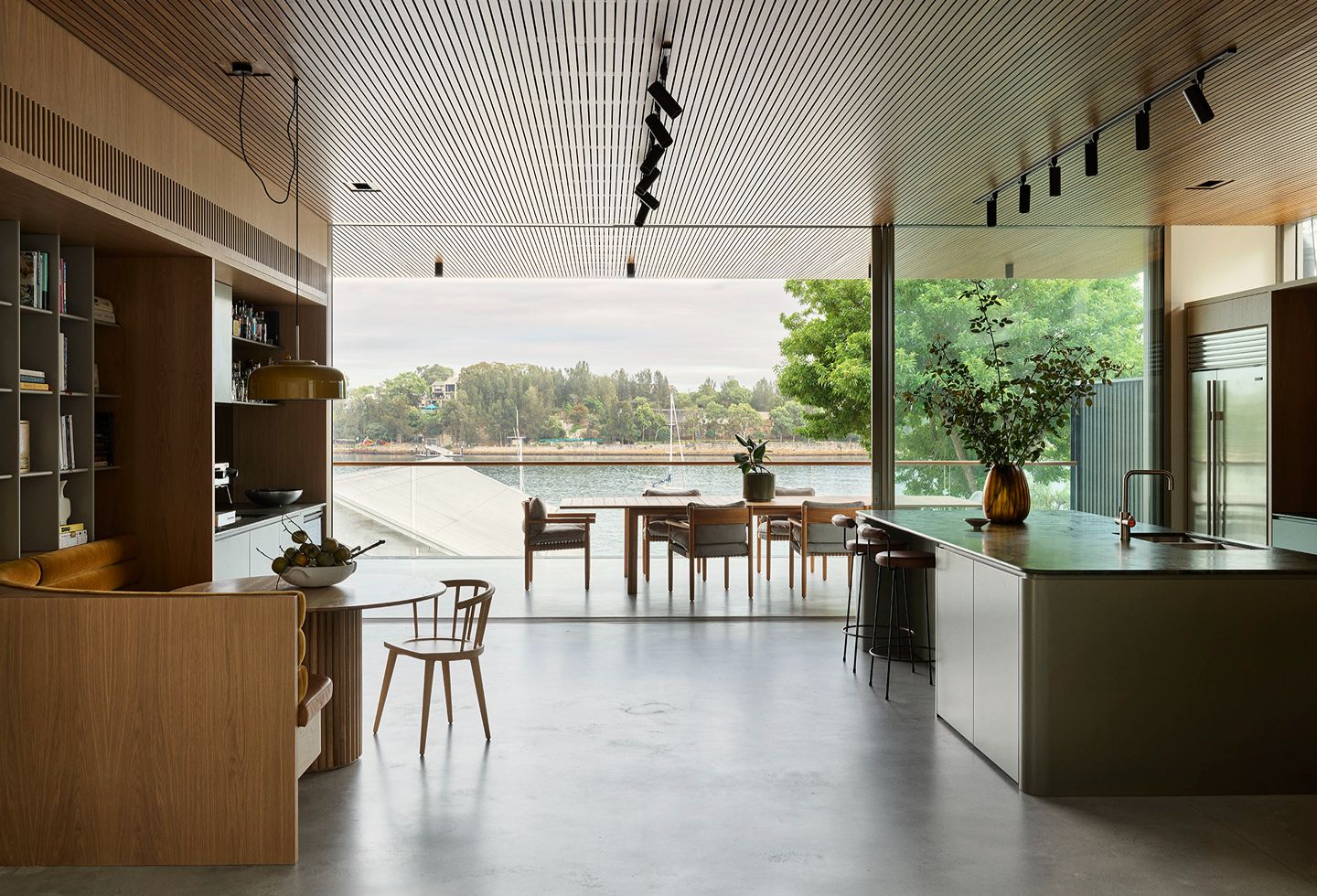 Light now filters through generous glazing, with soft curves in walls, bulkheads, and joinery gently delineating space. Timber ceiling panels extend the eye toward the vistas, adding warmth and rhythm, while floor-to-ceiling Kazimir windows replace the original waterfront glazing, maximising the views with razor-thin frames.