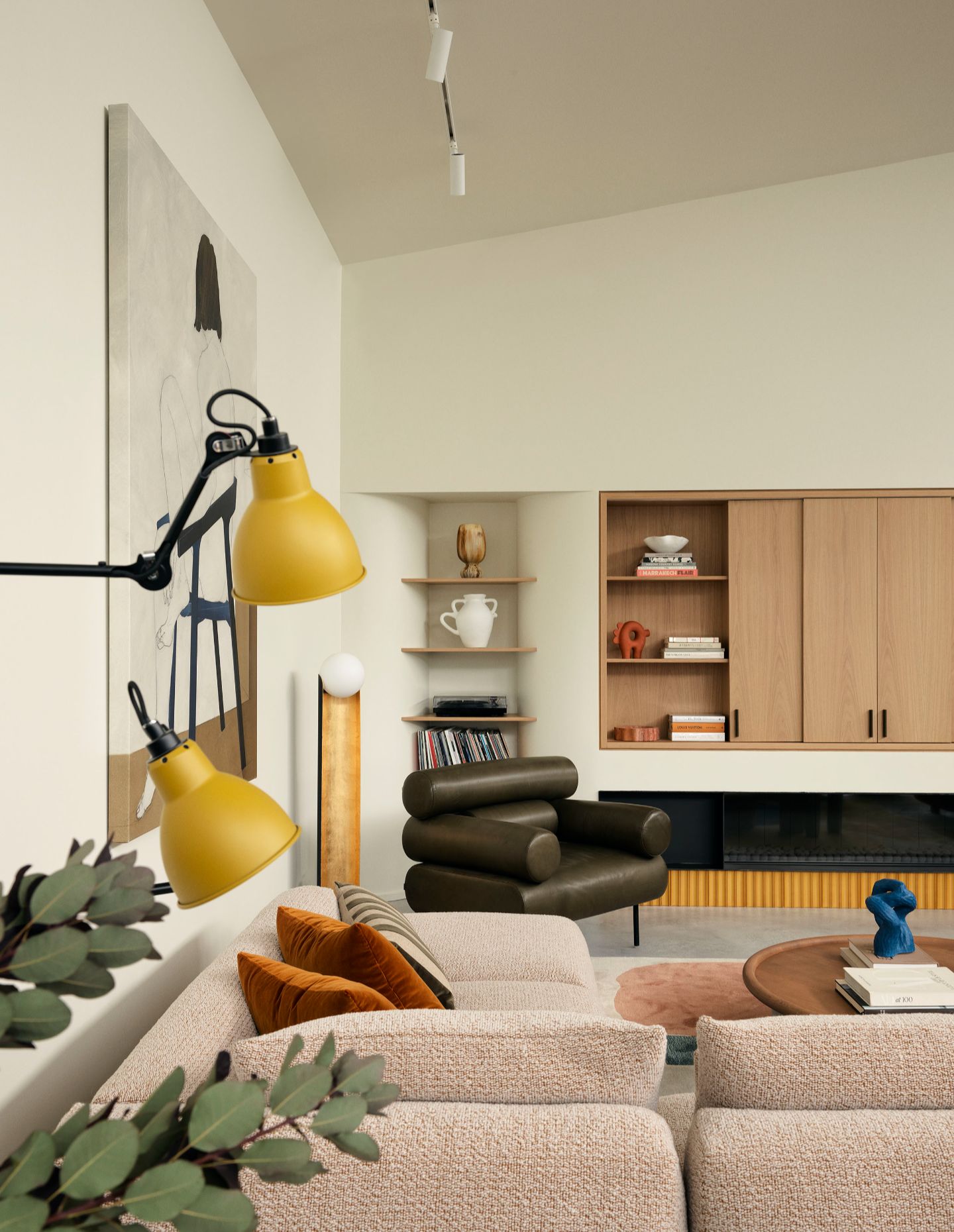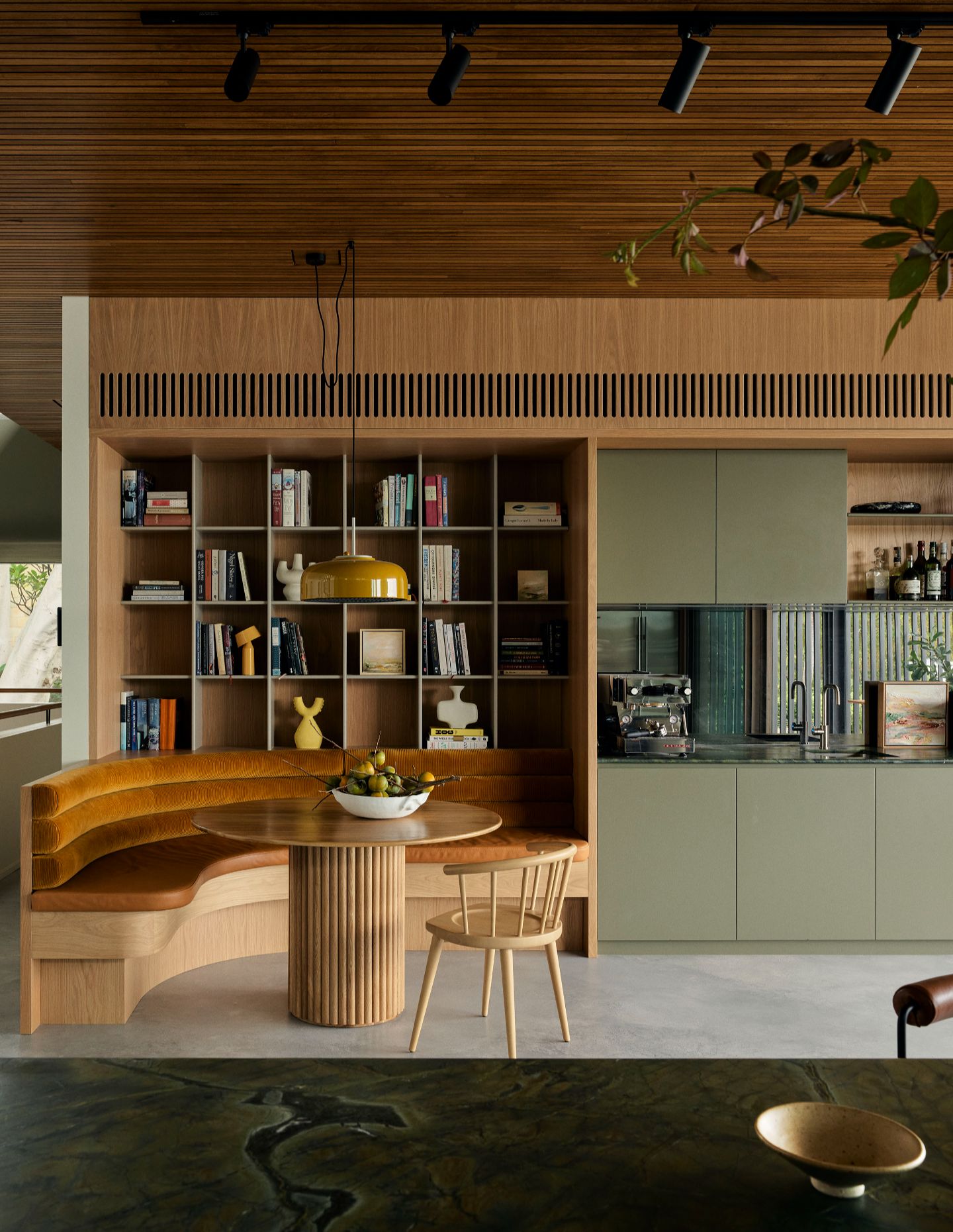 With family at the heart of the design, the kitchen was reconceptualised as the plan’s core – its reconfigured layout flowing directly onto the first-floor terrace. An open bar coffee station leads into a banquet corner seat, upholstered in velvet mustard for a sensory effect, balancing intimacy with spectacle.