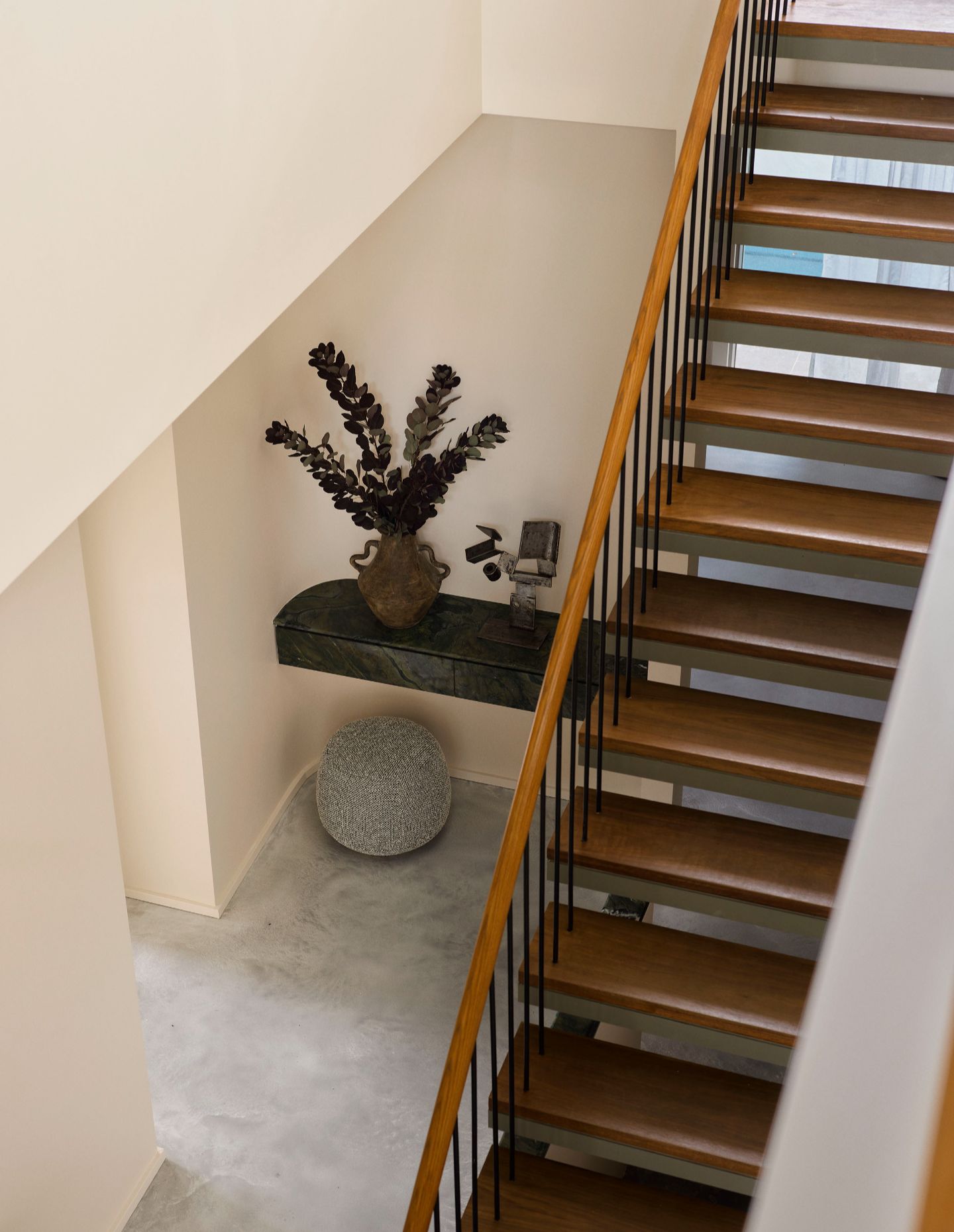Returning expats and avid entertainers, the clients approached Studio Johnston to update the interiors with practicality, outdoor connection and colour in mind. Having lived in the home for a year, they entered the design process with clear non-negotiables: to emphasise the harbour views, reconfigure the living spaces and outdoor terrace and update materiality, including new polished concrete-style flooring.