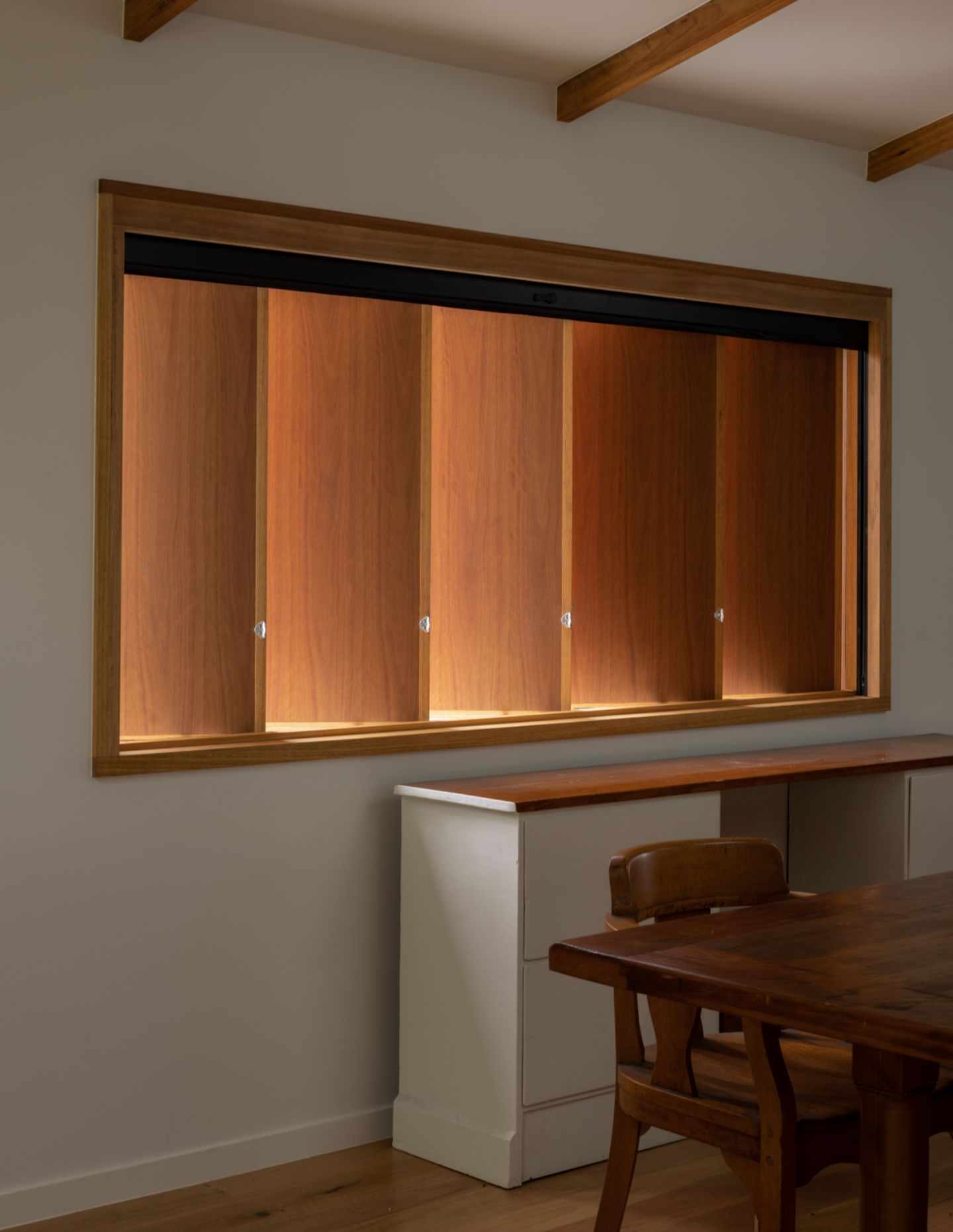 The existing roof trusses and low ceilings were reconfigured, with large skylight wells created within the existing structure to draw light and volume back into various spaces throughout the home. This undulating ceiling provides volumetric contrast when moving through the house, resulting in cosy bedrooms and expansive living areas.
