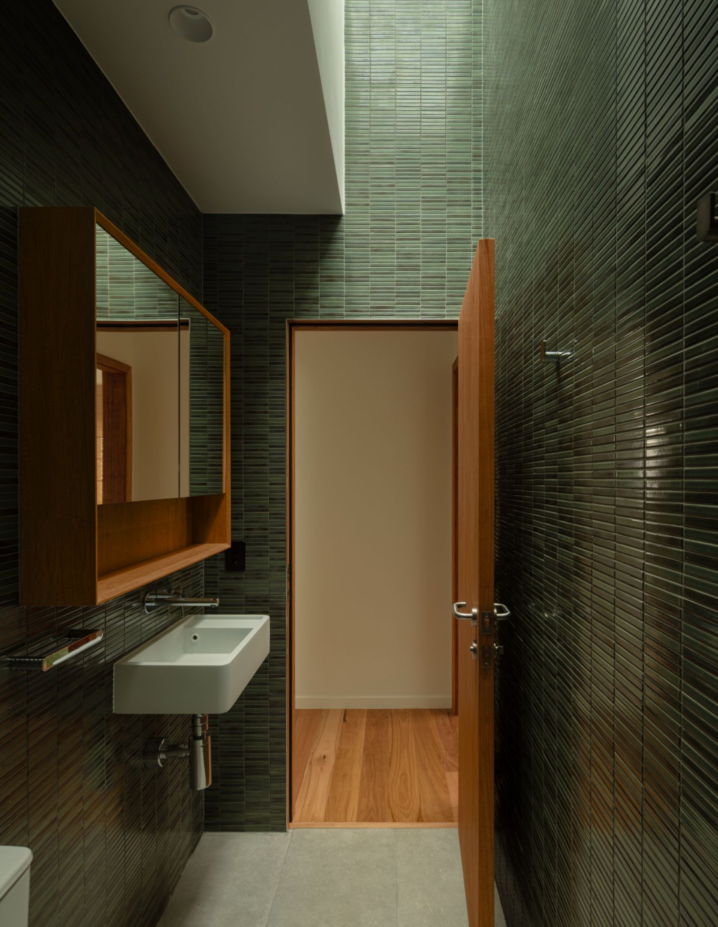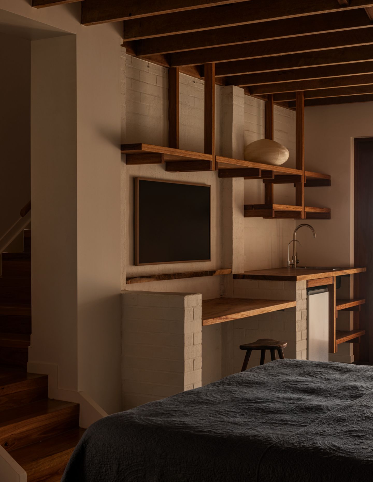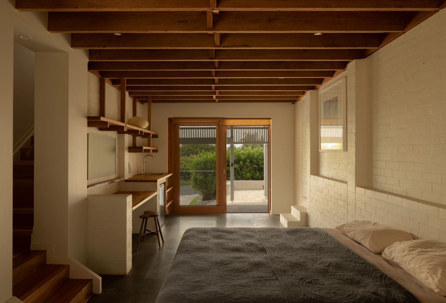Meanwhile, an uninspiring undercroft was converted into a light-filled, self-contained guest suite that celebrates the existing hardwood floor structure and brick bones. Materials and joinery elements are designed to complement and highlight the existing nature of the undercroft, and the craft involved in the original timber house.