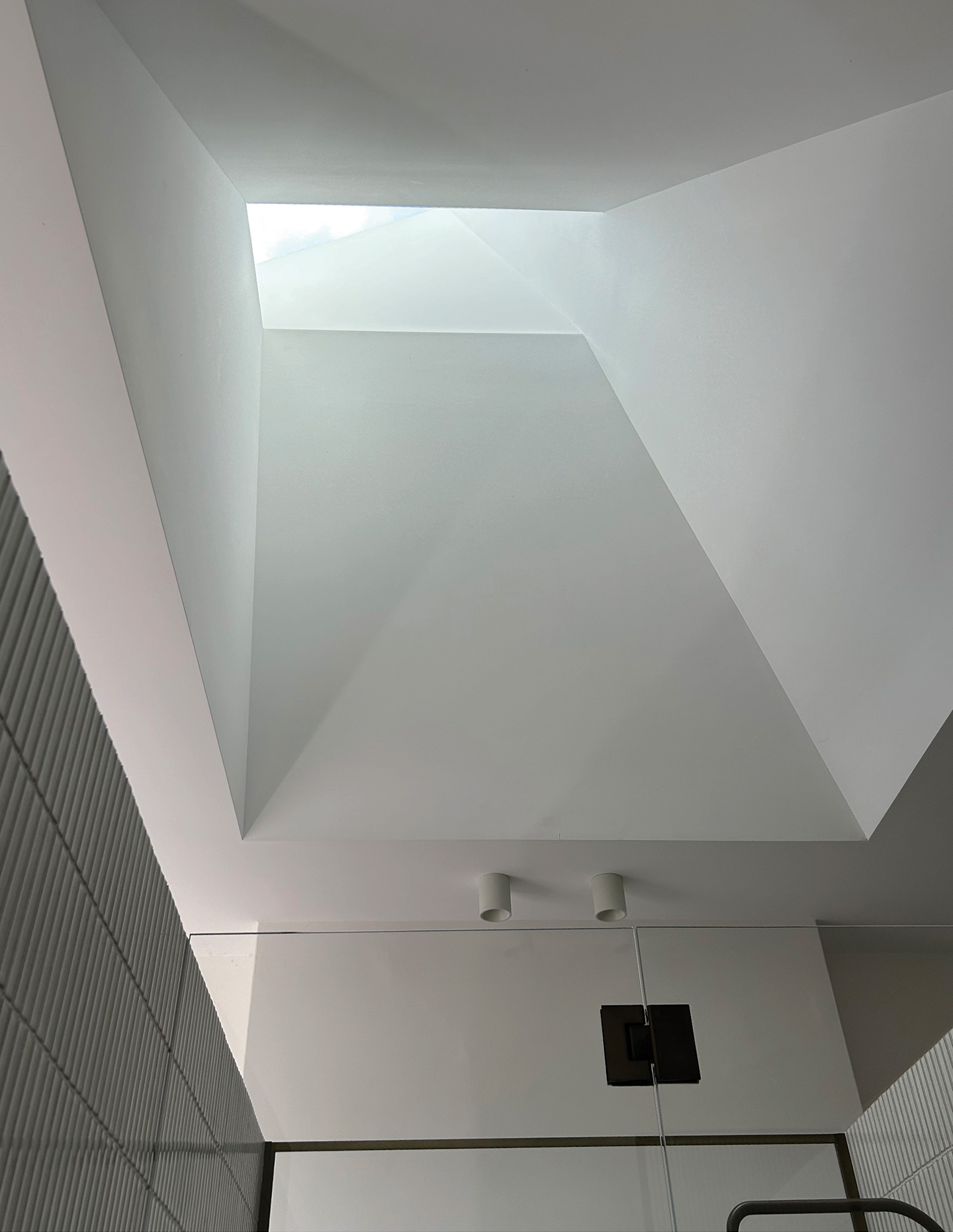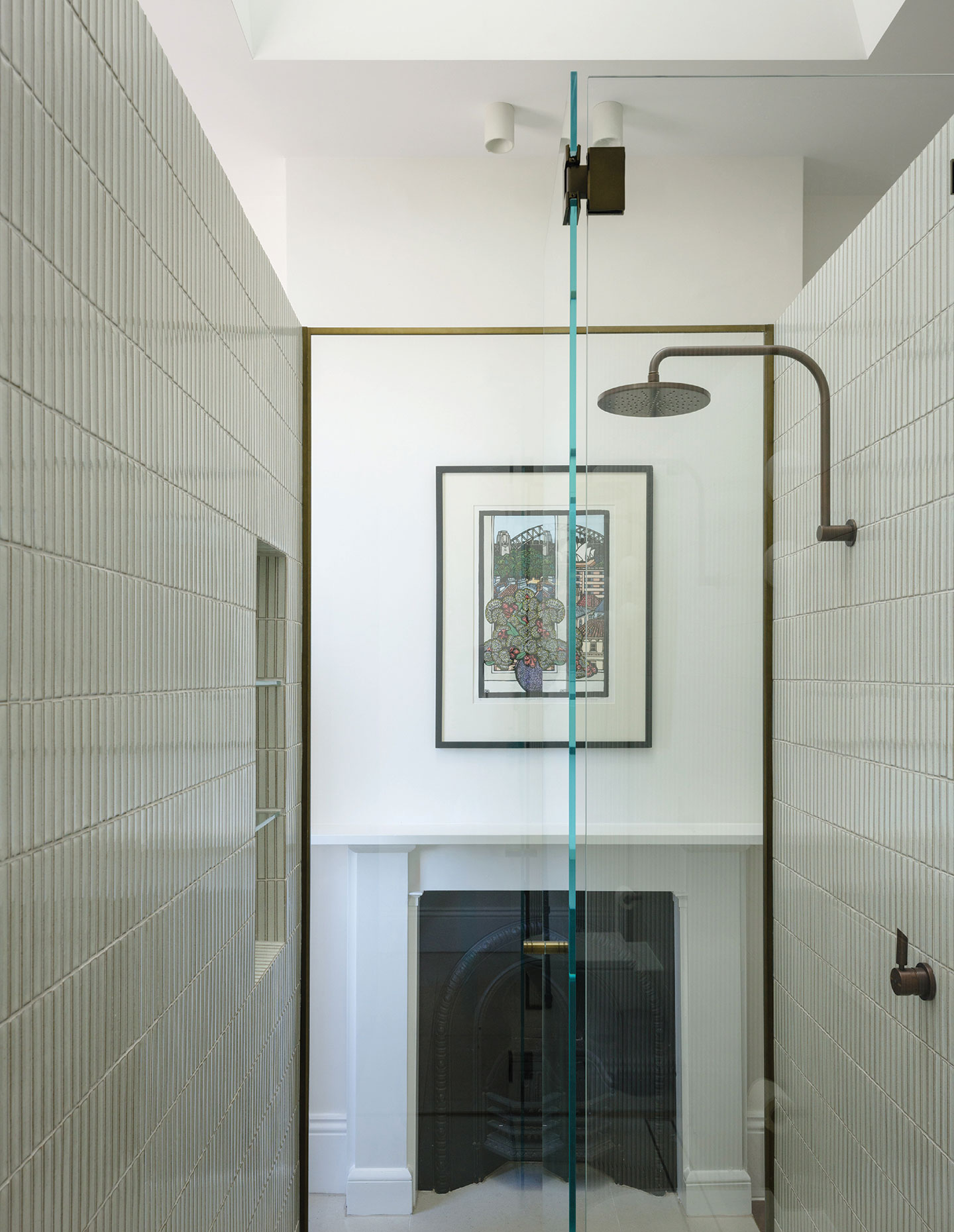 “It needed to be clearly connected to the main building yet deliberately in contrast with the existing fabric,” says Mitchell, who designed the addition as a contemporary representation of the single-storey rear kitchen add-on. “We extrapolated this low-pitched ceiling ‘lean-to’ with a dramatic soaring ceiling and expansive glazed openings resulting in a light-filled, striking volume.”
