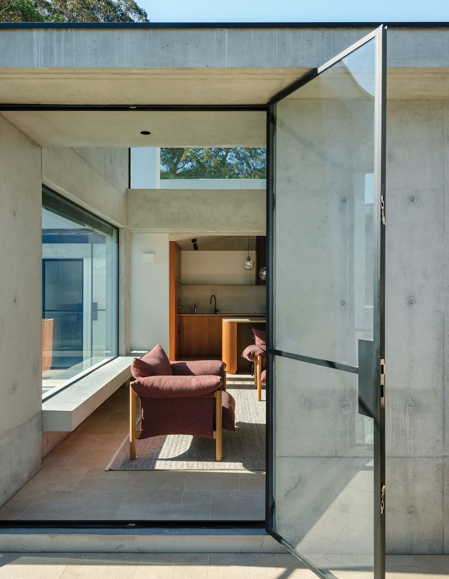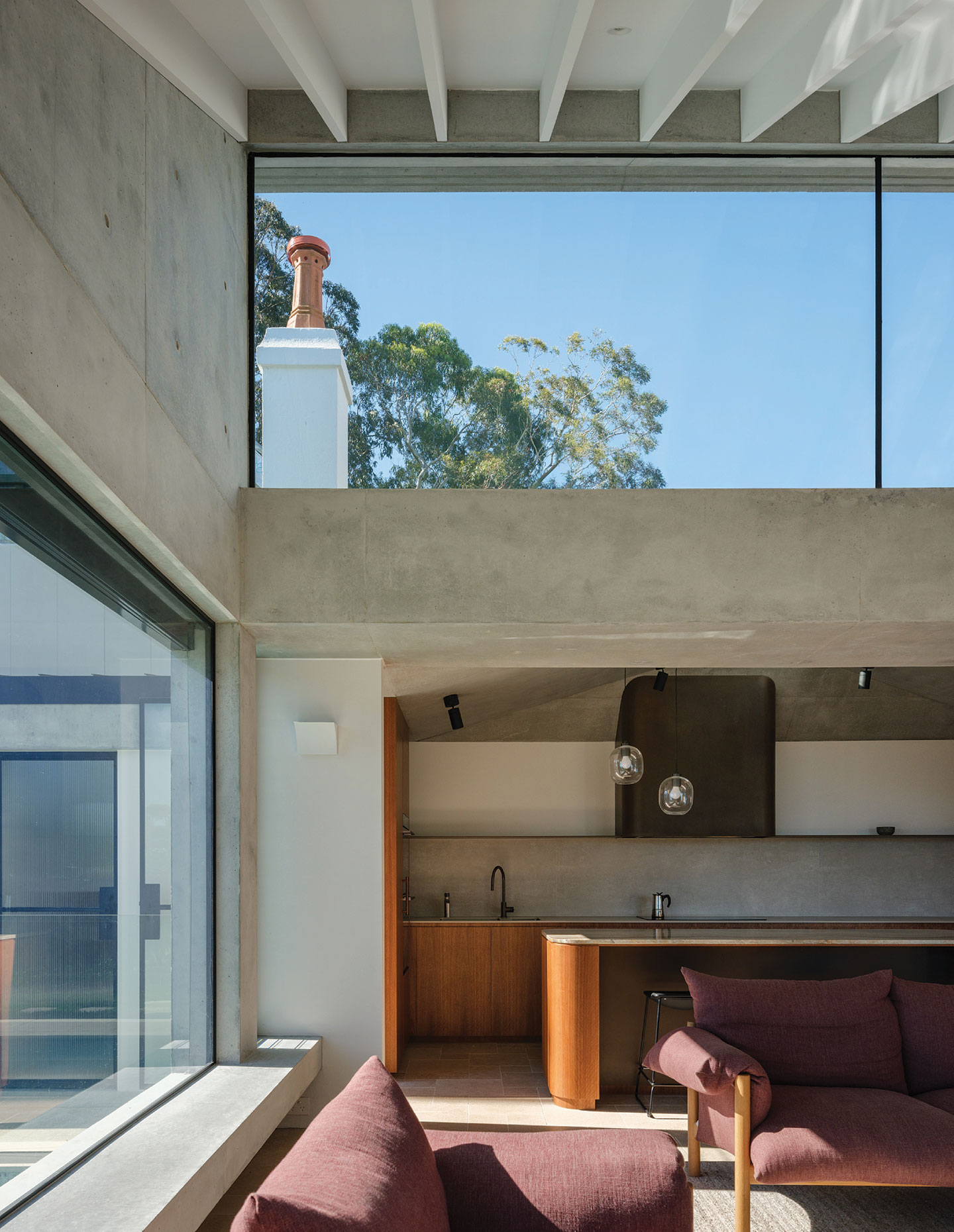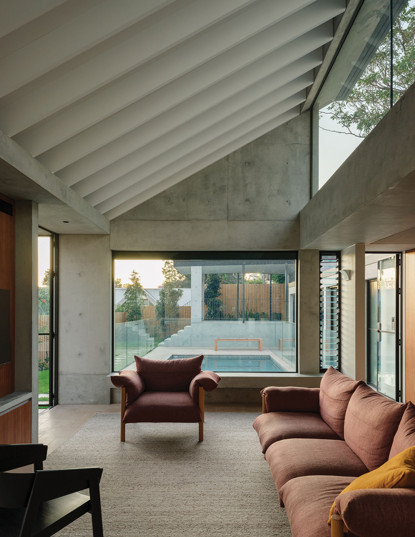 In the new open-plan kitchen and living space, all sections of the ground floor can be viewed, enhancing family connection with oversized windows that nestle in the concrete mass, so one family member can be preparing lunch while watching the children in the pool.