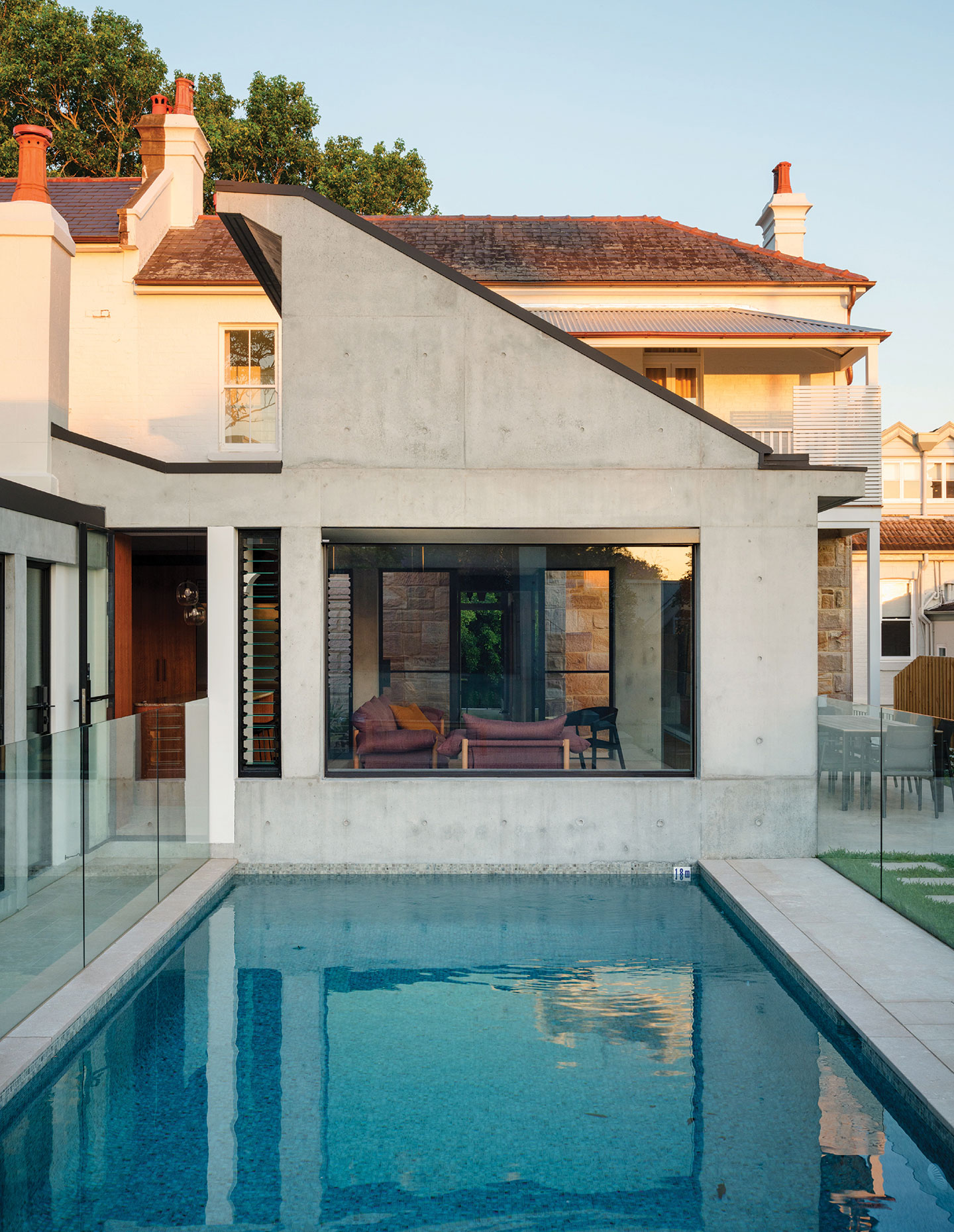 The bold, expressive addition complements the main house in a solid, concrete mass, yet remaining light, delicate and weightless. The contrast is celebrated in a minimalist expression of materiality, featuring concrete, steel, and glazing, allowing the grandeur of the original restored sandstone to remain the dominant visual aspect.