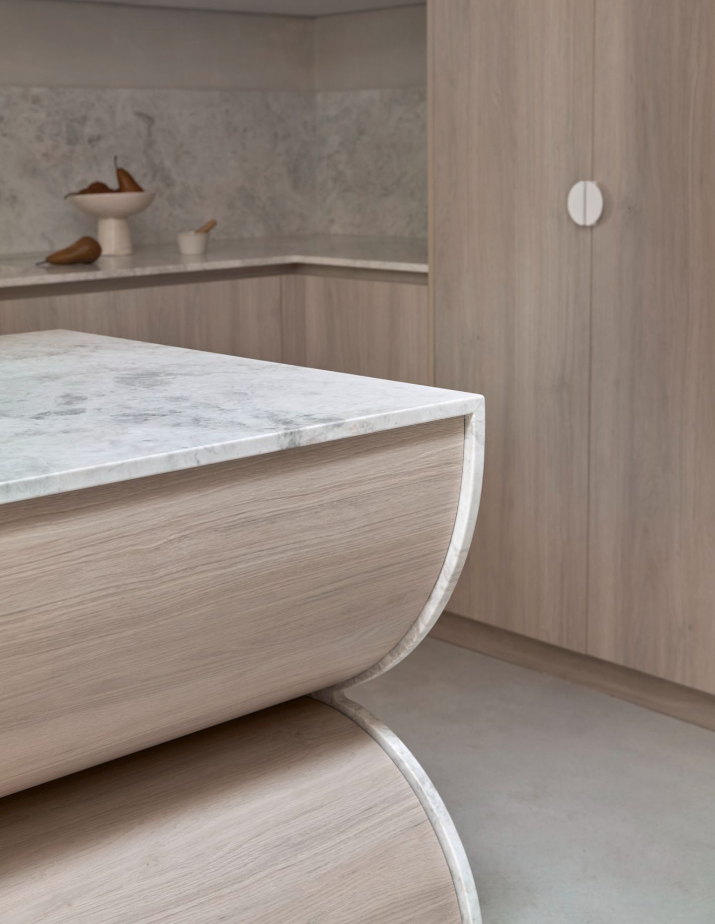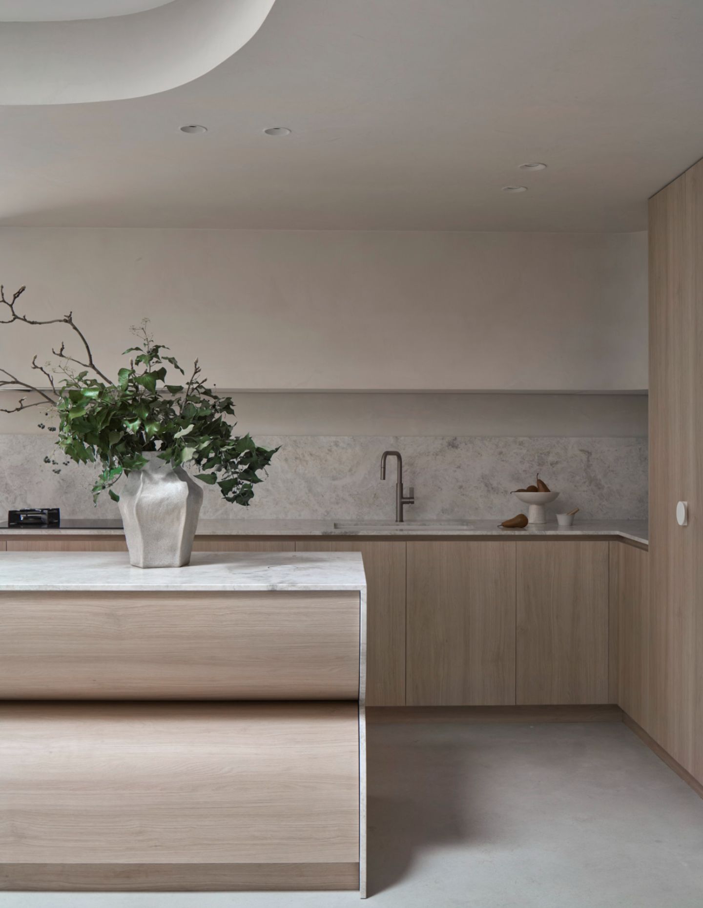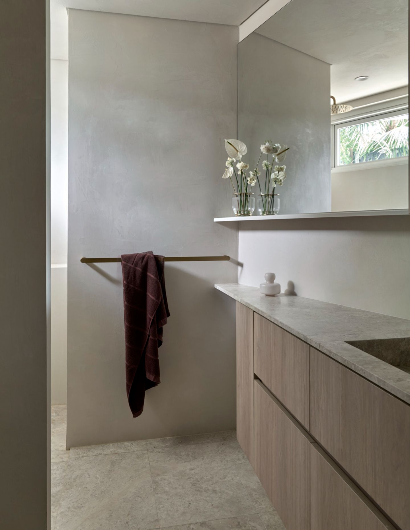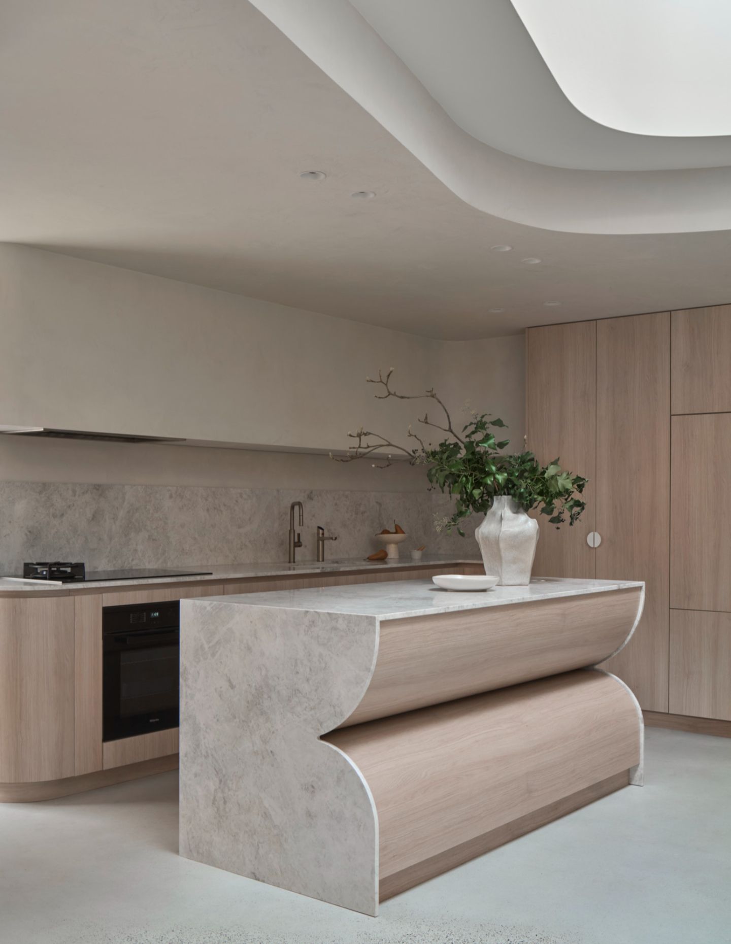 The curves return as a motif in the interior design – unexpectedly in the kitchen island and the stepped ceilings, to the more intimate details: the joinery, tapware and ambient lighting. They continue a fluidity that envelops, also seen in the rendered tactility continuing from the walls to the ceilings and again in the bathrooms, where floor-to-ceiling tiling creates immersive texture.